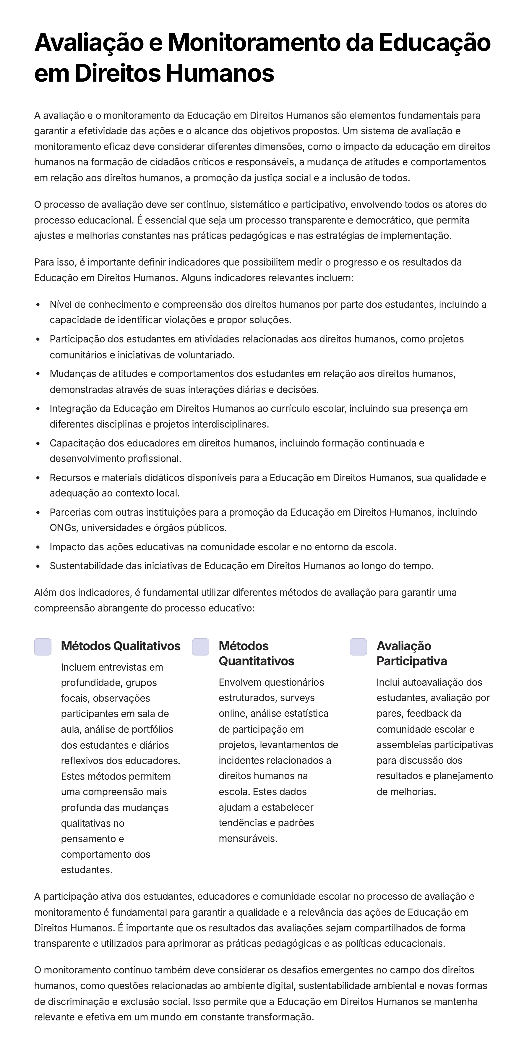Avaliação e Monitoramento da Educação em Direitos Humanos A avaliação e o monitoramento da Educação em Direitos Humanos são elementos fundamentais para garantir a efetividade das ações e o alcance dos objetivos propostos. Um sistema de avaliação e monitoramento eficaz deve considerar diferentes dimensões, como o impacto da educação em direitos humanos na formação de cidadãos críticos e responsáveis, a mudança de atitudes e comportamentos em relação aos direitos humanos, a promoção da justiça social e a inclusão de todos. O processo de avaliação deve ser contínuo, sistemático e participativo, envolvendo todos os atores do processo educacional. É essencial que seja um processo transparente e democrático, que permita ajustes e melhorias constantes nas práticas pedagógicas e nas estratégias de implementação. Para isso, é importante definir indicadores que possibilitem medir o progresso e os resultados da Educação em Direitos Humanos. Alguns indicadores relevantes incluem: Nível de conhecimento e compreensão dos direitos humanos por parte dos estudantes, incluindo a capacidade de identificar violações e propor soluções. Participação dos estudantes em atividades relacionadas aos direitos humanos, como projetos comunitários e iniciativas de voluntariado. Mudanças de atitudes e comportamentos dos estudantes em relação aos direitos humanos, demonstradas através de suas interações diárias e decisões. Integração da Educação em Direitos Humanos ao currículo escolar, incluindo sua presença em diferentes disciplinas e projetos interdisciplinares. Capacitação dos educadores em direitos humanos, incluindo formação continuada e desenvolvimento profissional. Recursos e materiais didáticos disponíveis para a Educação em Direitos Humanos, sua qualidade e adequação ao contexto local. Parcerias com outras instituições para a promoção da Educação em Direitos Humanos, incluindo ONGs, universidades e órgãos públicos. Impacto das ações educativas na comunidade escolar e no entorno da escola. Sustentabilidade das iniciativas de Educação em Direitos Humanos ao longo do tempo. Além dos indicadores, é fundamental utilizar diferentes métodos de avaliação para garantir uma compreensão abrangente do processo educativo: Métodos Qualitativos Incluem entrevistas em profundidade, grupos focais, observações participantes em sala de aula, análise de portfólios dos estudantes e diários reflexivos dos educadores. Estes métodos permitem uma compreensão mais profunda das mudanças qualitativas no pensamento e comportamento dos estudantes. Métodos Quantitativos Envolvem questionários estruturados, surveys online, análise estatística de participação em projetos, levantamentos de incidentes relacionados a direitos humanos na escola. Estes dados ajudam a estabelecer tendências e padrões mensuráveis. Avaliação Participativa Inclui autoavaliação dos estudantes, avaliação por pares, feedback da comunidade escolar e assembleias participativas para discussão dos resultados e planejamento de melhorias. A participação ativa dos estudantes, educadores e comunidade escolar no processo de avaliação e monitoramento é fundamental para garantir a qualidade e a relevância das ações de Educação em Direitos Humanos. É importante que os resultados das avaliações sejam compartilhados de forma transparente e utilizados para aprimorar as práticas pedagógicas e as políticas educacionais. O monitoramento contínuo também deve considerar os desafios emergentes no campo dos direitos humanos, como questões relacionadas ao ambiente digital, sustentabilidade ambiental e novas formas de discriminação e exclusão social. Isso permite que a Educação em Direitos Humanos se mantenha relevante e efetiva em um mundo em constante transformação.