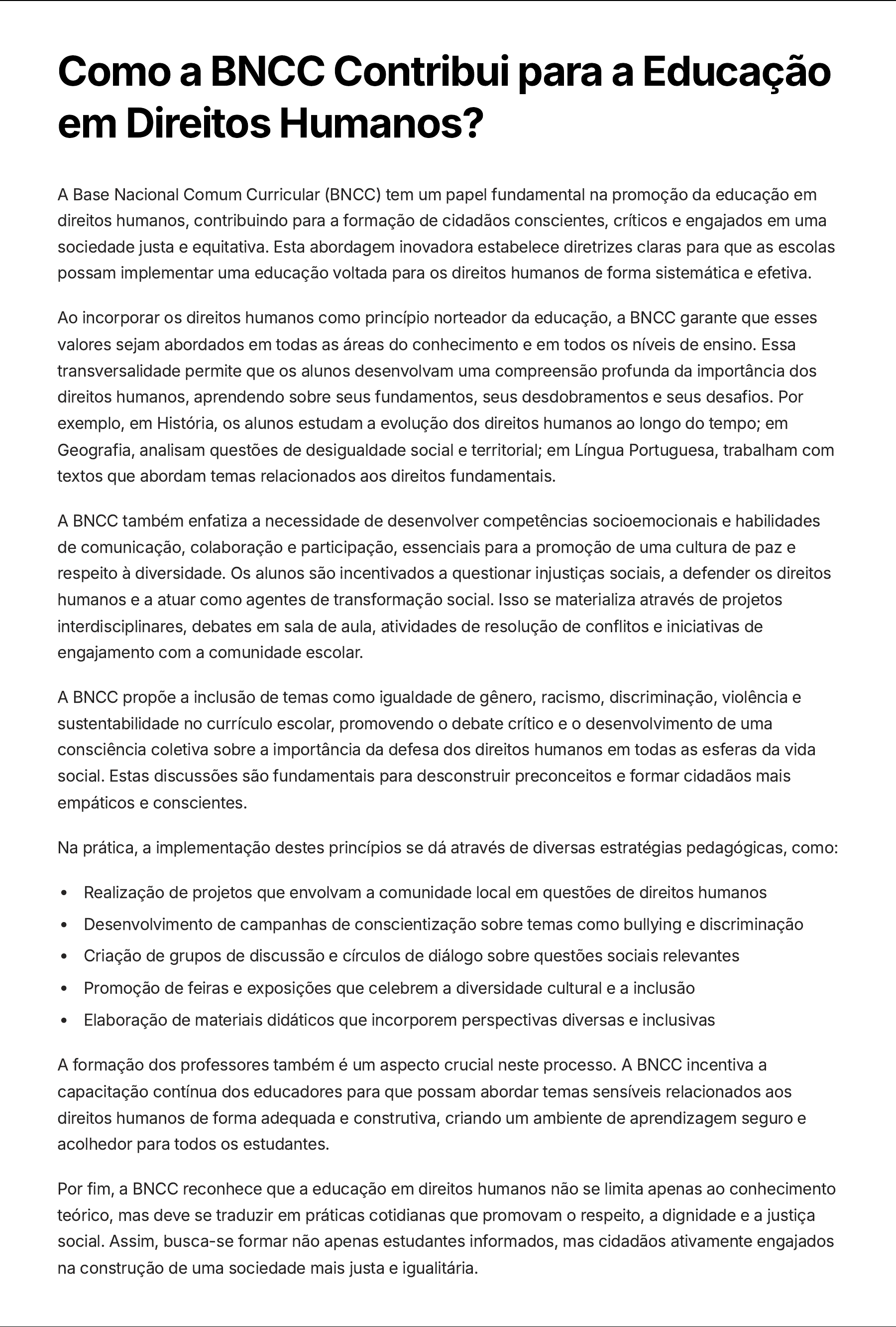 Como a BNCC Contribui para a Educação em Direitos Humanos? A Base Nacional Comum Curricular (BNCC) tem um papel fundamental na promoção da educação em direitos humanos, contribuindo para a formação de cidadãos conscientes, críticos e engajados em uma sociedade justa e equitativa. Esta abordagem inovadora estabelece diretrizes claras para que as escolas possam implementar uma educação voltada para os direitos humanos de forma sistemática e efetiva. Ao incorporar os direitos humanos como princípio norteador da educação, a BNCC garante que esses valores sejam abordados em todas as áreas do conhecimento e em todos os níveis de ensino. Essa transversalidade permite que os alunos desenvolvam uma compreensão profunda da importância dos direitos humanos, aprendendo sobre seus fundamentos, seus desdobramentos e seus desafios. Por exemplo, em História, os alunos estudam a evolução dos direitos humanos ao longo do tempo; em Geografia, analisam questões de desigualdade social e territorial; em Língua Portuguesa, trabalham com textos que abordam temas relacionados aos direitos fundamentais. A BNCC também enfatiza a necessidade de desenvolver competências socioemocionais e habilidades de comunicação, colaboração e participação, essenciais para a promoção de uma cultura de paz e respeito à diversidade. Os alunos são incentivados a questionar injustiças sociais, a defender os direitos humanos e a atuar como agentes de transformação social. Isso se materializa através de projetos interdisciplinares, debates em sala de aula, atividades de resolução de conflitos e iniciativas de engajamento com a comunidade escolar. A BNCC propõe a inclusão de temas como igualdade de gênero, racismo, discriminação, violência e sustentabilidade no currículo escolar, promovendo o debate crítico e o desenvolvimento de uma consciência coletiva sobre a importância da defesa dos direitos humanos em todas as esferas da vida social. Estas discussões são fundamentais para desconstruir preconceitos e formar cidadãos mais empáticos e conscientes. Na prática, a implementação destes princípios se dá através de diversas estratégias pedagógicas, como: Realização de projetos que envolvam a comunidade local em questões de direitos humanos Desenvolvimento de campanhas de conscientização sobre temas como bullying e discriminação Criação de grupos de discussão e círculos de diálogo sobre questões sociais relevantes Promoção de feiras e exposições que celebrem a diversidade cultural e a inclusão Elaboração de materiais didáticos que incorporem perspectivas diversas e inclusivas A formação dos professores também é um aspecto crucial neste processo. A BNCC incentiva a capacitação contínua dos educadores para que possam abordar temas sensíveis relacionados aos direitos humanos de forma adequada e construtiva, criando um ambiente de aprendizagem seguro e acolhedor para todos os estudantes. Por fim, a BNCC reconhece que a educação em direitos humanos não se limita apenas ao conhecimento teórico, mas deve se traduzir em práticas cotidianas que promovam o respeito, a dignidade e a justiça social. Assim, busca-se formar não apenas estudantes informados, mas cidadãos ativamente engajados na construção de uma sociedade mais justa e igualitária.
