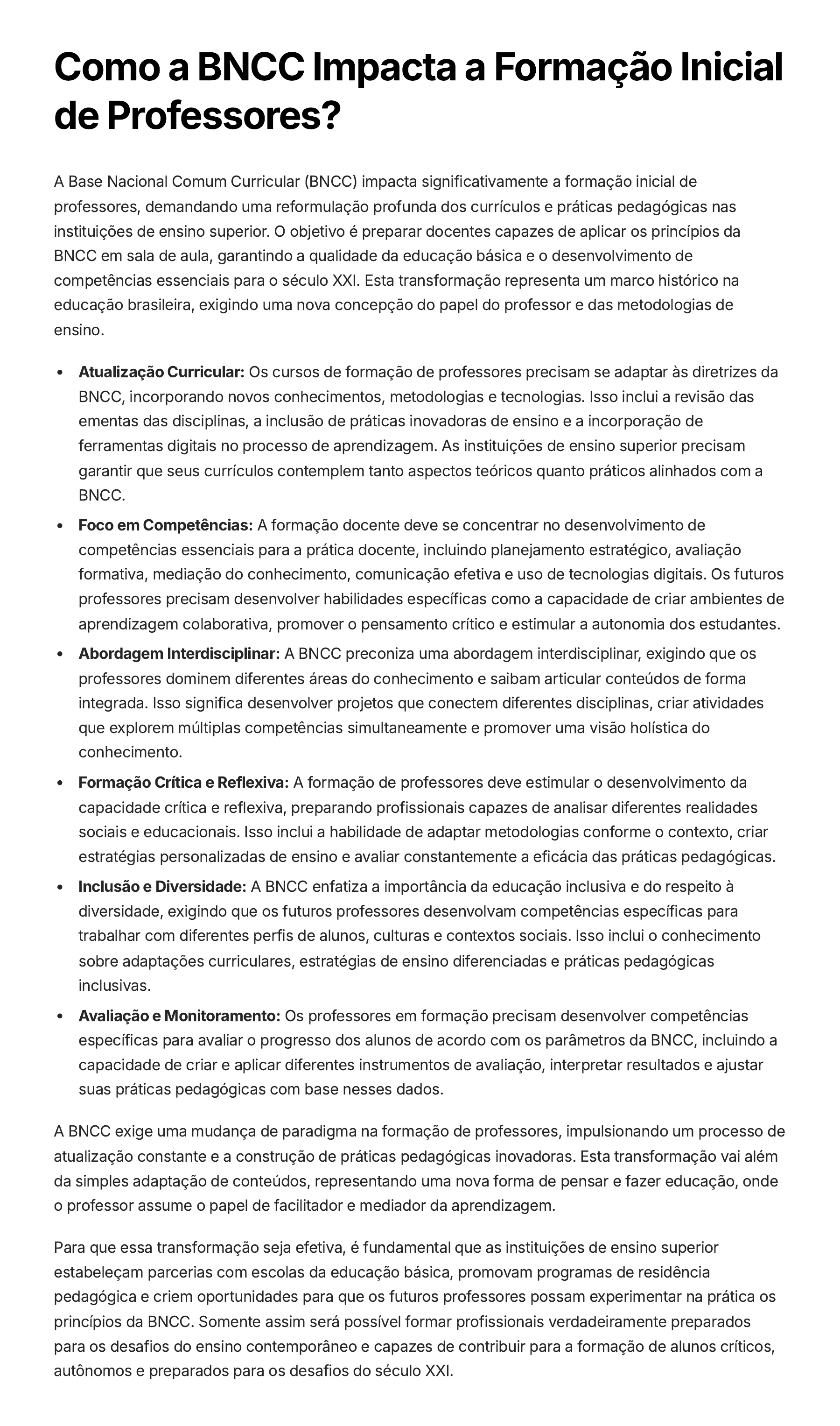 Como a BNCC Impacta a Formação Inicial de Professores? A Base Nacional Comum Curricular (BNCC) impacta significativamente a formação inicial de professores, demandando uma reformulação profunda dos currículos e práticas pedagógicas nas instituições de ensino superior. O objetivo é preparar docentes capazes de aplicar os princípios da BNCC em sala de aula, garantindo a qualidade da educação básica e o desenvolvimento de competências essenciais para o século XXI. Esta transformação representa um marco histórico na educação brasileira, exigindo uma nova concepção do papel do professor e das metodologias de ensino. Atualização Curricular: Os cursos de formação de professores precisam se adaptar às diretrizes da BNCC, incorporando novos conhecimentos, metodologias e tecnologias. Isso inclui a revisão das ementas das disciplinas, a inclusão de práticas inovadoras de ensino e a incorporação de ferramentas digitais no processo de aprendizagem. As instituições de ensino superior precisam garantir que seus currículos contemplem tanto aspectos teóricos quanto práticos alinhados com a BNCC. Foco em Competências: A formação docente deve se concentrar no desenvolvimento de competências essenciais para a prática docente, incluindo planejamento estratégico, avaliação formativa, mediação do conhecimento, comunicação efetiva e uso de tecnologias digitais. Os futuros professores precisam desenvolver habilidades específicas como a capacidade de criar ambientes de aprendizagem colaborativa, promover o pensamento crítico e estimular a autonomia dos estudantes. Abordagem Interdisciplinar: A BNCC preconiza uma abordagem interdisciplinar, exigindo que os professores dominem diferentes áreas do conhecimento e saibam articular conteúdos de forma integrada. Isso significa desenvolver projetos que conectem diferentes disciplinas, criar atividades que explorem múltiplas competências simultaneamente e promover uma visão holística do conhecimento. Formação Crítica e Reflexiva: A formação de professores deve estimular o desenvolvimento da capacidade crítica e reflexiva, preparando profissionais capazes de analisar diferentes realidades sociais e educacionais. Isso inclui a habilidade de adaptar metodologias conforme o contexto, criar estratégias personalizadas de ensino e avaliar constantemente a eficácia das práticas pedagógicas. Inclusão e Diversidade: A BNCC enfatiza a importância da educação inclusiva e do respeito à diversidade, exigindo que os futuros professores desenvolvam competências específicas para trabalhar com diferentes perfis de alunos, culturas e contextos sociais. Isso inclui o conhecimento sobre adaptações curriculares, estratégias de ensino diferenciadas e práticas pedagógicas inclusivas. Avaliação e Monitoramento: Os professores em formação precisam desenvolver competências específicas para avaliar o progresso dos alunos de acordo com os parâmetros da BNCC, incluindo a capacidade de criar e aplicar diferentes instrumentos de avaliação, interpretar resultados e ajustar suas práticas pedagógicas com base nesses dados. A BNCC exige uma mudança de paradigma na formação de professores, impulsionando um processo de atualização constante e a construção de práticas pedagógicas inovadoras. Esta transformação vai além da simples adaptação de conteúdos, representando uma nova forma de pensar e fazer educação, onde o professor assume o papel de facilitador e mediador da aprendizagem. Para que essa transformação seja efetiva, é fundamental que as instituições de ensino superior estabeleçam parcerias com escolas da educação básica, promovam programas de residência pedagógica e criem oportunidades para que os futuros professores possam experimentar na prática os princípios da BNCC. Somente assim será possível formar profissionais verdadeiramente preparados para os desafios do ensino contemporâneo e capazes de contribuir para a formação de alunos críticos, autônomos e preparados para os desafios do século XXI.
