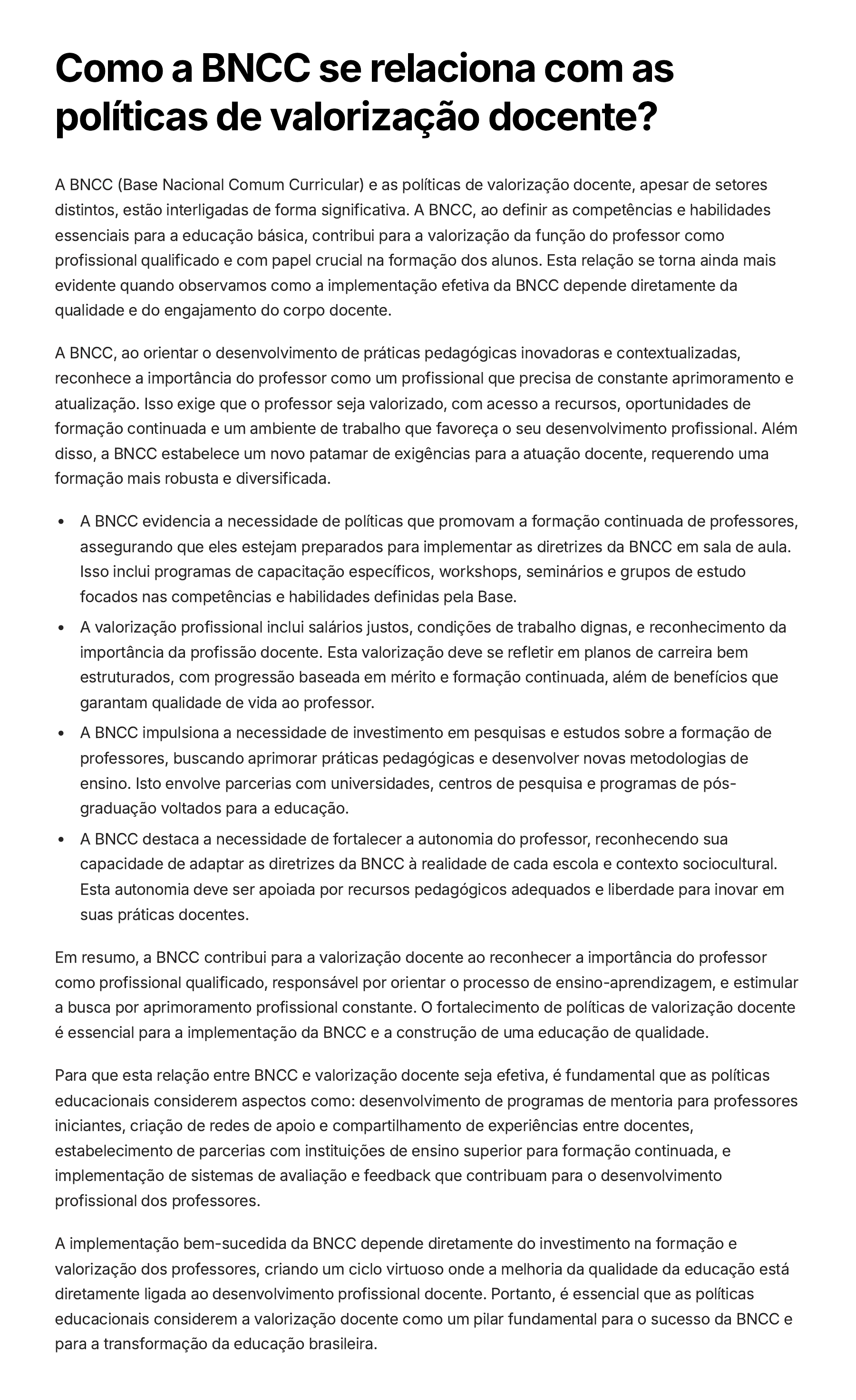 Como a BNCC se relaciona com as políticas de valorização docente? A BNCC (Base Nacional Comum Curricular) e as políticas de valorização docente, apesar de setores distintos, estão interligadas de forma significativa. A BNCC, ao definir as competências e habilidades essenciais para a educação básica, contribui para a valorização da função do professor como profissional qualificado e com papel crucial na formação dos alunos. Esta relação se torna ainda mais evidente quando observamos como a implementação efetiva da BNCC depende diretamente da qualidade e do engajamento do corpo docente. A BNCC, ao orientar o desenvolvimento de práticas pedagógicas inovadoras e contextualizadas, reconhece a importância do professor como um profissional que precisa de constante aprimoramento e atualização. Isso exige que o professor seja valorizado, com acesso a recursos, oportunidades de formação continuada e um ambiente de trabalho que favoreça o seu desenvolvimento profissional. Além disso, a BNCC estabelece um novo patamar de exigências para a atuação docente, requerendo uma formação mais robusta e diversificada. A BNCC evidencia a necessidade de políticas que promovam a formação continuada de professores, assegurando que eles estejam preparados para implementar as diretrizes da BNCC em sala de aula. Isso inclui programas de capacitação específicos, workshops, seminários e grupos de estudo focados nas competências e habilidades definidas pela Base. A valorização profissional inclui salários justos, condições de trabalho dignas, e reconhecimento da importância da profissão docente. Esta valorização deve se refletir em planos de carreira bem estruturados, com progressão baseada em mérito e formação continuada, além de benefícios que garantam qualidade de vida ao professor. A BNCC impulsiona a necessidade de investimento em pesquisas e estudos sobre a formação de professores, buscando aprimorar práticas pedagógicas e desenvolver novas metodologias de ensino. Isto envolve parcerias com universidades, centros de pesquisa e programas de pós- graduação voltados para a educação. A BNCC destaca a necessidade de fortalecer a autonomia do professor, reconhecendo sua capacidade de adaptar as diretrizes da BNCC à realidade de cada escola e contexto sociocultural. Esta autonomia deve ser apoiada por recursos pedagógicos adequados e liberdade para inovar em suas práticas docentes. Em resumo, a BNCC contribui para a valorização docente ao reconhecer a importância do professor como profissional qualificado, responsável por orientar o processo de ensino-aprendizagem, e estimular a busca por aprimoramento profissional constante. O fortalecimento de políticas de valorização docente é essencial para a implementação da BNCC e a construção de uma educação de qualidade. Para que esta relação entre BNCC e valorização docente seja efetiva, é fundamental que as políticas educacionais considerem aspectos como: desenvolvimento de programas de mentoria para professores iniciantes, criação de redes de apoio e compartilhamento de experiências entre docentes, estabelecimento de parcerias com instituições de ensino superior para formação continuada, e implementação de sistemas de avaliação e feedback que contribuam para o desenvolvimento profissional dos professores. A implementação bem-sucedida da BNCC depende diretamente do investimento na formação e valorização dos professores, criando um ciclo virtuoso onde a melhoria da qualidade da educação está diretamente ligada ao desenvolvimento profissional docente. Portanto, é essencial que as políticas educacionais considerem a valorização docente como um pilar fundamental para o sucesso da BNCC e para a transformação da educação brasileira.
