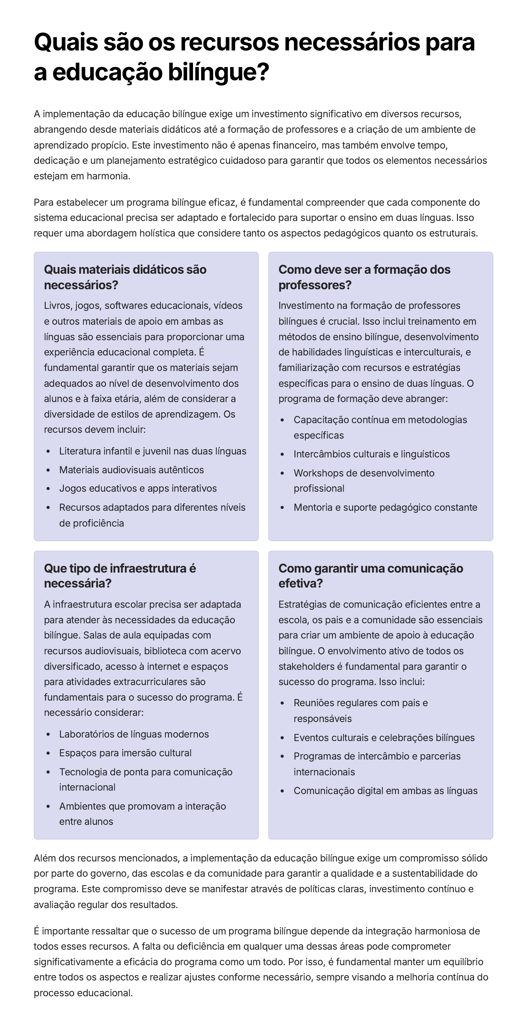Quais são os recursos necessários para a educação bilíngue? A implementação da educação bilíngue exige um investimento significativo em diversos recursos, abrangendo desde materiais didáticos até a formação de professores e a criação de um ambiente de aprendizado propício. Este investimento não é apenas financeiro, mas também envolve tempo, dedicação e um planejamento estratégico cuidadoso para garantir que todos os elementos necessários estejam em harmonia. Para estabelecer um programa bilíngue eficaz, é fundamental compreender que cada componente do sistema educacional precisa ser adaptado e fortalecido para suportar o ensino em duas línguas. Isso requer uma abordagem holística que considere tanto os aspectos pedagógicos quanto os estruturais. Quais materiais didáticos são necessários? Livros, jogos, softwares educacionais, vídeos e outros materiais de apoio em ambas as línguas são essenciais para proporcionar uma experiência educacional completa. É fundamental garantir que os materiais sejam adequados ao nível de desenvolvimento dos alunos e à faixa etária, além de considerar a diversidade de estilos de aprendizagem. Os recursos devem incluir: Literatura infantil e juvenil nas duas línguas Materiais audiovisuais autênticos Jogos educativos e apps interativos Recursos adaptados para diferentes níveis de proficiência Como deve ser a formação dos professores? Investimento na formação de professores bilíngues é crucial. Isso inclui treinamento em métodos de ensino bilíngue, desenvolvimento de habilidades linguísticas e interculturais, e familiarização com recursos e estratégias específicas para o ensino de duas línguas. O programa de formação deve abranger: Capacitação contínua em metodologias específicas Intercâmbios culturais e linguísticos Workshops de desenvolvimento profissional Mentoria e suporte pedagógico constante Que tipo de infraestrutura é necessária? A infraestrutura escolar precisa ser adaptada para atender às necessidades da educação bilíngue. Salas de aula equipadas com recursos audiovisuais, biblioteca com acervo diversificado, acesso à internet e espaços para atividades extracurriculares são fundamentais para o sucesso do programa. É necessário considerar: Laboratórios de línguas modernos Espaços para imersão cultural Tecnologia de ponta para comunicação internacional Ambientes que promovam a interação entre alunos Como garantir uma comunicação efetiva? Estratégias de comunicação eficientes entre a escola, os pais e a comunidade são essenciais para criar um ambiente de apoio à educação bilíngue. O envolvimento ativo de todos os stakeholders é fundamental para garantir o sucesso do programa. Isso inclui: Reuniões regulares com pais e responsáveis Eventos culturais e celebrações bilíngues Programas de intercâmbio e parcerias internacionais Comunicação digital em ambas as línguas Além dos recursos mencionados, a implementação da educação bilíngue exige um compromisso sólido por parte do governo, das escolas e da comunidade para garantir a qualidade e a sustentabilidade do programa. Este compromisso deve se manifestar através de políticas claras, investimento contínuo e avaliação regular dos resultados. É importante ressaltar que o sucesso de um programa bilíngue depende da integração harmoniosa de todos esses recursos. A falta ou deficiência em qualquer uma dessas áreas pode comprometer significativamente a eficácia do programa como um todo. Por isso, é fundamental manter um equilíbrio entre todos os aspectos e realizar ajustes conforme necessário, sempre visando a melhoria contínua do processo educacional.