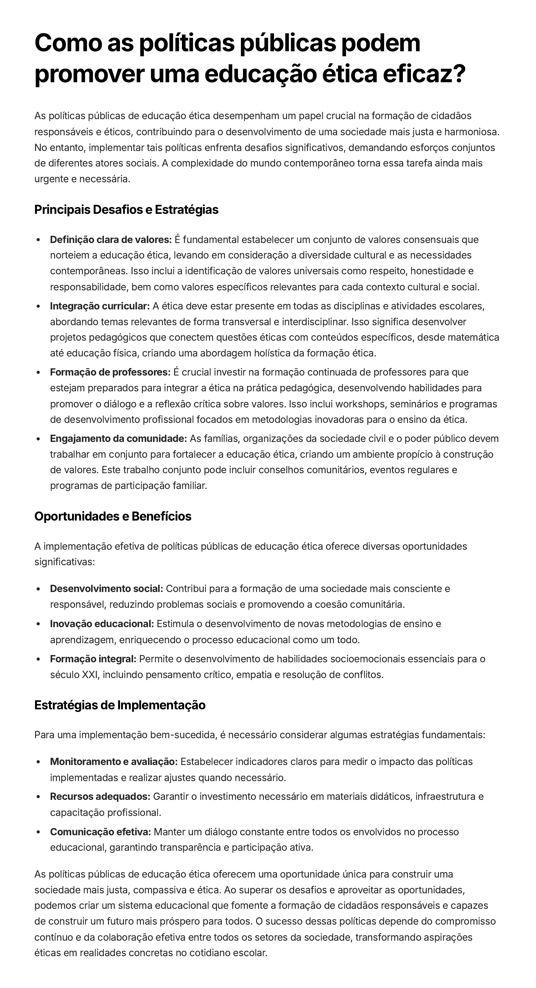Como as políticas públicas podem promover uma educação ética eficaz? As políticas públicas de educação ética desempenham um papel crucial na formação de cidadãos responsáveis e éticos, contribuindo para o desenvolvimento de uma sociedade mais justa e harmoniosa. No entanto, implementar tais políticas enfrenta desafios significativos, demandando esforços conjuntos de diferentes atores sociais. A complexidade do mundo contemporâneo torna essa tarefa ainda mais urgente e necessária. Principais Desafios e Estratégias Definição clara de valores: É fundamental estabelecer um conjunto de valores consensuais que norteiem a educação ética, levando em consideração a diversidade cultural e as necessidades contemporâneas. Isso inclui a identificação de valores universais como respeito, honestidade e responsabilidade, bem como valores específicos relevantes para cada contexto cultural e social. Integração curricular: A ética deve estar presente em todas as disciplinas e atividades escolares, abordando temas relevantes de forma transversal e interdisciplinar. Isso significa desenvolver projetos pedagógicos que conectem questões éticas com conteúdos específicos, desde matemática até educação física, criando uma abordagem holística da formação ética. Formação de professores: É crucial investir na formação continuada de professores para que estejam preparados para integrar a ética na prática pedagógica, desenvolvendo habilidades para promover o diálogo e a reflexão crítica sobre valores. Isso inclui workshops, seminários e programas de desenvolvimento profissional focados em metodologias inovadoras para o ensino da ética. Engajamento da comunidade: As famílias, organizações da sociedade civil e o poder público devem trabalhar em conjunto para fortalecer a educação ética, criando um ambiente propício à construção de valores. Este trabalho conjunto pode incluir conselhos comunitários, eventos regulares e programas de participação familiar. Oportunidades e Benefícios A implementação efetiva de políticas públicas de educação ética oferece diversas oportunidades significativas: Desenvolvimento social: Contribui para a formação de uma sociedade mais consciente e responsável, reduzindo problemas sociais e promovendo a coesão comunitária. Inovação educacional: Estimula o desenvolvimento de novas metodologias de ensino e aprendizagem, enriquecendo o processo educacional como um todo. Formação integral: Permite o desenvolvimento de habilidades socioemocionais essenciais para o século XXI, incluindo pensamento crítico, empatia e resolução de conflitos. Estratégias de Implementação Para uma implementação bem-sucedida, é necessário considerar algumas estratégias fundamentais: Monitoramento e avaliação: Estabelecer indicadores claros para medir o impacto das políticas implementadas e realizar ajustes quando necessário. Recursos adequados: Garantir o investimento necessário em materiais didáticos, infraestrutura e capacitação profissional. Comunicação efetiva: Manter um diálogo constante entre todos os envolvidos no processo educacional, garantindo transparência e participação ativa. As políticas públicas de educação ética oferecem uma oportunidade única para construir uma sociedade mais justa, compassiva e ética. Ao superar os desafios e aproveitar as oportunidades, podemos criar um sistema educacional que fomente a formação de cidadãos responsáveis e capazes de construir um futuro mais próspero para todos. O sucesso dessas políticas depende do compromisso contínuo e da colaboração efetiva entre todos os setores da sociedade, transformando aspirações éticas em realidades concretas no cotidiano escolar.