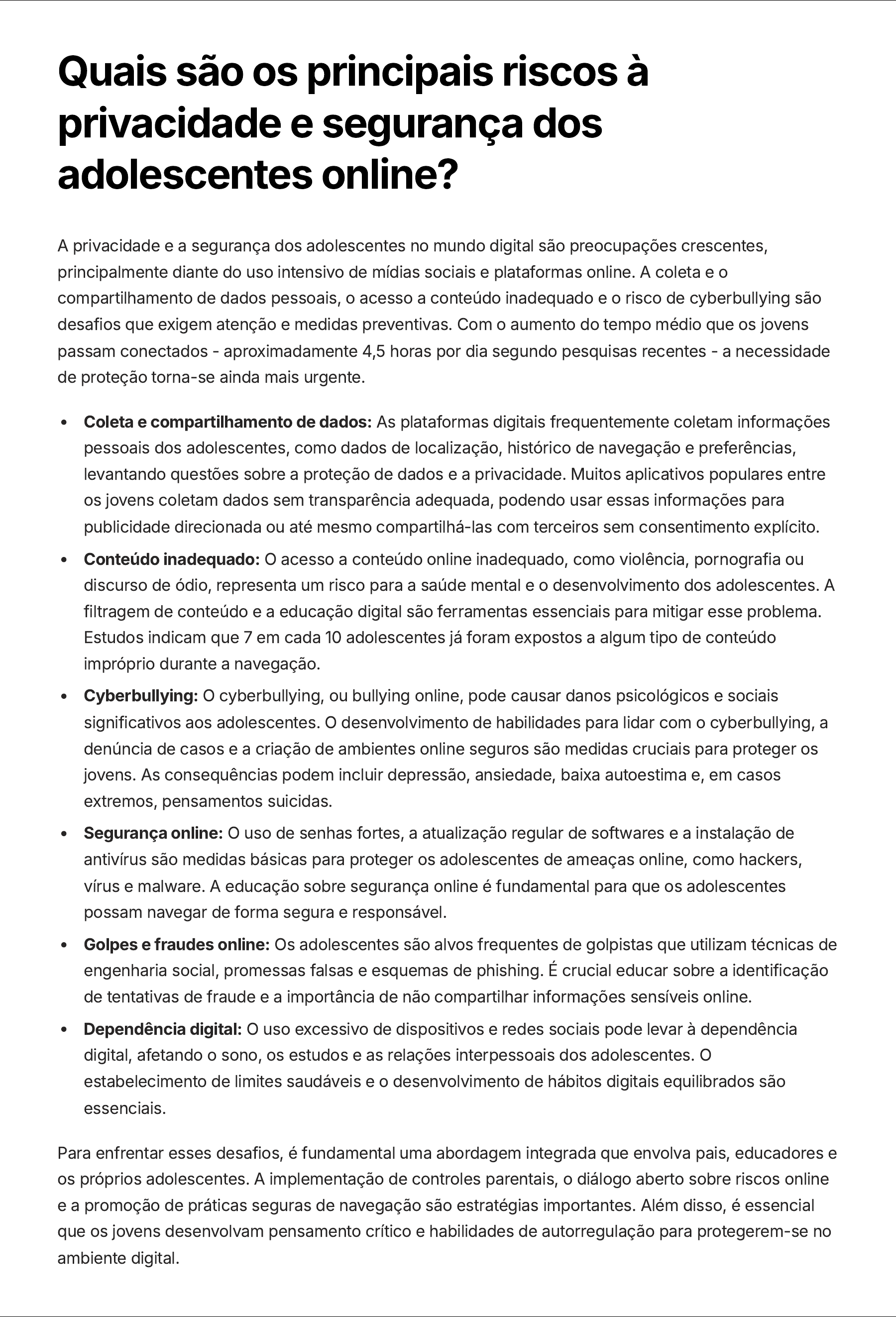 Quais são os principais riscos à privacidade e segurança dos adolescentes online? A privacidade e a segurança dos adolescentes no mundo digital são preocupações crescentes, principalmente diante do uso intensivo de mídias sociais e plataformas online. A coleta e o compartilhamento de dados pessoais, o acesso a conteúdo inadequado e o risco de cyberbullying são desafios que exigem atenção e medidas preventivas. Com o aumento do tempo médio que os jovens passam conectados - aproximadamente 4,5 horas por dia segundo pesquisas recentes - a necessidade de proteção torna-se ainda mais urgente. Coleta e compartilhamento de dados: As plataformas digitais frequentemente coletam informações pessoais dos adolescentes, como dados de localização, histórico de navegação e preferências, levantando questões sobre a proteção de dados e a privacidade. Muitos aplicativos populares entre os jovens coletam dados sem transparência adequada, podendo usar essas informações para publicidade direcionada ou até mesmo compartilhá-las com terceiros sem consentimento explícito. Conteúdo inadequado: O acesso a conteúdo online inadequado, como violência, pornografia ou discurso de ódio, representa um risco para a saúde mental e o desenvolvimento dos adolescentes. A filtragem de conteúdo e a educação digital são ferramentas essenciais para mitigar esse problema. Estudos indicam que 7 em cada 10 adolescentes já foram expostos a algum tipo de conteúdo impróprio durante a navegação. Cyberbullying: O cyberbullying, ou bullying online, pode causar danos psicológicos e sociais significativos aos adolescentes. O desenvolvimento de habilidades para lidar com o cyberbullying, a denúncia de casos e a criação de ambientes online seguros são medidas cruciais para proteger os jovens. As consequências podem incluir depressão, ansiedade, baixa autoestima e, em casos extremos, pensamentos suicidas. Segurança online: O uso de senhas fortes, a atualização regular de softwares e a instalação de antivírus são medidas básicas para proteger os adolescentes de ameaças online, como hackers, vírus e malware. A educação sobre segurança online é fundamental para que os adolescentes possam navegar de forma segura e responsável. Golpes e fraudes online: Os adolescentes são alvos frequentes de golpistas que utilizam técnicas de engenharia social, promessas falsas e esquemas de phishing. É crucial educar sobre a identificação de tentativas de fraude e a importância de não compartilhar informações sensíveis online. Dependência digital: O uso excessivo de dispositivos e redes sociais pode levar à dependência digital, afetando o sono, os estudos e as relações interpessoais dos adolescentes. O estabelecimento de limites saudáveis e o desenvolvimento de hábitos digitais equilibrados são essenciais. Para enfrentar esses desafios, é fundamental uma abordagem integrada que envolva pais, educadores e os próprios adolescentes. A implementação de controles parentais, o diálogo aberto sobre riscos online e a promoção de práticas seguras de navegação são estratégias importantes. Além disso, é essencial que os jovens desenvolvam pensamento crítico e habilidades de autorregulação para protegerem-se no ambiente digital.