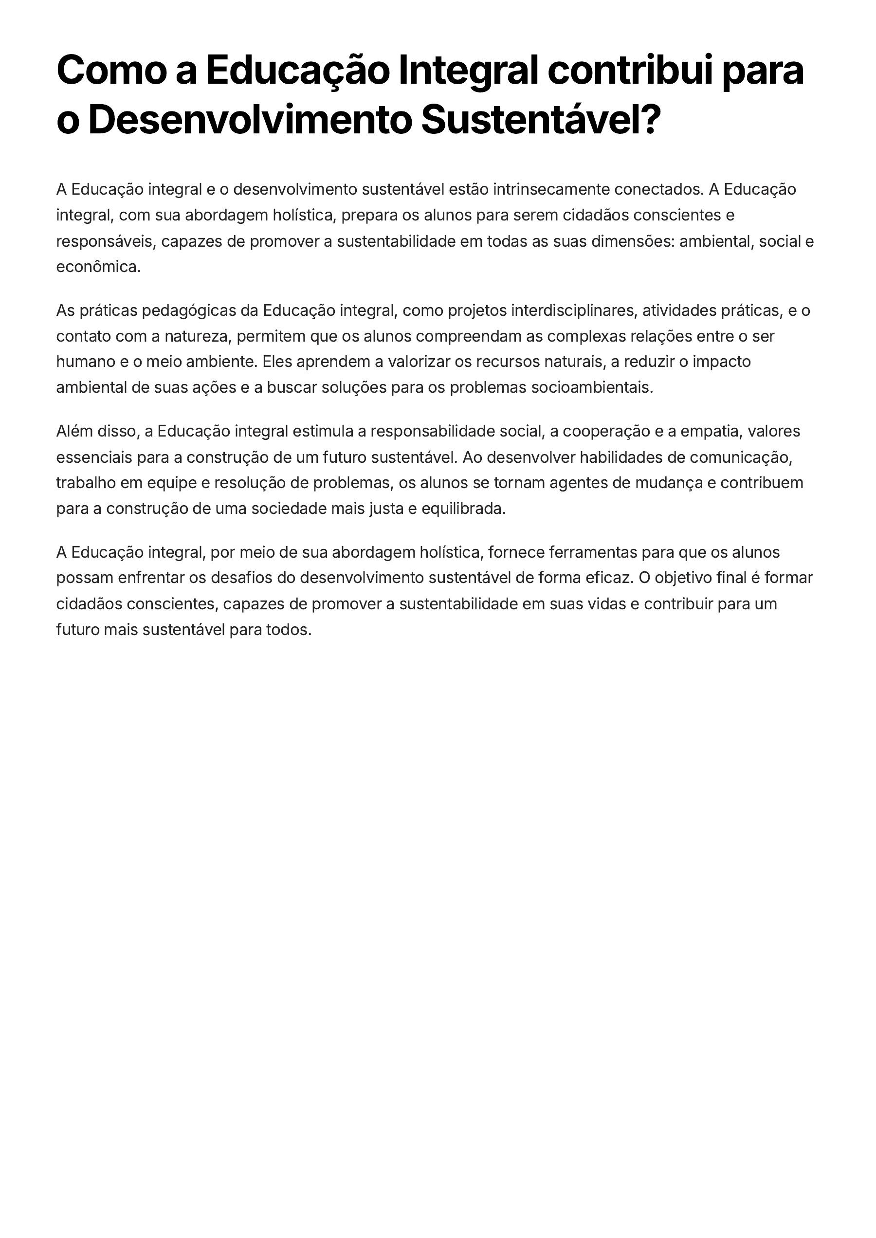 Como a Educação Integral contribui para o Desenvolvimento Sustentável? A Educação integral e o desenvolvimento sustentável estão intrinsecamente conectados. A Educação integral, com sua abordagem holística, prepara os alunos para serem cidadãos conscientes e responsáveis, capazes de promover a sustentabilidade em todas as suas dimensões: ambiental, social e econômica. As práticas pedagógicas da Educação integral, como projetos interdisciplinares, atividades práticas, e o contato com a natureza, permitem que os alunos compreendam as complexas relações entre o ser humano e o meio ambiente. Eles aprendem a valorizar os recursos naturais, a reduzir o impacto ambiental de suas ações e a buscar soluções para os problemas socioambientais. Além disso, a Educação integral estimula a responsabilidade social, a cooperação e a empatia, valores essenciais para a construção de um futuro sustentável. Ao desenvolver habilidades de comunicação, trabalho em equipe e resolução de problemas, os alunos se tornam agentes de mudança e contribuem para a construção de uma sociedade mais justa e equilibrada. A Educação integral, por meio de sua abordagem holística, fornece ferramentas para que os alunos possam enfrentar os desafios do desenvolvimento sustentável de forma eficaz. O objetivo final é formar cidadãos conscientes, capazes de promover a sustentabilidade em suas vidas e contribuir para um futuro mais sustentável para todos. Qual é o papel da comunidade no fortalecimento da Educação integral? A comunidade desempenha um papel fundamental no fortalecimento da Educação integral, atuando como parceira na construção de um ambiente educacional mais completo e enriquecedor para os alunos. Essa participação ativa contribui para a criação de um sistema educacional mais forte e conectado à realidade local. Envolvimento em projetos e atividades: A comunidade pode contribuir com a escola por meio da participação em projetos, eventos e atividades extracurriculares, como palestras, oficinas, apresentações artísticas e ações sociais, oferecendo sua expertise e recursos para enriquecer o aprendizado dos alunos. Apoio à infraestrutura e recursos: A comunidade pode auxiliar na manutenção da infraestrutura da escola, doando materiais, equipamentos ou recursos financeiros, garantindo um ambiente escolar mais adequado e propício ao aprendizado. Monitoramento e acompanhamento: A participação da comunidade no Conselho Escolar ou em outros órgãos de gestão permite o acompanhamento das ações da escola, garantindo a qualidade da Educação integral e a aplicação dos recursos de forma transparente. Divulgação e apoio à Educação integral: A comunidade pode atuar como agente de divulgação da importância da Educação integral, conscientizando outros membros da sociedade sobre seus benefícios e incentivando a participação em projetos e iniciativas da escola. Através de uma participação ativa e colaborativa, a comunidade contribui para o desenvolvimento de um ambiente educacional mais completo e eficaz, que atenda às necessidades e potencialidades dos alunos, preparando-os para os desafios do futuro. Como a Educação integral promove a inclusão e a equidade? A Educação integral, por sua natureza abrangente e atenta às necessidades individuais, desempenha um papel fundamental na promoção da inclusão e da equidade no ambiente escolar. Ela garante que todos os alunos, independentemente de suas características, origens, capacidades ou desafios, tenham acesso a oportunidades de aprendizado e desenvolvimento. Valorização da Diversidade: A Educação integral reconhece e respeita a diversidade de cada aluno, incluindo suas diferenças culturais, étnicas, linguísticas, sociais e de aprendizagem. Essa valorização cria um ambiente inclusivo e acolhedor, onde todos se sentem pertencentes e respeitados. Atendimento às Necessidades Individuais: A Educação integral proporciona um ensino personalizado, adaptado às necessidades e ritmos de aprendizagem de cada aluno. Isso inclui recursos e estratégias específicas para atender alunos com deficiência, altas habilidades, dificuldades de aprendizagem ou qualquer outra necessidade especial. Promoção da Equidade: A Educação integral busca garantir que todos os alunos tenham as mesmas oportunidades de acesso ao conhecimento e desenvolvimento de suas habilidades. Isso significa oferecer recursos e apoio adicionais para alunos que enfrentam desvantagens sociais, econômicas ou culturais, com o objetivo de minimizar as desigualdades e promover a justiça social. Criação de um Ambiente de Respeito: A Educação integral fomenta a construção de um ambiente escolar pautado em valores como respeito, empatia, colaboração e justiça social. Esse ambiente positivo contribui para a formação de cidadãos conscientes e engajados na construção de uma sociedade mais justa e igualitária. A Educação integral, ao promover a inclusão e a equidade, oferece a todos os alunos a chance de alcançar seu potencial máximo, desenvolvendo-se como pessoas completas e capazes de contribuir para a sociedade. Qual é a diferença entre Educação Integral e Educação em Tempo Integral? É comum haver confusão entre os termos "Educação Integral" e "Educação em Tempo Integral". Apesar de ambos buscarem ampliar o tempo e as oportunidades de aprendizagem, eles se diferenciam em seus objetivos e abrangência. A Educação em Tempo Integral, como o próprio nome sugere, foca no aumento da carga horária escolar, estendendo o tempo de permanência dos alunos na escola para além do período regular. Por outro lado, a Educação Integral visa a um desenvolvimento completo do aluno, englobando aspectos cognitivos, socioemocionais, físicos e culturais. A Educação Integral busca promover a formação integral do aluno, considerando suas múltiplas dimensões, e trabalhando em conjunto com a comunidade para f