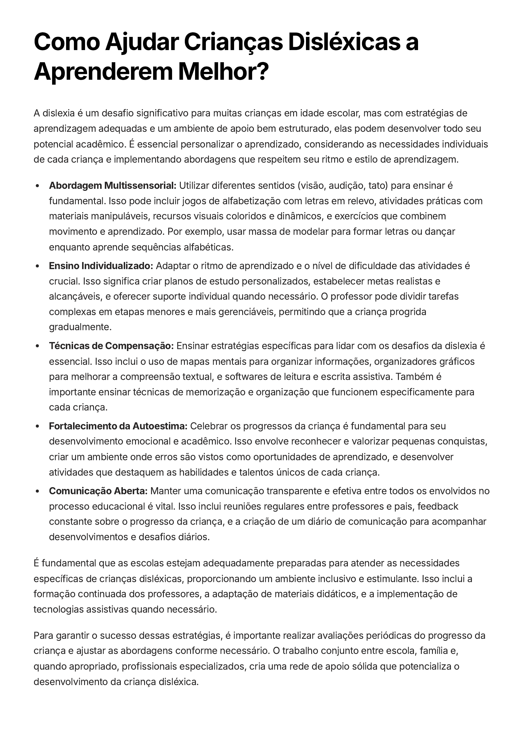 Como Ajudar Crianças Disléxicas a Aprenderem Melhor? A dislexia é um desafio significativo para muitas crianças em idade escolar, mas com estratégias de aprendizagem adequadas e um ambiente de apoio bem estruturado, elas podem desenvolver todo seu potencial acadêmico. É essencial personalizar o aprendizado, considerando as necessidades individuais de cada criança e implementando abordagens que respeitem seu ritmo e estilo de aprendizagem. Abordagem Multissensorial: Utilizar diferentes sentidos (visão, audição, tato) para ensinar é fundamental. Isso pode incluir jogos de alfabetização com letras em relevo, atividades práticas com materiais manipuláveis, recursos visuais coloridos e dinâmicos, e exercícios que combinem movimento e aprendizado. Por exemplo, usar massa de modelar para formar letras ou dançar enquanto aprende sequências alfabéticas. Ensino Individualizado: Adaptar o ritmo de aprendizado e o nível de dificuldade das atividades é crucial. Isso significa criar planos de estudo personalizados, estabelecer metas realistas e alcançáveis, e oferecer suporte individual quando necessário. O professor pode dividir tarefas complexas em etapas menores e mais gerenciáveis, permitindo que a criança progrida gradualmente. Técnicas de Compensação: Ensinar estratégias específicas para lidar com os desafios da dislexia é essencial. Isso inclui o uso de mapas mentais para organizar informações, organizadores gráficos para melhorar a compreensão textual, e softwares de leitura e escrita assistiva. Também é importante ensinar técnicas de memorização e organização que funcionem especificamente para cada criança. Fortalecimento da Autoestima: Celebrar os progressos da criança é fundamental para seu desenvolvimento emocional e acadêmico. Isso envolve reconhecer e valorizar pequenas conquistas, criar um ambiente onde erros são vistos como oportunidades de aprendizado, e desenvolver atividades que destaquem as habilidades e talentos únicos de cada criança. Comunicação Aberta: Manter uma comunicação transparente e efetiva entre todos os envolvidos no processo educacional é vital. Isso inclui reuniões regulares entre professores e pais, feedback constante sobre o progresso da criança, e a criação de um diário de comunicação para acompanhar desenvolvimentos e desafios diários. É fundamental que as escolas estejam adequadamente preparadas para atender as necessidades específicas de crianças disléxicas, proporcionando um ambiente inclusivo e estimulante. Isso inclui a formação continuada dos professores, a adaptação de materiais didáticos, e a implementação de tecnologias assistivas quando necessário. Para garantir o sucesso dessas estratégias, é importante realizar avaliações periódicas do progresso da criança e ajustar as abordagens conforme necessário. O trabalho conjunto entre escola, família e, quando apropriado, profissionais especializados, cria uma rede de apoio sólida que potencializa o desenvolvimento da criança disléxica.