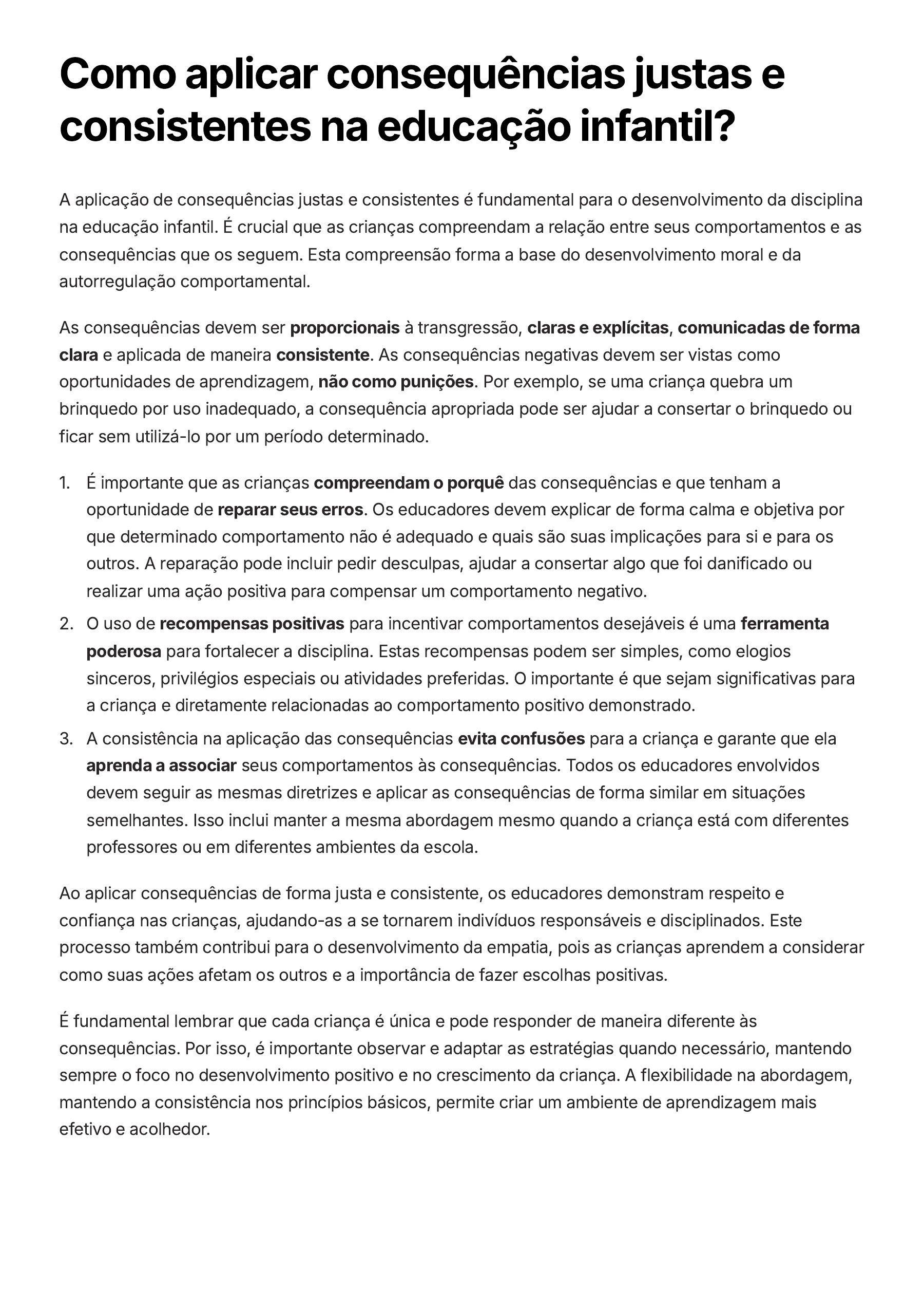 Como aplicar consequências justas e consistentes na educação infantil? A aplicação de consequências justas e consistentes é fundamental para o desenvolvimento da disciplina na educação infantil. É crucial que as crianças compreendam a relação entre seus comportamentos e as consequências que os seguem. Esta compreensão forma a base do desenvolvimento moral e da autorregulação comportamental. As consequências devem ser proporcionais à transgressão, claras e explícitas, comunicadas de forma clara e aplicada de maneira consistente. As consequências negativas devem ser vistas como oportunidades de aprendizagem, não como punições. Por exemplo, se uma criança quebra um brinquedo por uso inadequado, a consequência apropriada pode ser ajudar a consertar o brinquedo ou ficar sem utilizá-lo por um período determinado. É importante que as crianças compreendam o porquê das consequências e que tenham a oportunidade de reparar seus erros. Os educadores devem explicar de forma calma e objetiva por que determinado comportamento não é adequado e quais são suas implicações para si e para os outros. A reparação pode incluir pedir desculpas, ajudar a consertar algo que foi danificado ou realizar uma ação positiva para compensar um comportamento negativo. 1. O uso de recompensas positivas para incentivar comportamentos desejáveis é uma ferramenta poderosa para fortalecer a disciplina. Estas recompensas podem ser simples, como elogios sinceros, privilégios especiais ou atividades preferidas. O importante é que sejam significativas para a criança e diretamente relacionadas ao comportamento positivo demonstrado. 2. A consistência na aplicação das consequências evita confusões para a criança e garante que ela aprenda a associar seus comportamentos às consequências. Todos os educadores envolvidos devem seguir as mesmas diretrizes e aplicar as consequências de forma similar em situações semelhantes. Isso inclui manter a mesma abordagem mesmo quando a criança está com diferentes professores ou em diferentes ambientes da escola. 3. Ao aplicar consequências de forma justa e consistente, os educadores demonstram respeito e confiança nas crianças, ajudando-as a se tornarem indivíduos responsáveis e disciplinados. Este processo também contribui para o desenvolvimento da empatia, pois as crianças aprendem a considerar como suas ações afetam os outros e a importância de fazer escolhas positivas. É fundamental lembrar que cada criança é única e pode responder de maneira diferente às consequências. Por isso, é importante observar e adaptar as estratégias quando necessário, mantendo sempre o foco no desenvolvimento positivo e no crescimento da criança. A flexibilidade na abordagem, mantendo a consistência nos princípios básicos, permite criar um ambiente de aprendizagem mais efetivo e acolhedor.