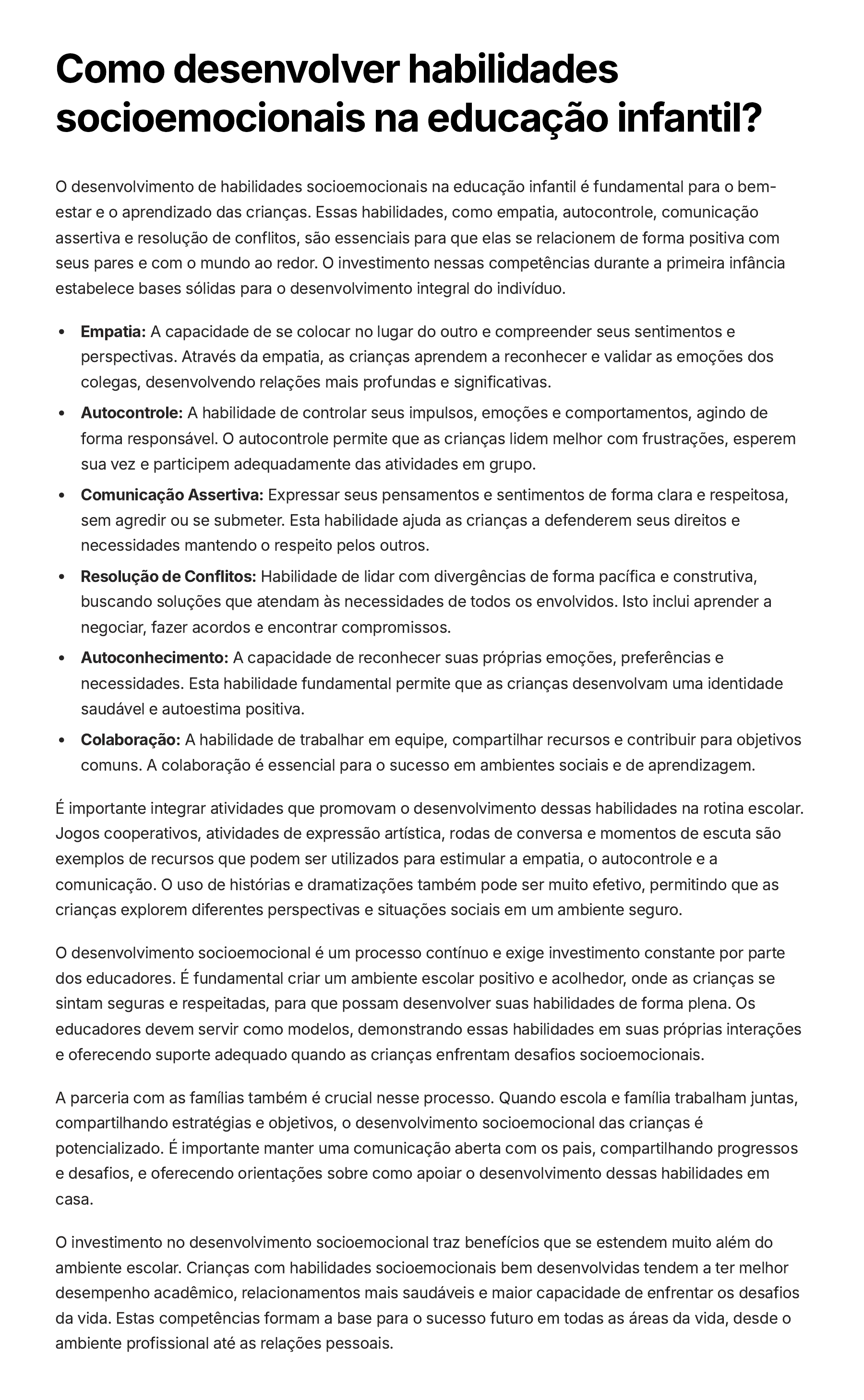 Como desenvolver habilidades socioemocionais na educação infantil? O desenvolvimento de habilidades socioemocionais na educação infantil é fundamental para o bem- estar e o aprendizado das crianças. Essas habilidades, como empatia, autocontrole, comunicação assertiva e resolução de conflitos, são essenciais para que elas se relacionem de forma positiva com seus pares e com o mundo ao redor. O investimento nessas competências durante a primeira infância estabelece bases sólidas para o desenvolvimento integral do indivíduo. Empatia: A capacidade de se colocar no lugar do outro e compreender seus sentimentos e perspectivas. Através da empatia, as crianças aprendem a reconhecer e validar as emoções dos colegas, desenvolvendo relações mais profundas e significativas. Autocontrole: A habilidade de controlar seus impulsos, emoções e comportamentos, agindo de forma responsável. O autocontrole permite que as crianças lidem melhor com frustrações, esperem sua vez e participem adequadamente das atividades em grupo. Comunicação Assertiva: Expressar seus pensamentos e sentimentos de forma clara e respeitosa, sem agredir ou se submeter. Esta habilidade ajuda as crianças a defenderem seus direitos e necessidades mantendo o respeito pelos outros. Resolução de Conflitos: Habilidade de lidar com divergências de forma pacífica e construtiva, buscando soluções que atendam às necessidades de todos os envolvidos. Isto inclui aprender a negociar, fazer acordos e encontrar compromissos. Autoconhecimento: A capacidade de reconhecer suas próprias emoções, preferências e necessidades. Esta habilidade fundamental permite que as crianças desenvolvam uma identidade saudável e autoestima positiva. Colaboração: A habilidade de trabalhar em equipe, compartilhar recursos e contribuir para objetivos comuns. A colaboração é essencial para o sucesso em ambientes sociais e de aprendizagem. É importante integrar atividades que promovam o desenvolvimento dessas habilidades na rotina escolar. Jogos cooperativos, atividades de expressão artística, rodas de conversa e momentos de escuta são exemplos de recursos que podem ser utilizados para estimular a empatia, o autocontrole e a comunicação. O uso de histórias e dramatizações também pode ser muito efetivo, permitindo que as crianças explorem diferentes perspectivas e situações sociais em um ambiente seguro. O desenvolvimento socioemocional é um processo contínuo e exige investimento constante por parte dos educadores. É fundamental criar um ambiente escolar positivo e acolhedor, onde as crianças se sintam seguras e respeitadas, para que possam desenvolver suas habilidades de forma plena. Os educadores devem servir como modelos, demonstrando essas habilidades em suas próprias interações e oferecendo suporte adequado quando as crianças enfrentam desafios socioemocionais. A parceria com as famílias também é crucial nesse processo. Quando escola e família trabalham juntas, compartilhando estratégias e objetivos, o desenvolvimento socioemocional das crianças é potencializado. É importante manter uma comunicação aberta com os pais, compartilhando progressos e desafios, e oferecendo orientações sobre como apoiar o desenvolvimento dessas habilidades em casa. O investimento no desenvolvimento socioemocional traz benefícios que se estendem muito além do ambiente escolar. Crianças com habilidades socioemocionais bem desenvolvidas tendem a ter melhor desempenho acadêmico, relacionamentos mais saudáveis e maior capacidade de enfrentar os desafios da vida. Estas competências formam a base para o sucesso futuro em todas as áreas da vida, desde o ambiente profissional até as relações pessoais.