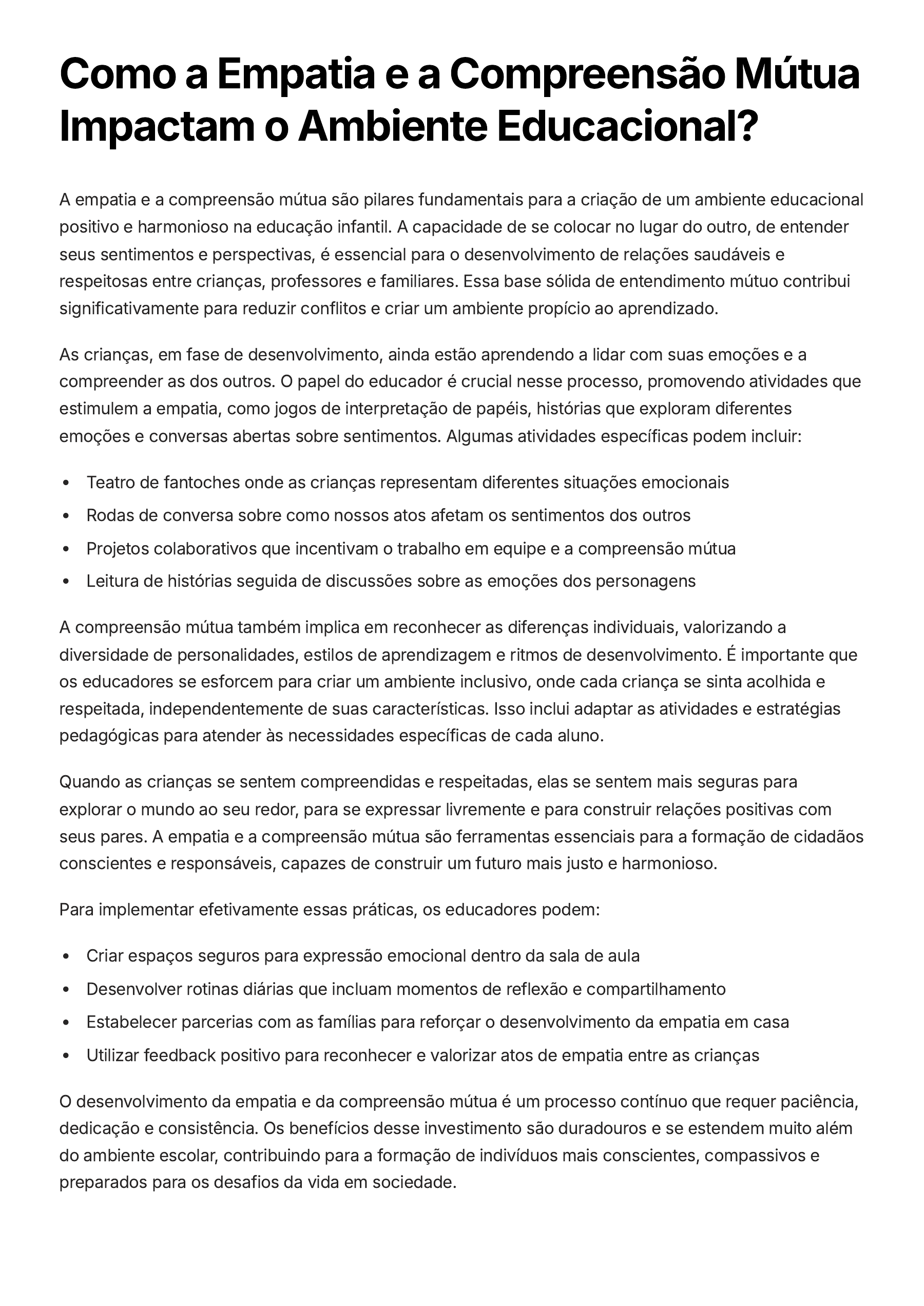 Como a Empatia e a Compreensão Mútua Impactam o Ambiente Educacional? A empatia e a compreensão mútua são pilares fundamentais para a criação de um ambiente educacional positivo e harmonioso na educação infantil. A capacidade de se colocar no lugar do outro, de entender seus sentimentos e perspectivas, é essencial para o desenvolvimento de relações saudáveis e respeitosas entre crianças, professores e familiares. Essa base sólida de entendimento mútuo contribui significativamente para reduzir conflitos e criar um ambiente propício ao aprendizado. As crianças, em fase de desenvolvimento, ainda estão aprendendo a lidar com suas emoções e a compreender as dos outros. O papel do educador é crucial nesse processo, promovendo atividades que estimulem a empatia, como jogos de interpretação de papéis, histórias que exploram diferentes emoções e conversas abertas sobre sentimentos. Algumas atividades específicas podem incluir: Teatro de fantoches onde as crianças representam diferentes situações emocionais Rodas de conversa sobre como nossos atos afetam os sentimentos dos outros Projetos colaborativos que incentivam o trabalho em equipe e a compreensão mútua Leitura de histórias seguida de discussões sobre as emoções dos personagens A compreensão mútua também implica em reconhecer as diferenças individuais, valorizando a diversidade de personalidades, estilos de aprendizagem e ritmos de desenvolvimento. É importante que os educadores se esforcem para criar um ambiente inclusivo, onde cada criança se sinta acolhida e respeitada, independentemente de suas características. Isso inclui adaptar as atividades e estratégias pedagógicas para atender às necessidades específicas de cada aluno. Quando as crianças se sentem compreendidas e respeitadas, elas se sentem mais seguras para explorar o mundo ao seu redor, para se expressar livremente e para construir relações positivas com seus pares. A empatia e a compreensão mútua são ferramentas essenciais para a formação de cidadãos conscientes e responsáveis, capazes de construir um futuro mais justo e harmonioso. Para implementar efetivamente essas práticas, os educadores podem: Criar espaços seguros para expressão emocional dentro da sala de aula Desenvolver rotinas diárias que incluam momentos de reflexão e compartilhamento Estabelecer parcerias com as famílias para reforçar o desenvolvimento da empatia em casa Utilizar feedback positivo para reconhecer e valorizar atos de empatia entre as crianças O desenvolvimento da empatia e da compreensão mútua é um processo contínuo que requer paciência, dedicação e consistência. Os benefícios desse investimento são duradouros e se estendem muito além do ambiente escolar, contribuindo para a formação de indivíduos mais conscientes, compassivos e preparados para os desafios da vida em sociedade.