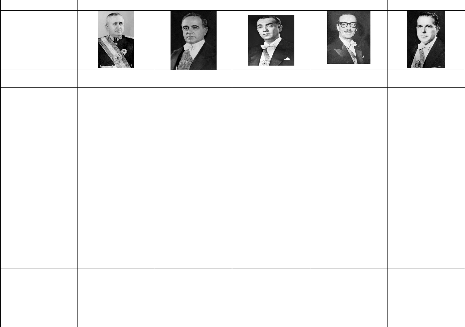 Eurico Gaspar Dutra Getúlio Vargas Juscelino Kubitschek Jânio Quadros João Goulart Período de governo 1946-1951 1951-1954 1956-1961 1961 1961-1964 Medidas políticas -Constituição de 1946: reestabelecimento de eleições diretas, restauração de garantias individuais aos cidadãos, preservação da estrutura fundiária; -Rompimento de relações diplomáticas com a URSS; -Fechamento do PCB (Partido Comunista Brasileiro); -Restrição de greves e intervenção em sindicatos de tendência socialista. -Crise política: Forte repressão ao governo devido a insatisfação popular; -Proposta desenvolvimentista-nacionalista; -Incentivo a organização sindical. -Construção de Brasília: nova capital (desenvolvimento da região centro-oeste); -Promovia 50 anos de modernização em 5 de governo. -Reaproximação com o socialismo; -Política externa independente (aproximação com Cuba, URSS e China). -Condecorava com Che Guevara. -Estabelecimento do parlamentarismo: polarização política; -Plebiscito: retorno presidencialismo; -Reformas de base: educação, fiscal, eleitoral, agrária, urbana. Medidas econômicas -Alinhamento do Brasil ao bloco capitalista, liderado pelos Estados Unidos; -Abertura econômica: instalação de multinacionais; -Plano SALTE (Saúde, educação, transporte e energia - priorizava investimentos): Companhia Hidrelétrica de São Francisco e Rodovia Rio de Janeiro-São Paulo. -Intervenção Estatal: visava estimular a industrialização; -Modernização acelerada: êxodo rural; -Aumento de 100% do salário mínimo; -“O petróleo é nosso”; -Criação da Petrobrás; -Criação da BNDE (Banco Nacional de Desenvolvimento Econômico); -Elaboração do projeto da Eletrobrás. -Plano de metas: acelerado crescimento econômico a partir da expansão do setor industrial e da infraestrutura; -Nacionalismo-Desenvolvimentismo: Estado intervinha em setores básicos lucrativos e a indústria de bens possuía capitais privados; -Empréstimos com o FMI; -Indústria automobilística (GEIA); -Indústria automobilística (GEIACON); -Rodovias Belém-Brasília; -Criação da SUDENE (Superintendência do Desenvolvimento do Nordeste). -Aumento da crise econômica: dívida externa e inflação; -Política de austeridade: congelamento de salários, restrição do crédito, corte de subsídio federal, desvalorização da moeda em 100%. -Plano Trienal: Diminuição das importações; -Promulgação do Estatuto do trabalhador rural (em resposta das ligas camponesas). Aspectos da cultura na época -Cinema Novo (movimento cinematográfico brasileiro que propunha a produção de filmes voltados à realidade do país, com linguagem simples), iniciou-se em 1950. -Fundação do grupo Teatro de Arena (1953), que produzia espetáculos com baixo custo que privilegiassem temas ligados às contradições do Brasil, valorizando atores e diretores nacionais. -Início do movimento musical bossa-nova (1958), que se caracterizava pelo seu jeito de cantar sussurrando e continuamente, com temas leves e cotidianos. -Proibição de rinha de galo, do uso de biquínis nas praias e lança-perfume. -Ligas Camponesas (reivindicavam direitos para o trabalhador do campo e a reforma agrária). BRASIL - Governos Populistas 1945 a 1964 image3.jpeg image4.png image5.jpeg image1.jpeg image2.jpeg
