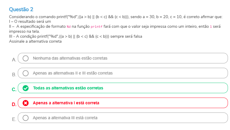 Questão 2 Considerando a = é correto afirmar que: I - resultado será um II - A especificação de formato %d na função printf fará com que valor seja impressa como um inteiro, então 1 será impresso na tela. III - A será falsa Assinale a alternativa correta A. Nenhuma das alternativas estão corretas B. Apenas as alternativas II e III estão corretas C. Todas as alternativas estão corretas D. Apenas a alternativa está correta E. Apenas a alternativa III está correta