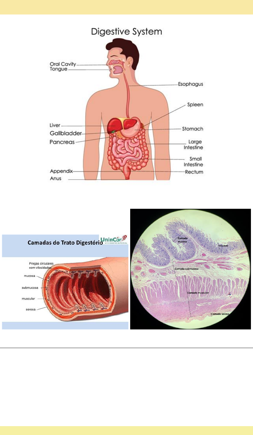Lara Cascaes da Rosa | 5º semestre Medicina (UNISUL) Histologia do Tgi Dividido em 4 camadas: mucosa, submucosa, muscular e serosa ESTRUTURA GERAL: • Camada mucosa: o Revestimento epitelial o Lâmina própria o Muscular da mucosa • Camada Submucosa: o Tecido conjuntivo Lara Cascaes da Rosa | 5º semestre Medicina (UNISUL) o Vasos Sanguíneos o Vasos Linfáticos o Plexo nervoso • Camada Muscular: o Tecido muscular liso o Mais interno -> circular o Mais externo -> longitudinal o Plexo nervoso mioentérico o Localizado entre as camadas o Movimentos peristálticos • Camada Serosa: o Epitélio pavimentoso simples -> Mesotélio o Peritônio CAVIDADE ORAL: • Mucosa mastigatória – epitélio estratificado pavimentoso queratinizado; • Gengiva e palato duro; • Mucosa de revestimento – epitélio estratificado pavimentoso não queratinizado; • Palato mole, bochechas, assoalho bucal; ESÔFAGO: • Tubo muscular de aprox. 25 cm; • Conduz o alimento desde a faringe até o estômago; • Epitélio estratificado pavimentoso não queratinizado; • Lâmina propria – fibras colágenas; • Muscular da mucosa – mais espessa • Glândulas esôfágicas – na submucosa; • Secretam muco – lubrificar e facilitar transporte do alimento; ESTÔMAGO: • Porção expandida do tubo digestório; • Bolo alimentar; • Dividido em cárdia, fundo, corpo e piloro (antro); • MUCOSA: Lara Cascaes da Rosa | 5º semestre Medicina (UNISUL) o Epitélio glandular colunar simples; o Lâmina propria – tecido conjuntivo; o Células musculares lisas; o Células linfoides; • SUBMUCOSA: o Tecido conjuntivo denso; o Vasos sanguíneos e linfáticos; o Células linfoides; • MUSCULAR: o Composta por músculo liso; o 3 camadas: ▪ Externa longitudinal ▪ Média circular ▪ Interna oblíqua • CÁRDIA: o Glândulas tubulares simples ou ramificadas • FUNDO E CORPO: o Glândulas tubulares ramificadas; o 3 a 7 glândulas em cada fosseta; • ANTRO: o Fossetas gástricas muito profundas; o Glândulas tubulares simples ou ramificadas INTESTINO DELGADO: • Digestão final dos alimentos; • Absorção de nutrientes; • Secreção endócrina; Dividido em duodeno, jejuno e íleo MUCOSA: • Vilosidades intestinais; • Enterócitos; o Epitélio colunar simples; o Núcleo basal; Lara Cascaes da Rosa | 5º semestre Medicina (UNISUL) o Microvilosidades em ápice; • Células caliciformes – produzem muco; • Criptas: o Glândulas intestinais; o Células caliciformes; o Células de Paneth; o RELAÇÃO VILO/ CRIPTA -> 3/1 INTESTINO GROSSO: • Absorção de água; • Formação da massa fecal; • Produção de muco; Dividido em: Ceco, colon ascendente, colon transverso, colon descendente, colon sigmoide, reto e ânus; MUCOSA: • Sem dobras ou vilosidades; • Epitélio colunar simples com microvilos curtos; • Criptas intestinais longas; • Células caliciformes abundantes; SUBMUCOSA: • Tecido conjuntivo; • Vasos sanguíneos e linfáticos; • Celulas linfoides; • Folículos linfoides; Lara Cascaes da Rosa | 5º semestre Medicina (UNISUL) Doença Celíaca Enteropatia sensível ao glúten (composto proteico presente nos cereais)- glicoproteína É mediada pelo sistema imunológico (Doença autoimune), disparada pela ingestão Definição: Doença celíaca é uma doença autoimune causada pela intolerância ao glúten, uma proteína encontrada no trigo, aveia, cevada, centeio e seus derivados, como massas, pizzas, bolos, pães, biscoitos, cerveja, uísque, vodka e alguns doces, provocando dificuldade do organismo de absorver os nutrientes dos alimentos, vitaminas, sais minerais e água. • Alteração genética: HLA-DQ2 e HLA-DQ8 • Doença polgênica • Maior presença em mulheres e em indivíduos brancos Fisiopatologia: ingestão do glúten =quebra do glúten -> formação da gliadina -> expressam Interleucia 15 (IL-15) -> ativação e proliferação de linfócitos intra epiteliais CD8+ -> Passagem de mais gliadina passando = Inflamação na parede intestinal Quadro clínico: variável (depende da quantidade de glúten ingerida, idade, sensibilidade do próprio paciente- maior ou menor chance de desenvolver a inflamação, tempo de aleitamento materno- maior tempo= sintomas aparecem mais tardiamente), fezes volumosas, esteatotorreia, distensão abdominal, náuseas, irritabilidade, desnutrição PRINCIPAIS SINTOMAS DO QUADRO CLÍNICO: Síndrome disabsortiva +Desnutrição • Forma típica: crise celíaca (distensão abdominal, diarreia aquosa, desidratação grave, distúrbios hidroeletrolítico) • Forma atípica (pode levar a um problema mais “crônico”): mono ou oligossintomáticos (atraso puberal, baixa estatura, anemia ferropriva refratária, dermatite herpetiforme, estomatite aftosa recorrente) • Forma assintomática/ silenciosa: pode descobrir através de outros familiares Diagnósticos diferenciais: • Alergia alimentar • Fibrose cística • Desnutrição primária • Parasitoses Diagnóstico => com consumo de glúten. 1. Sindrome disabsortiva 2. Marcadores sorológicos IgA/ IgG tTGA IgA total Antiendomísio IgA 3. Alteração da mucosa celíaca Lara Cascaes da Rosa | 5º semestre Medicina (UNISUL) OBS: Se parar de comer o glúten para de ter as agressões, consequentemente vai diminuir o quadro inflamatório. Portanto, para se fazer os testes sorológicos é importante que o paciente permaneça se alimentando com o glúten. Exames complementares: Biópsia duodenal: presença de infiltrado linfocitário, alargamento das criptas, atrofia vilositária Perda de vilosidades: é a principal alteração anatômica. Tratamento: Principalmente dieta livre de glúten, vilosidades retornam ao normal depois dessa mudança de hábitos. Complicações: quando prolongar a inflamação intestinal • Úlceras de intestino delgado • Malignidades: linfoma T de intestino delgado e linfonodos regionais, adenocarcinoma de intestino delgado, …