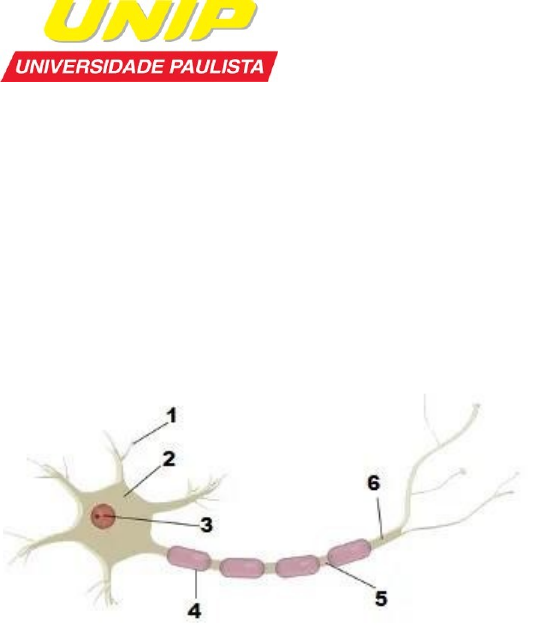 ALUNO(A):PRISCILIA BARBOSA DA SILVA SANTOS _______________CURSO: FISIOTERAPIA PROFª: THAYNÁ BRENNA DISCIPLINA: NEUROANATOMIA TURMA: ROTEIRO DE NEUROANATOMIA BÁSICA DO SISTEMA NERVOSO 1)Observe a figura e construa a legenda com as respectivas funções: 5 1. DENTRITO 2. CORPOCELULAR 3. NÚCLEO CELULAR 4.BAINHA DE MELINA 5.AXÔNIO 2) Quais são os constituintes do Sistema Nervoso Central e do Sistema Nervoso Periférico? R: O SISTEMA NERVOSO CENTRAL É FORMADO POR ENCÉFALO E MEDULA, ENQUANTO O PERIFÉRICO É FORMADO POR NERVOS E GÂNGLIOS. _________________________________________________________________________ ___________________________________________________________________________________ 3) Observe a figura e construa a legenda: 1.TELENCÉFALO 2.DIENCÉFALO 3.CEREBELO 4.MESENCÉFALO 5.PONTE 6.BUIBO 7.MEDULA ESPIMHAL 4) Descreva o fenômeno da sinapse R: AS SINAPSES SÃO JUNÇÃO ENTRE A TERMINAÇÃO DE UM NEURONIO E A MEMBRANA DE OUTRO NEURÕNIO. SÃO ELAS QUE FAZEM A CONEXÃO ENTRE CÉLULAS VIZINHAS, DANDO CONTINUIDADE Á PROPAGAÇÃO DO IMPULSO NERVOSO POR TODA A REDE NEURONAL. __________________________________________________________________________________ 5) Assinale V para verdadeiro e F para falso. Justifique as sentenças falsas: a) O Sistema Nervoso é responsável pela preservação e adaptação da vida humana no meio ambiente (F ) b) O Sistema Nervoso pode ser dividido funcionalmente em Sistema Nervoso Central e Sistema Nervoso Periférico (V ) c) Compõem o Sistema Nervoso Periférico: nervos cranianos, nervos espinhais e tronco encefálico ( ). d) Compõem o Sistema Nervoso Central: tronco encefálico, diencéfalo, cerebelo, telencéfalo e nervos cranianos. ( ) Espaço para justificativas das afirmativas Falsas, caso hajam: __________________________________________________________________________________ __________________________________________________________________________________ __________________________________________________________________________________ __________________________________________________________________________________ __________________________________________________________________________________ __________________________________________________________________________________ image4.jpg image1.jpg image2.jpg image3.png image0.jpg image1.png
