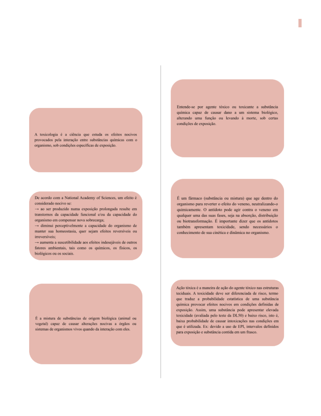<p>Fernanda Rodrigues 1</p><p>SP 11— “Um anjo em pessoa”</p><p>Primeiramente temos que entender alguns conceitos</p><p>básicos…</p><p>O que é Toxicologia ?</p><p>Quando um efeito pode ser considerado nocivo ?</p><p>O que é Veneno?</p><p>O que é um Agente Tóxico?</p><p>O que é um Antídoto?</p><p>O que é Ação Tóxica?</p><p>Medicina Unifadra Dracena 2</p><p>O que é Toxicidade?</p><p>Referências Bibliográficas:</p><p>OGA, Seizi; CAMARGO, Márcia Maria de</p><p>Almeida; BATISTUZZO, José Antonio de Oliveira</p><p>(ed.). Fundamentos de toxicologia. 5. ed. São</p><p>Paulo, SP: Atheneu, 2021. E-book. Disponível em:</p><p>https://plataforma.bvirtual.com.br. Acesso em: 20</p><p>out. 2024.</p><p>1. Relembre os mecanismos de ação dos</p><p>receptores muscarínicos e nicotínicos.</p><p>Duas famílias de receptores colinérgicos,</p><p>designados muscarínicos e nicotínicos, podem ser</p><p>diferenciadas entre si com base em suas diferentes</p><p>afinidades para fármacos que mimetizam a ação da</p><p>ACh (fármacos colinomiméticos).</p><p>A. Receptores muscarínicos</p><p>Os receptores muscarínicos pertencem à classe dos</p><p>receptores acoplados à proteína G (receptores</p><p>metabotrópicos). Esses receptores, além de se</p><p>ligarem à ACh, reconhecem a muscarina, um</p><p>alcalóide que está presente em certos cogumelos</p><p>venenosos. Porém, os receptores muscarínicos</p><p>apresentam baixa afinidade pela nicotina (Fig.</p><p>4.4A). Há cinco subclasses de receptores</p><p>muscarínicos. Contudo, somente os receptores M1,</p><p>M2 e M3 foram caracterizados funcionalmente.</p><p>1. Localização dos receptores muscarínicos</p><p>Esses receptores se localizam em gânglios do</p><p>sistema nervoso periférico e em órgãos efetores</p><p>autônomos, como coração, músculos lisos,</p><p>cérebro e glândulas exócrinas. Embora os cinco</p><p>subtipos sejam encontrados nos neurônios,</p><p>receptores M1 também são encontrados nas</p><p>células parietais gástricas; M2, nas células</p><p>cardíacas e nos músculos lisos; e M3, na bexiga,</p><p>nas glândulas exócrinas e no músculo liso.</p><p>Nota: fármacos com ações muscarínicas</p><p>preferencialmente estimulam receptores</p><p>muscarínicos nesses tecidos, mas, em</p><p>concentrações elevadas, podem mostrar</p><p>alguma atividade em receptores nicotínicos.</p><p>Medicina Unifadra Dracena 3</p><p>2. Mecanismos de transdução do sinal pela</p><p>ACh</p><p>Inúmeros mecanismos moleculares diferentes</p><p>transmitem o sinal gerado na ocupação do receptor</p><p>pela ACh. Por exemplo, quando os receptores M1</p><p>ou M3 são ativados, o receptor sofre uma mudança</p><p>conformacional e interage com uma proteína G,</p><p>designada Gq, a qual, por sua vez, ativa a</p><p>fosfolipase C. Isso leva à produção de segundos</p><p>mensageiros trifosfato (1,4,5) de inositol (IP3) e</p><p>diacilglicerol (DAG). O IP3 causa aumento no Ca</p><p>2+ intracelular. O cálcio, então, pode estimular ou</p><p>inibir enzimas ou causar hiperpolarização, secreção</p><p>ou contração. O DAG ativa a proteinocinase C, uma</p><p>enzima que fosforila inúmeras proteínas no interior</p><p>da célula. Em contraste, a ativação do subtipo M2</p><p>no músculo cardíaco estimula a proteína G,</p><p>denominada Gi, a qual inibe a adenililciclase e</p><p>aumenta a condutância ao K +. O coração responde</p><p>diminuindo a velocidade e a força de contração.</p><p>3. Agonistas muscarínicos</p><p>A pilocarpina é um exemplo de agonista</p><p>muscarínico não seletivo usado no tratamento da</p><p>xerostomia e do glaucoma. Atualmente, são feitos</p><p>esforços para desenvolver agonistas e antagonistas</p><p>muscarínicos que atuem em subtipos específicos de</p><p>receptores. Agonistas dos receptores M1 são</p><p>investigados para o tratamento da doença de</p><p>Alzheimer, e antagonistas dos receptores M3, para o</p><p>tratamento da doença pulmonar obstrutiva crônica.</p><p>Nota: na atualidade, nenhum fármaco</p><p>clinicamente importante interage apenas com</p><p>receptores M4 e M5.</p><p>B. Receptores nicotínicos</p><p>Os receptores nicotínicos, além de ligarem a ACh,</p><p>reconhecem a nicotina, mas têm baixa afinidade pela</p><p>muscarina (Fig. 4.4B). O receptor nicotínico é</p><p>composto de cinco subunidades e funciona como um</p><p>canal iônico disparado pelo ligante. A ligação de</p><p>duas moléculas de ACh provoca uma alteração</p><p>conformacional que permite a entrada de íons sódio,</p><p>resultando na despolarização da célula efetora. A</p><p>nicotina em concentração baixa estimula o receptor;</p><p>em concentração alta, o bloqueia.</p><p>Os receptores nicotínicos estão localizados no SNC,</p><p>na suprarrenal, nos gânglios autônomos e na junção</p><p>neuromuscular (JNM) nos músculos esqueléticos.</p><p>Aqueles localizados na JNM algumas vezes são</p><p>designados NM, e os outros, NN. Os receptores</p><p>nicotínicos dos gânglios autônomos diferem</p><p>daqueles situados na JNM. Por exemplo, os</p><p>receptores ganglionares são bloqueados</p><p>seletivamente pela mecamilamina, ao passo que os</p><p>receptores da JNM são bloqueados especificamente</p><p>pelo atracúrio.</p><p>Receptores Colinérgicos</p><p>Os receptores colinérgicos são um grupo de</p><p>receptores pós sinápticos classificados em:</p><p>muscarínicos e nicotínicos. Esses receptores são</p><p>encontrados em gânglios do Sistema Nervoso</p><p>Periférico e nos órgãos efetores autônomos: coração,</p><p>músculos lisos, cérebro e glândulas exócrinas.</p><p>Medicina Unifadra Dracena 4</p><p>Receptores Muscarínicos</p><p>Os receptores muscarínicos pertencem à família dos</p><p>receptores acoplados à proteína G. Cinco subtipos</p><p>desses receptores foram detectados por clonagem</p><p>molecular:</p><p>♡M1.</p><p>♡M2.</p><p>♡M3.</p><p>♡M4.</p><p>♡M5.</p><p>Entretanto, os r