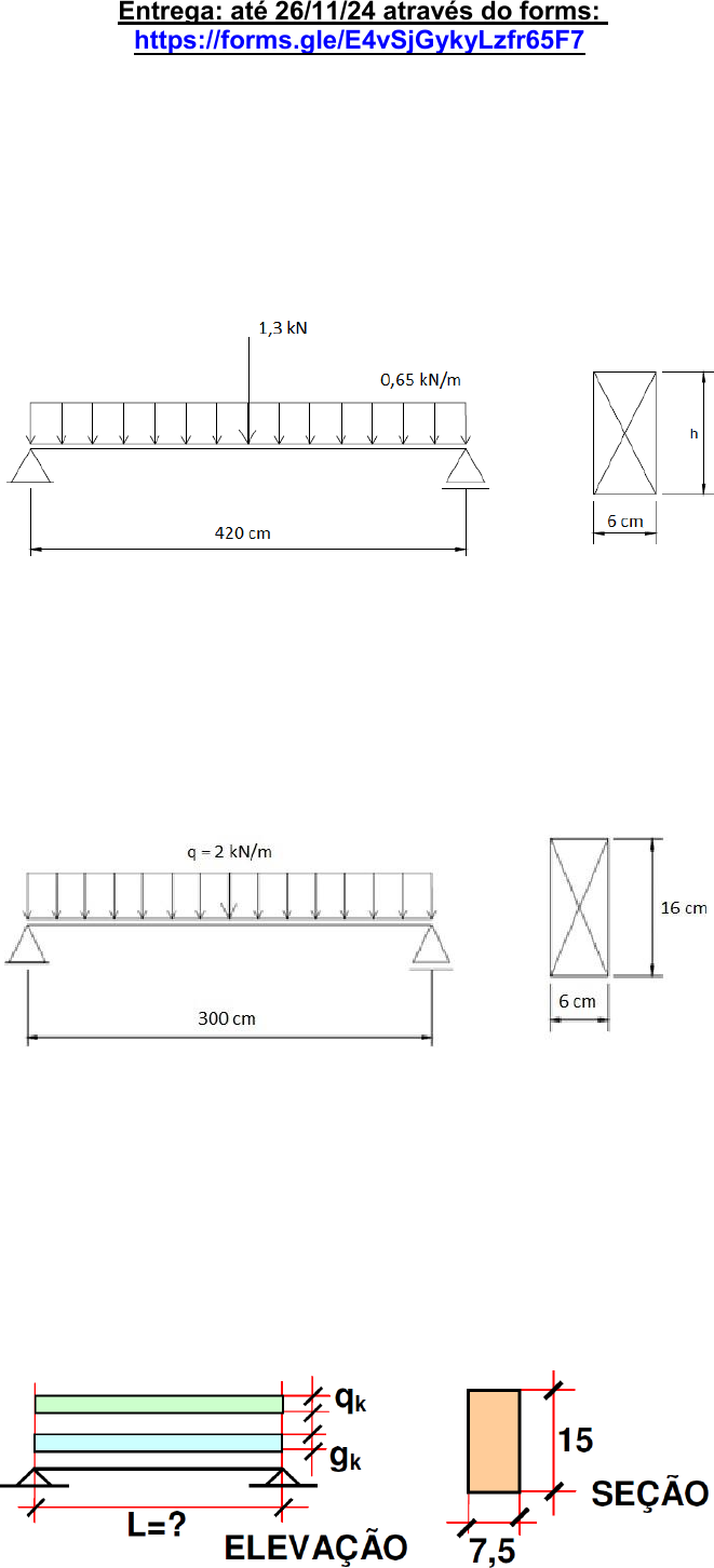 CURSO: ENGENHARIA CIVIL DISCIPLINA: ESTRUTURAS DE MADEIRAS E PROFESSORA: LUANA MARIS Entrega: até 26/11/24 através do forms: https://forms.gle/E4vSjGykyLzfr65F7 1. Calcular a altura necessária da viga de madeira abaixo, considerando situação duradoura de projeto, com carregamento de longa duração. Supor que a viga está travada ao longo de seu comprimento. Dados: Cargas permanentes, valores característicos. Madeira: Classe D40, serrada e ambiente classe de umidade 3. 2. Verificar se a viga de madeira indicada na figura satisfaz as condições de segurança (estados limites últimos e estados limites de utilização). Considerar contraventamentos laterais nas extremidades da viga e carregamento de longa duração. Dados: Cargas permanentes, valores característicos. Madeira: classe D30, serrada e ambiente classe de umidade 3. 3. Determinar o máximo valor do vão “L” da viga de madeira indicada nas figuras, sujeita à flexão simples reta, para que sejam respeitadas as condições de segurança (estados limites últimos e estados limites de utilização). Considerar contraventamentos laterais nas extremidades da viga e carregamento de longa duração. Dados: Esforços atuantes: gk = 0,4 kN/m (permanente), qk = 2,4 kN/m (sobrecarga, local sem elevada concentração de pessoas). Madeira: Classe D40, serrada e ambiente classe de umidade 3. https://forms.gle/E4vSjGykyLzfr65F7 Usuário Realce Usuário Realce CURSO: ENGENHARIA CIVIL DISCIPLINA: ESTRUTURAS DE MADEIRAS E PROFESSORA: LUANA MARIS 4. Determinar, para a viga de madeira abaixo, o máximo valor da carga uniforme distribuída “qk” que pode ser aplicada, considerando situação duradoura de projeto, com carregamento de longa duração. Supor que a viga está travada ao longo de seu comprimento. Dados: Esforços atuantes: gk = 2,0 kN/m (permanente), qk = ? kN/m (sobrecarga, local sem elevada concentração de pessoas). Madeira: Classe D60, serrada e ambiente classe de umidade 3. 5. Verificar se a viga de madeira indicada na figura satisfaz as condições de segurança (estados limites últimos e estados limites de utilização). Supor que a viga está travada ao longo de seu comprimento e carregamento de longa duração. Dados: Esforços atuantes: gk = 1,5 kN/m (permanente), Pk = 1,0 kN (sobrecarga, local sem elevada concentração de pessoas). Madeira: Classe D40, serrada e ambiente classe de umidade 3.