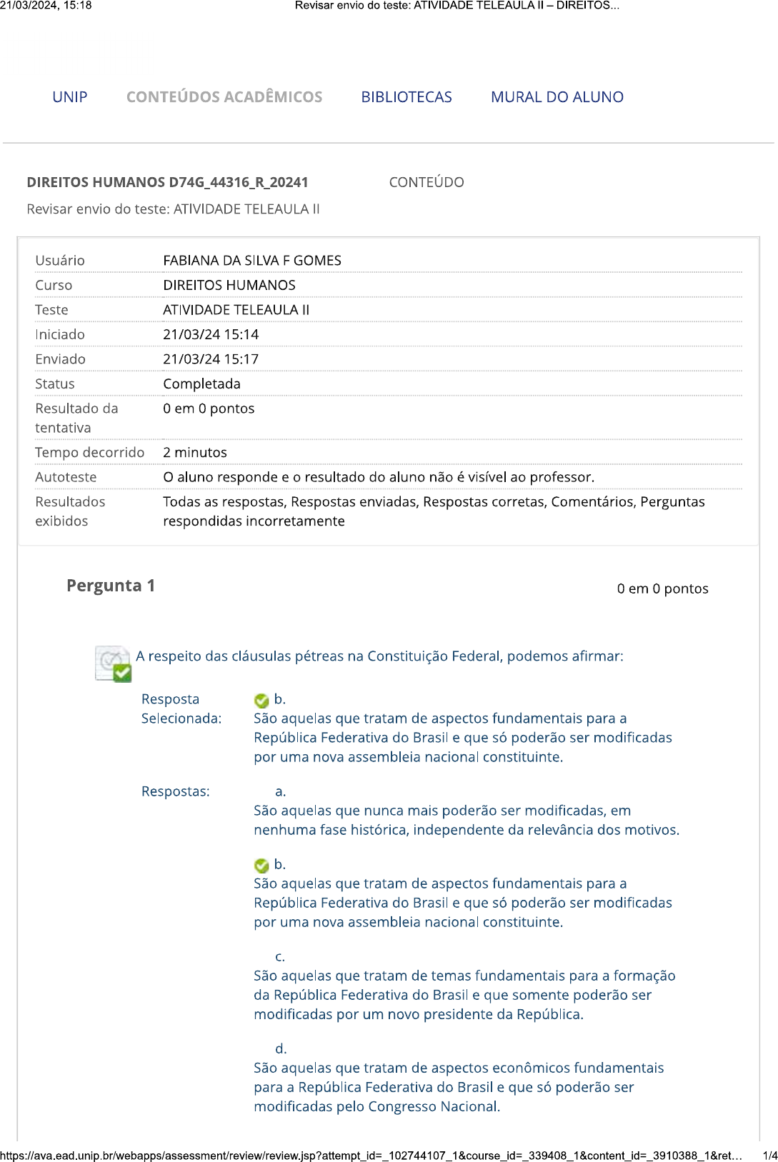 <p>21/03/2024, 15:18 Revisar envio do teste: ATIVIDADE TELEAULA - DIREITOS... UNIP CONTEÚDOS ACADÊMICOS BIBLIOTECAS MURAL DO ALUNO DIREITOS HUMANOS CONTEÚDO Revisar envio do teste: ATIVIDADE TELEAULA Usuário Curso DIREITOS HUMANOS Teste ATIVIDADE TELEAULA Iniciado 21/03/24 15:14 Enviado 21/03/24 15:17 Status Completada Resultado da 0 em 0 pontos tentativa Tempo decorrido 2 minutos Autoteste O aluno responde e o resultado do aluno não é visível ao professor. Resultados Todas as respostas, Respostas enviadas, Respostas corretas, Comentários, Perguntas exibidos respondidas incorretamente Pergunta 1 0 em 0 pontos A respeito das cláusulas pétreas na Constituição Federal, podemos afirmar: Resposta b. Selecionada: São aquelas que tratam de aspectos fundamentais para a República Federativa do Brasil e que só poderão ser modificadas por uma nova assembleia nacional constituinte. Respostas: a. São aquelas que nunca mais poderão ser modificadas, em nenhuma fase histórica, independente da relevância dos motivos. b. São aquelas que tratam de aspectos fundamentais para a República Federativa do Brasil e que só poderão ser modificadas por uma nova assembleia nacional constituinte. C. São aquelas que tratam de temas fundamentais para a formação da República Federativa do Brasil e que somente poderão ser modificadas por um novo presidente da República. d. São aquelas que tratam de aspectos econômicos fundamentais para a República Federativa do Brasil e que só poderão ser modificadas pelo Congresso Nacional. 1/4</p><p>21/03/2024, 15:18 Revisar envio do teste: ATIVIDADE TELEAULA - DIREITOS... e. São aquelas que tratam exclusivamente de direitos humanos e só poderão ser modificadas com concordância prévia e expressa da ONU. Comentário da resposta: Resposta: b) Pergunta 2 0 em 0 pontos Entre os direitos fundamentais elencados no artigo 5°, da Constituição Federal brasileira, podemos destacar: Resposta d. Selecionada: Direito à livre manifestação, direito de associação e direito à inviolabilidade do domicílio. Respostas: a. Direito do consumidor, direito de livre manifestação e direito de guiar veículo automotor. b. Direito a uma sociedade livre, justa e solidária. C. Direito de livre manifestação, direito de não ser torturado e direito de fornecimento de água e luz. d. Direito à livre manifestação, direito de associação e direito à inviolabilidade do domicílio. e. Direito de navegação, direito à iluminação e à segurança pública. Comentário da resposta: Resposta: d) Pergunta 3 0 em 0 pontos A Emenda Constitucional n. 45, de 2004, possibilitou a federalização de crimes graves contra direitos humanos, com objetivo de: 2/4</p><p>21/03/2024, 15:18 Revisar envio do teste: ATIVIDADE TELEAULA - DIREITOS... Resposta b. Selecionada: Permitir que órgãos de segurança federais atuem em casos nos quais a pressão sobre autoridades estaduais de segurança possam inviabilizar a correta apuração e punição. Respostas: a. Viabilizar a apuração desses crimes pelas autoridades federais que são as únicas capazes de solucioná-los. b. Permitir que órgãos de segurança federais atuem em casos nos quais a pressão sobre autoridades estaduais de segurança possam inviabilizar a correta apuração e punição. C. Impedir que as autoridades de segurança pública estaduais atuem porque elas não dispõem de capacidade técnica para esses casos. d. Fazer com que as autoridades federais trabalhem mais porque seus rendimentos são maiores. e. A determinação da Emenda Constitucional comprova que a federação é mais relevante que os estados federativos e, por isso, tem que ser ela a analisar todos os crimes contra direitos humanos. Comentário da resposta: Resposta: b) Pergunta 4 0 em 0 pontos Os Conselhos Municipais de Saúde, Educação e Tutelar de crianças e adolescentes, entre outros, são uma forma de: Resposta e. Selecionada: Efetivar a cidadania ativa e participativa, que deve ser exercida por todos os brasileiros e estrangeiros residentes regularmente no país de várias formas, inclusive pelo voto e pela participação em Conselhos de Direitos Sociais. Respostas: a. O Estado economizar recursos públicos na sua organização administrativa. b. Diminuir a pressão popular contra prefeitos e vereadores. C. Atribuir responsabilidade à população que já tem tantos problemas em sua vida. 3/4</p><p>21/03/2024, 15:18 Revisar envio do teste: ATIVIDADE TELEAULA - DIREITOS... d. Democratizar o acesso de cidadãos a recursos públicos e a escolha de como esses recursos deverão ser utilizados para garantia dos direitos sociais. e. Efetivar a cidadania ativa e participativa, que deve ser exercida por todos os brasileiros e estrangeiros residentes regularmente no país de várias formas, inclusive pelo voto e pela participação em Conselhos de Direitos Comentário da resposta: Resposta: e) OK Quinta-feira, 21 de Março de 2024 15h17min58s BRT 4/4</p>