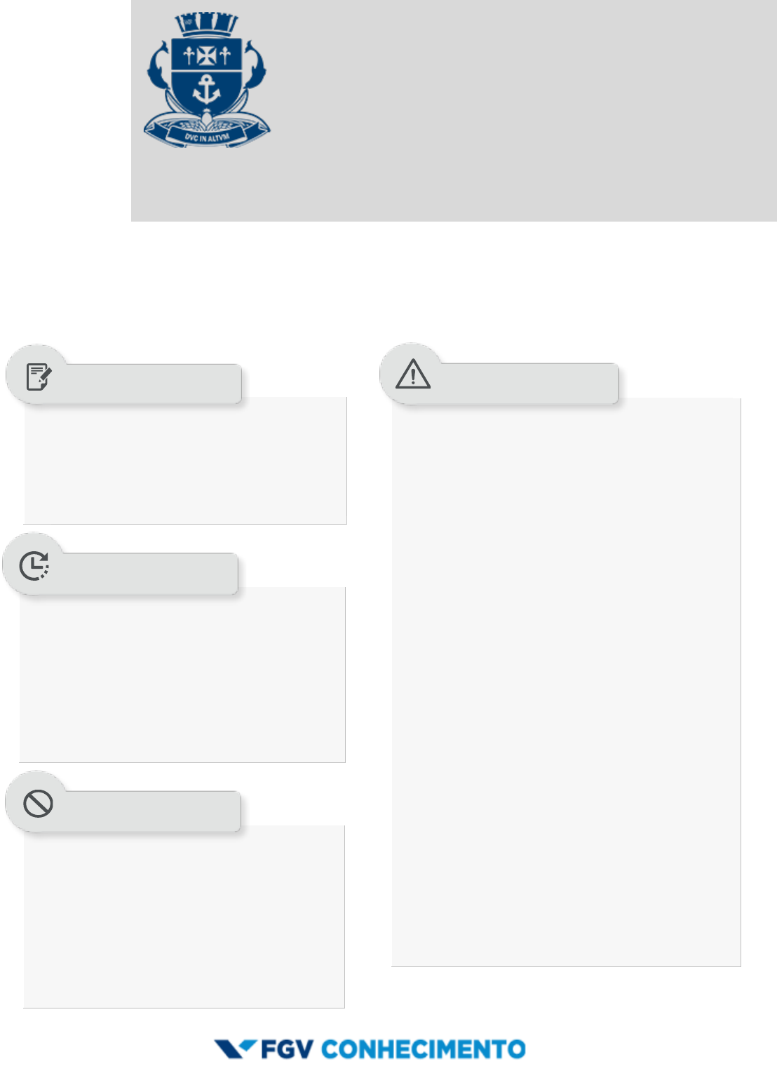 PREFEITURA DE CARAGUATATUBA CONCURSO PÚBLICO – EDITAL Nº 01/2023 MANHÃ CUIDADOR SOCIAL NÍVEL MÉDIO TIPO 1 – BRANCA Além deste caderno contendo 50 (cinquenta) questões objetivas, você receberá do fiscal de prova o cartão de respostas; As questões objetivas têm 5 (cinco) opções de resposta (A, B, C, D e E) e somente uma delas está correta. Verifique se seu caderno de questões está completo, sem repetição de questões ou falhas. Caso contrário, notifique imediatamente o fiscal da sala, para que sejam tomadas as devidas providências; Confira seus dados pessoais, especialmente nome, número de inscrição e documento de identidade e leia atentamente as instruções para preencher o cartão de respostas; Para o preenchimento do cartão de respostas, use somente caneta esferográfica, fabricada em material transparente, com tinta preta ou azul; Assine seu nome apenas no(s) espaço(s) reservado(s) no cartão de respostas; Confira seu cargo, cor e tipo do caderno de questões. Caso tenha recebido caderno de cargo ou cor ou tipo diferente do impresso em seu cartão de respostas, o fiscal deve ser obrigatoriamente informado para o devido registro na ata da sala; Reserve tempo suficiente para o preenchimento do seu cartão de respostas. O preenchimento é de sua responsabilidade e não será permitida a troca em caso de erro cometido pelo candidato; Para fins de avaliação, serão levadas em consideração apenas as marcações realizadas no cartão de respostas; A FGV coletará as impressões digitais dos candidatos na lista de presença; Os candidatos serão submetidos ao sistema de detecção de metais quando do ingresso e da saída de sanitários durante a realização das provas. Boa sorte! Você dispõe de 3 (três) horas para a realização da prova, já incluído o tempo para a marcação do cartão de respostas; 2 (duas) horas após o início da prova, é possível retirar-se da sala, sem levar o caderno de questões; A partir dos 30 (trinta) minutos anteriores ao término da prova é possível retirar-se da sala levando o caderno de questões. Qualquer tipo de comunicação entre os candidatos durante a aplicação da prova; Anotar informações relativas às respostas em qualquer outro meio que não seja o caderno de questões; Levantar da cadeira sem autorização do fiscal de sala; Usar o sanitário ao término da prova, após deixar a sala. SUA PROVA TEMPO NÃO SERÁ PERMITIDO INFORMAÇÕES GERAIS PREFEITURA DE CARAGUATATUBA FGV CONHECIMENTO CUIDADOR SOCIAL – MANHÃ TIPO BRANCA – PÁGINA 3 Conhecimentos Gerais Língua Portuguesa 1 Assinale a opção que apresenta o processo de construção que está identificado corretamente. (A) Processo anafórico: Ele vai indicar três soluções. Duas são simples de executar, mas a terceira apresentará problema. (B) Inversão sujeito e verbo: Há muita gente do lado de fora. (C) Passiva impessoal: Fizeram muita bagunça na festa. (D) Destaque de termo: Cabral, o descobridor, morreu cedo. (E) Tempo simultâneo: Logo que chegou, começou a espirrar. 2 Uma frase interrogativa é a que formula uma pergunta. Quando a resposta pode ser sim/não, dizemos que a interrogação é total, e, em caso contrário, parcial. Assinale a frase que mostra uma interrogação total. (A) O que você vai fazer neste final de semana? (B) Você, como eu, tem medo de escuridão? (C) Você está no vestibular para Medicina ou Enfermagem? (D) Para onde você vai amanhã de manhã? (E) Como você descobriu meu telefone? 3 Assinale a opção que apresenta a frase em que o sujeito está anteposto. (A) Na praia de Copacabana, são encontradas pessoas de todo o país. (B) No fundo da floresta vivia um lobo solitário. (C) Através da folhagem passavam os raios de sol. (D) A aldeia se encontrava a alguns quilômetros da cidade. (E) No fundo do vale corria um regato límpido. 4 Todas as frases a seguir permitem a inferência de um local em que estão inseridas; assinale a frase em que o local indicado está inadequado à frase. (A) Depois da refeição, minha mãe lava a louça na cozinha. / hotel. (B) O barulho dos aviões que decolam encobre a nossa voz. / aeroporto. (C) Estávamos famintos e ficamos contentes quando a garçonete se aproximou de nós. / restaurante. (D) Quando soa a campainha, os meninos correm para o pátio. / escola. (E) O motorista pede às crianças que se sentem antes de arrancar. / ônibus. 5 Em todos os exemplos a seguir há um termo sublinhado e um pronome que retoma esse mesmo termo; assinale a frase em que o pronome utilizado para a retomada pertence a um tipo diferente dos demais. (A) Joana encontrou um emprego dentro de sua especialidade. Ela vai começar amanhã de manhã. (B) O professor deixou-nos uma semana para terminar esse relatório. Ele precisará, no entanto, que ele seja feito dentro da teoria explicada. (C) Sílvio tomou o trem das 10 horas. Apesar disso, pode ser que ele chegue um pouco atrasado. (D) Miguel está preparando um doce de amêndoas e um pão com passas. Ele ainda precisa de ajuda para terminar a tempo. (E) O filme da equipe do Carlos era muito estático. O teu era muito mais dinâmico. 6 Assinale a frase que se mostra sem ambiguidade. (A) João e Roberto gostam de esportes de salão, mas o esporte que ele prefere é o volibol. (B) Emília e Marta mudam brevemente; ela vai morar pertinho de mim. (C) David e Filipe querem os dois participar da equipe de basquetebol, segundo um deles me disse. (D) Houve uma briga entre Chico e seu irmão. A discussão entre eles foi violenta e os dois foram separados. Só na manhã seguinte ele se desculpou. (E) Por causa da chuva torrencial Carla chegou à recepcionista da dentista com mais de 30 minutos de atraso; é claro que ela não estava nada contente. 7 Assinale a frase que se mostra corretamente estruturada. (A) Esta tarde passeamos pelas salas do museu. Só mais tarde decidimos retirar-nos de lá. (B) O conselho de administração do hospital recebeu as r