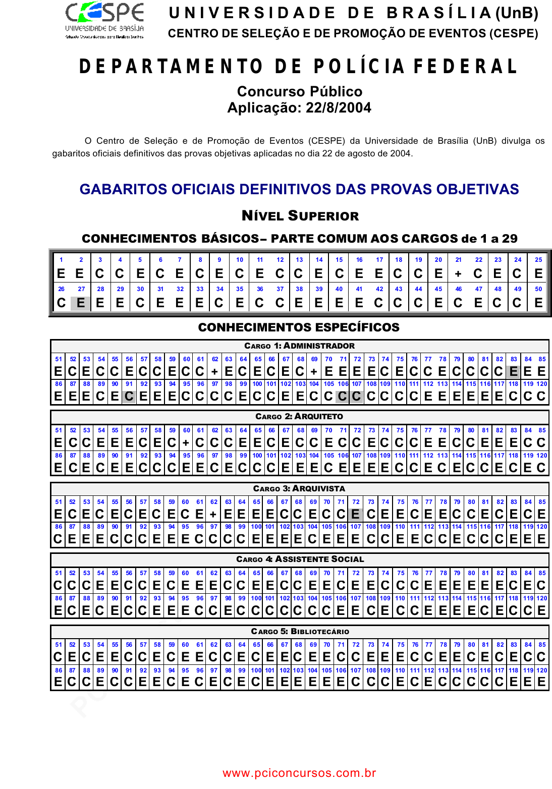 pcimarkpci MDAwMDowMDAwOjAwMDA6MDAwMDowMDAwOmZmZmY6YjNlYTo0YjMy:VGh1LCAxMCBPY3QgMjAyNCAxNjoyNjoxNCAtMDMwMA== www.pciconcursos.com.br U N I V E R S I D A D E D E B R A S Í L I A (UnB) CENTRO DE SELEÇÃO E DE PROMOÇÃO DE EVENTOS (CESPE) DEPARTAMENTO DE POLÍCIA FEDERAL Concurso Público Aplicação: 22/8/2004 O Centro de Seleção e de Promoção de Eventos (CESPE) da Universidade de Brasília (UnB) divulga os gabaritos oficiais definitivos das provas objetivas aplicadas no dia 22 de agosto de 2004. GABARITOS OFICIAIS DEFINITIVOS DAS PROVAS OBJETIVAS NÍVEL SUPERIOR CONHECIMENTOS BÁSICOS –– PARTE COMUM AOS CARGOS de 1 a 29 1 2 3 4 5 6 7 8 9 10 11 12 13 14 15 16 17 18 19 20 21 22 23 24 25 E E C C E C E C E C E C C E C E E C C E + C E C E 26 27 28 29 30 31 32 33 34 35 36 37 38 39 40 41 42 43 44 45 46 47 48 49 50 C E E E C E E E C E C C E E E E C C C E C E C C E CONHECIMENTOS ESPECÍFICOS CARGO 1: ADMINISTRADOR 51 52 53 54 55 56 57 58 59 60 61 62 63 64 65 66 67 68 69 70 71 72 73 74 75 76 77 78 79 80 81 82 83 84 85 E C E C C E C C E C C + E C E C E C + E E E E C E C C E C C C C E E E 86 87 88 89 90 91 92 93 94 95 96 97 98 99 100 101 102 103 104 105 106 107 108 109 110 111 112 113 114 115 116 117 118 119 120 E E E C E C E E E C C C C E C C E E C C C C C C C C E E E E E E C C C CARGO 2: ARQUITETO 51 52 53 54 55 56 57 58 59 60 61 62 63 64 65 66 67 68 69 70 71 72 73 74 75 76 77 78 79 80 81 82 83 84 85 E C C E E E C E C + C C C E E C E C C E C C E C C C E E C C E E E C C 86 87 88 89 90 91 92 93 94 95 96 97 98 99 100 101 102 103 104 105 106 107 108 109 110 111 112 113 114 115 116 117 118 119 120 E C E C E E C C C E E C E C C C E E E C E E E E C C E C E C C E C E C CARGO 3: ARQUIVISTA 51 52 53 54 55 56 57 58 59 60 61 62 63 64 65 66 67 68 69 70 71 72 73 74 75 76 77 78 79 80 81 82 83 84 85 E C E C E C E C E C E + E E E E C C E C C E C E E C E E C C E C E C E 86 87 88 89 90 91 92 93 94 95 96 97 98 99 100 101 102 103 104 105 106 107 108 109 110 111 112 113 114 115 116 117 118 119 120 C E E E C C C E E E C C C C E E E E C E E E C C E E C C E C C C E E E CARGO 4: ASSISTENTE SOCIAL 51 52 53 54 55 56 57 58 59 60 61 62 63 64 65 66 67 68 69 70 71 72 73 74 75 76 77 78 79 80 81 82 83 84 85 C C C E E C C E C E E E C C E E C C E E C E E C C C E E E E E E C E C 86 87 88 89 90 91 92 93 94 95 96 97 98 99 100 101 102 103 104 105 106 107 108 109 110 111 112 113 114 115 116 117 118 119 120 E C E C E C C E E E C C E C C C C C C C E E C E C C E E E E C E C C E CARGO 5: BIBLIOTECÁRIO 51 52 53 54 55 56 57 58 59 60 61 62 63 64 65 66 67 68 69 70 71 72 73 74 75 76 77 78 79 80 81 82 83 84 85 C E C E E C C E C E E C C E C E E C E E C C E E E C C E E C E C E C C 86 87 88 89 90 91 92 93 94 95 96 97 98 99 100 101 102 103 104 105 106 107 108 109 110 111 112 113 114 115 116 117 118 119 120 E C C E C C E E C E C E C E C E E E E E E C C C E C E C C C C C E E E www.pciconcursos.com.br pcimarkpci MDAwMDowMDAwOjAwMDA6MDAwMDowMDAwOmZmZmY6YjNlYTo0YjMy:VGh1LCAxMCBPY3QgMjAyNCAxNjoyNjoxNCAtMDMwMA== www.pciconcursos.com.br 2 CARGO 6: CONT ADOR 51 52 53 54 55 56 57 58 59 60 61 62 63 64 65 66 67 68 69 70 71 72 73 74 75 76 77 78 79 80 81 82 83 84 85 E C C C E E C C E E C E C E E C C E C E C C C E C C E E C C C E E C E 86 87 88 89 90 91 92 93 94 95 96 97 98 99 100 101 102 103 104 105 106 107 108 109 110 111 112 113 114 115 116 117 118 119 120 C C E C E C E E E E E E E E E E C C E C C E E C E E C C C E C E C E E CARGO 7: ENFERMEIRO 51 52 53 54 55 56 57 58 59 60 61 62 63 64 65 66 67 68 69 70 71 72 73 74 75 76 77 78 79 80 81 82 83 84 85 C C C E E E E C C E C C C C C E C C E E C C E E E E E E C E E C E C E 86 87 88 89 90 91 92 93 94 95 96 97 98 99 100 101 102 103 104 105 106 107 108 109 110 111 112 113 114 115 116 117 118 119 120 E E C E E C E C C E C C C C C E C C C E E C E E E C E C C C E C E E E CARGO 8: ENGENHEIRO CIVIL 51 52 53 54 55 56 57 58 59 60 61 62 63 64 65 66 67 68 69 70 71 72 73 74 75 76 77 78 79 80 81 82 83 84 85 C E E C E E E C E E C E E E E C C E C E E C C C C E C C E E E C E E C 86 87 88 89 90 91 92 93 94 95 96 97 98 99 100 101 102 103 104 105 106 107 108 109 110 111 112 113 114 115 116 117 118 119 120 C E C E C E C C C C E C C E C E C E C C E C C E E C E E E E C E C E C CARGO 9: ENGENHEIRO DE AERONAVES 51 52 53 54 55 56 57 58 59 60 61 62 63 64 65 66 67 68 69 70 71 72 73 74 75 76 77 78 79 80 81 82 83 84 85 E E E C C C C C C E C C E C E C E C C E C C E E C C E C C E C E C E E 86 87 88 89 90 91 92 93 94 95 96 97 98 99 100 101 102 103 104 105 106 107 108 109 110 111 112 113 114 115 116 117 118 119 120 C C C C E C C E E C C E C C C C C E E C C E E E C E C C C E C C C C E CARGO 10: ENGENHEIRO DE TELECOMUNICAÇÕES 51 52 53 54 55 56 57 58 59 60 61 62 63 64 65 66 67 68 69 70 71 72 73 74 75 76 77 78 79 80 81 82 83 84 85 E C C C E C C E C E C E C E E E C C E E E E E C C C C E E C E C E E E 86 87 88 89 90 91 92 93 94 95 96 97 98 99 100 101 102 103 104 105 106 107 108 109 110 111 112 113 114 115 116 117 118 119 120 C E E E E E C C C C E C C C E E C E E C E E C E C E C C E E C E E C E CARGO 11: ENGENHEIRO ELETRICISTA 51 52 53 54 55 56 57 58 59 60 61 62 63 64 65 66 67 68 69 70 71 72 73 74 75 76 77 78 79 80 81 82 83 84 85 C E E C C E E E C + C E E C E E C C C C E C E C E E C E E C E C E E C 86 87 88 89 90 91 92 93 94 95 96 97 98 99 100 101 102 103 104 105 106 107 108 109 110 111 112 113 114 115 116 117 118 119 120 C E E C E E C C E E E C E C C E E E C C E C C E C E C E E C C E E C E CARGO 12: ENGENHEIRO MECÂNICO 51 52 53 54 55 56 57 58 59 60 61 62 63 64 65 66 67 68 69 70 71 72 73 74 75 76 77 78 79 80 81 82 83 84 85 C E C C C E E E C E E C C E C E C C C E C E C C C E C E E C E E C C C 86 87 88 89 90 91 92 93 94 95 96 97 98 99 100 101 102 103 104 105 106 107 108 109 110 111 112 113 114 115 116 117 118 119 120 C E C E C C C C C C E E E E C C C E C C E E C C C E E C E C C E C E E CARGO 13: ESTATÍSTICO 51 52 53 54 55 56 57 58 59 60 61 62 63 64 65 66 67 68 69 70 71 72 73 74 75 76 77 78 79 80 81 82 83 84 85 E E E C E C C C E C E C E E E C C C E