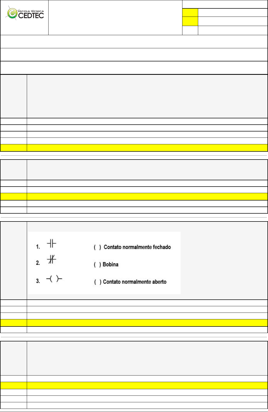 Pincel Atômico - 04/11/2024 19:02:10 1/7 WILLIAN APARECIDO SILVA Avaliação Online (SALA EAD) - Todos Capitulos/Referencias Atividade finalizada em 29/10/2024 11:35:40 (2944684 / 1) LEGENDA Resposta correta na questão # Resposta correta - Questão Anulada X Resposta selecionada pelo Aluno Disciplina: AUTOMAÇÃO ELÉTRICA [1044044] - Avaliação com 20 questões, com o peso total de 30,00 pontos [capítulos - Todos] Turma: Curso Técnico: Eletrotécnica - Grupo: FEVEREIRO/24 PRES - N.ELET.Fev.24 [115061] Aluno(a): 91575795 - WILLIAN APARECIDO SILVA - Respondeu 18 questões corretas, obtendo um total de 27,00 pontos como nota [350019_4260 ] Questão 001 Um sistema de controle de nível é composto dos seguintes componentes: • 01 x medidor de nível do tipo capacitivo amalógico • 02 x lâmpadas para sinalização de nível máximo e nível mínimo • 01 x chave de nível • 01 x válvula de controle proporcional • 02 x válvulas solenoide • 01 x botão de liga sistema Será utilizado um Controlador Lógico Programável (CLP) para realizar a automação do sistema. Com base nos componentes utilizados, o número de entradas digitais, saídas digitais, entradas analógicas e saídas analógicas são, respectivamente: 1, 2, 2, 3 3, 5, 0, 0 2, 2, 1, 3 1, 3, 2, 2 X 2, 4, 1, 1 [350019_1801 28] Questão 002 São definidas como um conjunto de dispositivos “inteligentes” que utilizam um protocolo de comunicação sobre um ou mais meios físicos para que o sistema funcione. Basicamente estes dispositivos são classificados em sensores, atuadores, controladores, interfaces e dispositivos específicos. Estas informações se referem a rede: Metropolitan Area Network (MAN) Local Area Network (LAN) X Home Area Networks” (HAN) Data Warehouse Wide Area Network (WAN) [350019_9391 ] Questão 003 A linguagem de relés é uma representação gráfica do programa do CLP que utiliza símbolos semelhantes aos esquemas de circuitos por relés. Numere a coluna da direita com base nos símbolos da coluna da esquerda. Assinale a sequência correta, de cima para baixo. 2,1,3 3,1,2 1,2,3 X 2,3,1 3,2,1 [350019_1801 17] Questão 004 A Domótica é a automatização e o controle aplicados à residência. Esta automatização e controle se realizam mediante o uso de equipamentos que dispõem de capacidade para se comunicar interativamente entre eles 1-( ) permite maior qualidade de vida 2-( ) aumenta o bem-estar e a segurança 3-( ) racionaliza o consumo de energia 4-( ) e não permite oferecer continuamente novas aplicações. Dentre as sentenças podemos definir: 1(F), 2 (V), 3(V), 4(F) X 1(V), 2 (V), 3(V), 4(F) 1(V), 2 (V), 3(V), 4(V) 1(F), 2 (F), 3(V), 4(F) 1(V), 2 (F), 3(V), 4(F) Pincel Atômico - 04/11/2024 19:02:10 2/7 [350019_1801 53] Questão 005 Uma das partes que compõem o elevador é o contrapeso cuja definição é: É o espaço físico da edificação formado por paredes verticais, fundo do poço e teto, acessado normalmente através das portas de pavimento, por onde se movimentam a cabina e o contrapeso. X Consiste em uma armação metálica formada por duas longarinas e dois cabeçotes, onde são fixados pesos. É o nome dado ao compartimento do edifício, destinado à colocação da máquina de tração, quadro de comando, painel seletor, limitador de velocidade, e de outros componentes da instalação do elevador. Mecanismo motorizado situado sobre a porta da cabina, garante abertura e fechamento das portas do elevador ao chegar no pavimento determinado, permitindo o embarque e o desembarque dos passageiros. É o local onde os passageiros entram, apertam o botão e vão para o andar solicitado. [350019_1800 87] Questão 006 Segundo MARCEL DE ROURE, ENGENHEIRO CHEFE NA LINCE/AUTOMAÇÃO E CONTROLE, a “Pirâmide de Automação Industrial” é uma boa forma de entender um pouco mais sobre a automação como um todo”. A figura a seguir mostra um esquema da pirâmide de automação industrial. Sobre a pirâmide de automação industrial, é CORRETO afirmar que: Reside em mostrar de forma não hierárquica a não-dependência de cada um dos níveis de controle e de trabalho existentes no setor industrial. É um diagrama que representa, de forma aleatória e interdependente, os 5 diferentes níveis de controle e trabalho em automação industrial. Reside em mostrar de forma hierárquica a não-dependência de cada um dos níveis de controle e de trabalho existentes no setor industrial. O nível 5 da pirâmide, gerenciamento corporativo, responsável pela administração dos recursos da empresa, pode tomar decisões independentemente dos resultados de cada um dos níveis da pirâmide. X É um diagrama que representa, de forma hierárquica, os 5 diferentes níveis de controle e trabalho em automação industrial. [350019_7199 8] Questão 007 Em uma aplicação de automação, foram levantados os seguintes elementos de campo que devem ser conectados aos cartões de E/S de um Controlador Lógico Programável: 04 botões intermitentes 03 sinaleiros 03 transmissores de pressão 04 interruptores 03 válvulas solenoides 03 sirenes 10 contatores 04 válvulas de abertura proporcional 03 chaves ﬕns-de-curso 08 contatos NA de contator Para essa aplicação, são necessárias as seguintes quantidades de pontos de E/S: X 19 entradas discretas, 3 entradas analógicas, 19 saídas discretas e 4 saídas analógicas. 22 entradas discretas, 3 entradas analógicas, 13 saídas discretas e 7 saídas analógicas. 19 entradas discretas, 4 entradas analógicas, 20 saídas discretas e 3 saídas analógicas. 16 entradas discretas, 6 entradas analógicas, 19 saídas discretas e 4 saídas analógicas. 18 entradas discretas, 4 entradas analógicas, 20 saídas discretas e 3 saídas analógicas. [350021_1800 99] Questão 008 Denominados relés de estado sólido ou estáticos, eles consistem em circuitos transistorizados que desempenham funções lógicas e de temporização. Alta velocidade de operação; carga consi
