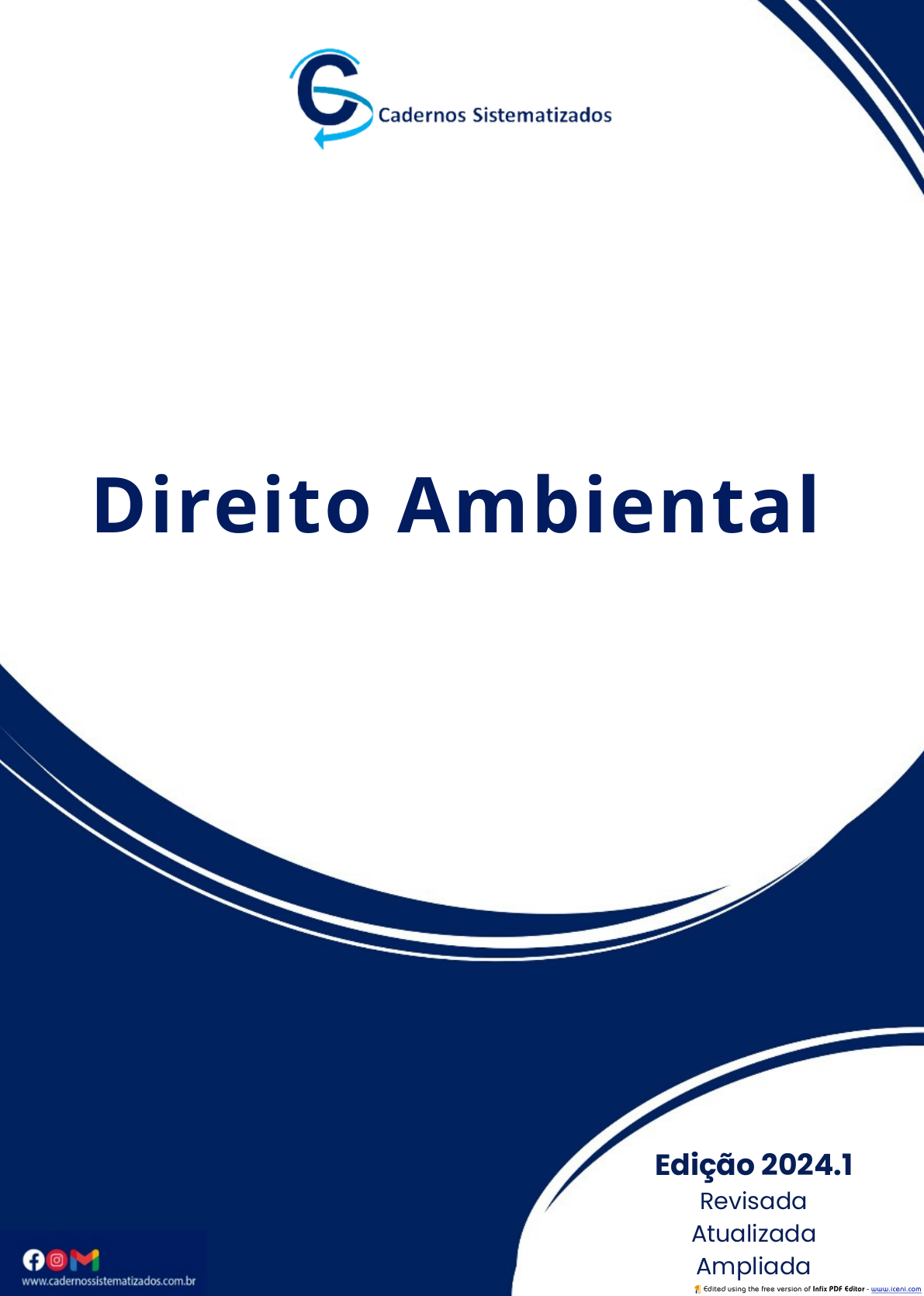 <p>Edição 2024.1</p><p>Revisada</p><p>Atualizada</p><p>Ampliada</p><p>Direito Ambiental</p><p>http://www.iceni.com/infix.htm</p><p>CADERNO DE DIREITO AMBIENTAL</p><p>APRESENTAÇÃO............................................................................................................................. 11</p><p>NOÇÕES INTRODUTÓRIAS ........................................................................................................... 12</p><p>1. REFORMULAÇÃO DOS VALORES REFERENTES AO MEIO AMBIENTE ............................ 12</p><p>2. EVOLUÇÃO DA PROTEÇÃO AO MEIO AMBIENTE NO BRASIL ........................................... 12</p><p>2.1. FASE INDIVIDUALISTA ...................................................................................................... 12</p><p>2.2. FASE FRAGMENTÁRIA ..................................................................................................... 12</p><p>2.3. FASE HOLÍSTICA ............................................................................................................... 13</p><p>3. EVOLUÇÃO DA PROTEÇÃO AO MEIO AMBIENTE INTERNACIONAL ................................. 13</p><p>3.1. CONFERÊNCIA MUNDIAL SOBRE O MEIO AMBIENTE HUMANO (1972) .................... 13</p><p>3.2. RELATÓRIO NOSSO FUTURO COMUM (1987) .............................................................. 14</p><p>3.3. CONFERÊNCIA MUNDIAL SOBRE MEIO AMBIENTE E DESENVOLVIMENTO (ECO/92</p><p>OU RIO/92) ..................................................................................................................................... 15</p><p>3.3.1. Agenda 21 .................................................................................................................... 15</p><p>3.3.2. Declaração do Rio ...................................................................................................... 15</p><p>3.3.3. Convenção-Quadro sobre Mudanças do Clima ..................................................... 15</p><p>3.3.4. Protocolo de Kyoto .................................................................................................... 15</p><p>3.3.5. Convenção sobre Diversidade Biológica................................................................ 16</p><p>3.3.6. Declaração de Florestas ........................................................................................... 16</p><p>3.4. CÚPULA MUNDIAL SOBRE DESENVOLVIMENTO SUSTENTÁVEL (RIO+10 – 2002) . 16</p><p>3.5. CÚPULA MUNDIAL SOBRE DESENVOLVIMENTO SUSTENTÁVEL (RIO+20 – 2012) . 16</p><p>3.6. ACORDO DE PARIS ........................................................................................................... 17</p><p>3.7. AGENDA 2030 PARA O DESENVOLVIMENTO SUSTENTÁVEL .................................... 18</p><p>4. OBJETO DO DIREITO AMBIENTAL ......................................................................................... 20</p><p>5. A CONSTITUIÇÃO FEDERAL DE 1988 E O MEIO AMBIENTE .............................................. 21</p><p>5.1. CONCEITO (LEGAL) DE MEIO AMBIENTE ...................................................................... 22</p><p>5.2. CLASSIFICAÇÃO DO MEIO AMBIENTE (JOSÉ AFONSO DA SILVA) ............................ 22</p><p>5.2.1. Meio ambiente natural (art. 225, §1º CF/88 c/c art. 3º, V Lei 6.938/81) ..................... 23</p><p>5.2.2. Meio ambiente artificial (ou construído) ...................................................................... 24</p><p>5.2.3. Meio ambiente cultural (art. 216 CF/88) ...................................................................... 25</p><p>5.2.4. Meio ambiente do trabalho (art. 200, VIII c/c art. 7º, XXII e XXIII CF/88) .................. 26</p><p>5.3. OUTRA CLASSIFICAÇÃO DO ART. 225 DA CF ............................................................... 26</p><p>5.4. ANÁLISE DO ART. 225 CF/88 ........................................................................................... 28</p><p>5.4.1. Art. 225, caput .............................................................................................................. 28</p><p>5.4.2. Art. 225, § 2º CF/88 ..................................................................................................... 30</p><p>5.4.3. Art. 225, § 1º CF/88 ..................................................................................................... 30</p><p>5.4.4. art. 225, §3º CF/88 ....................................................................................................... 41</p><p>5.4.5. Art. 225, §4º, da CF/88 ................................................................................................ 46</p><p>5.4.6. Art. 225, §5º, da CF ..................................................................................................... 47</p><p>5.4.7. Art. 225, §6º CF/88 ...................................................................................................... 47</p><p>http://www.iceni.com/infix.htm</p><p>CS - DIREITO AMBIENTAL 2024.1 2</p><p>5.4.8. Art. 225. §7º, da CF/88 ................................................................................................ 47</p><p>6. COMPETÊNCIAS CONSTITUCIONAIS EM MATÉRIA AMBIENTAL ...................................... 49</p><p>6.1. COMPETÊNCIA ADMINISTRATIVA .................................................................................. 49</p><p>6.2. COMPETÊNCIA ADMINISTRATIVA PARA LICENCIAMENTO AMBIENTAL: A</p><p>INCIDÊNCIA DA LC 140/11 ........................................................................................................... 50</p><p>6.3. COMPETÊNCIA LEGISLATIVA .......................................................................................... 52</p><p>7. PRINCÍPIOS DO MEIO AMBIENTE .......................................................................................... 56</p><p>7.1. PRINCÍPIO DO MEIO AMBIENTE ECOLOGICAMENTE EQUILIBRADO COMO UM</p><p>DIREITO FUNDAMENTAL (