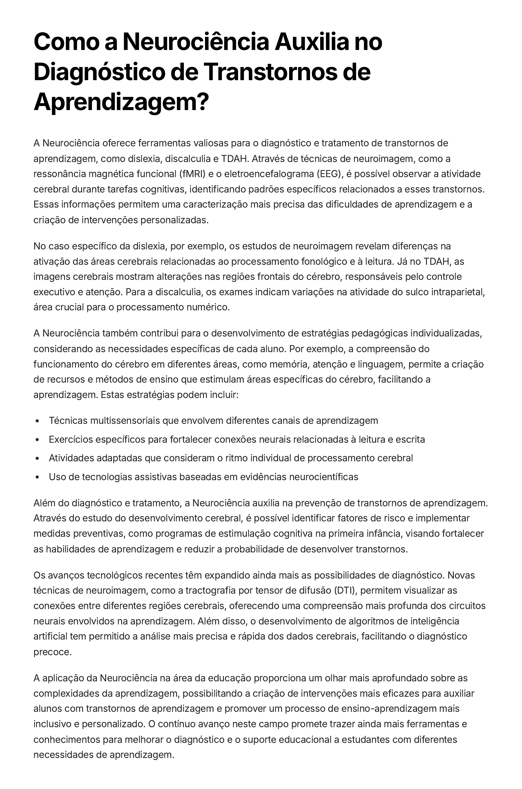 Como a Neurociência Auxilia no Diagnóstico de Transtornos de Aprendizagem? A Neurociência oferece ferramentas valiosas para o diagnóstico e tratamento de transtornos de aprendizagem, como dislexia, discalculia e TDAH. Através de técnicas de neuroimagem, como a ressonância magnética funcional (fMRI) e o eletroencefalograma (EEG), é possível observar a atividade cerebral durante tarefas cognitivas, identificando padrões específicos relacionados a esses transtornos. Essas informações permitem uma caracterização mais precisa das dificuldades de aprendizagem e a criação de intervenções personalizadas. No caso específico da dislexia, por exemplo, os estudos de neuroimagem revelam diferenças na ativação das áreas cerebrais relacionadas ao processamento fonológico e à leitura. Já no TDAH, as imagens cerebrais mostram alterações nas regiões frontais do cérebro, responsáveis pelo controle executivo e atenção. Para a discalculia, os exames indicam variações na atividade do sulco intraparietal, área crucial para o processamento numérico. A Neurociência também contribui para o desenvolvimento de estratégias pedagógicas individualizadas, considerando as necessidades específicas de cada aluno. Por exemplo, a compreensão do funcionamento do cérebro em diferentes áreas, como memória, atenção e linguagem, permite a criação de recursos e métodos de ensino que estimulam áreas específicas do cérebro, facilitando a aprendizagem. Estas estratégias podem incluir: Técnicas multissensoriais que envolvem diferentes canais de aprendizagem Exercícios específicos para fortalecer conexões neurais relacionadas à leitura e escrita Atividades adaptadas que consideram o ritmo individual de processamento cerebral Uso de tecnologias assistivas baseadas em evidências neurocientíficas Além do diagnóstico e tratamento, a Neurociência auxilia na prevenção de transtornos de aprendizagem. Através do estudo do desenvolvimento cerebral, é possível identificar fatores de risco e implementar medidas preventivas, como programas de estimulação cognitiva na primeira infância, visando fortalecer as habilidades de aprendizagem e reduzir a probabilidade de desenvolver transtornos. Os avanços tecnológicos recentes têm expandido ainda mais as possibilidades de diagnóstico. Novas técnicas de neuroimagem, como a tractografia por tensor de difusão (DTI), permitem visualizar as conexões entre diferentes regiões cerebrais, oferecendo uma compreensão mais profunda dos circuitos neurais envolvidos na aprendizagem. Além disso, o desenvolvimento de algoritmos de inteligência artificial tem permitido a análise mais precisa e rápida dos dados cerebrais, facilitando o diagnóstico precoce. A aplicação da Neurociência na área da educação proporciona um olhar mais aprofundado sobre as complexidades da aprendizagem, possibilitando a criação de intervenções mais eficazes para auxiliar alunos com transtornos de aprendizagem e promover um processo de ensino-aprendizagem mais inclusivo e personalizado. O contínuo avanço neste campo promete trazer ainda mais ferramentas e conhecimentos para melhorar o diagnóstico e o suporte educacional a estudantes com diferentes necessidades de aprendizagem.