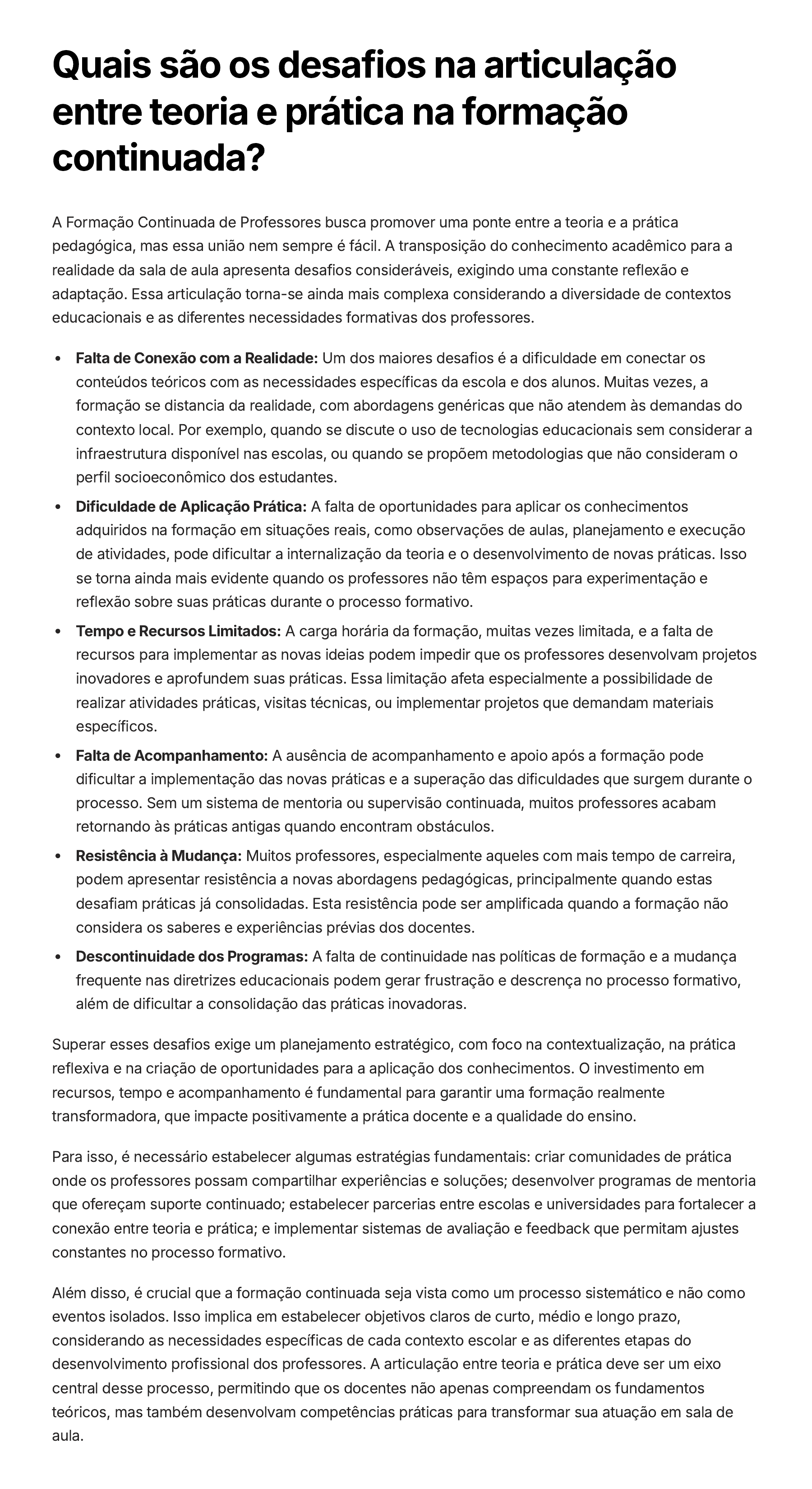 Quais são os desafios na articulação entre teoria e prática na formação continuada? A Formação Continuada de Professores busca promover uma ponte entre a teoria e a prática pedagógica, mas essa união nem sempre é fácil. A transposição do conhecimento acadêmico para a realidade da sala de aula apresenta desafios consideráveis, exigindo uma constante reflexão e adaptação. Essa articulação torna-se ainda mais complexa considerando a diversidade de contextos educacionais e as diferentes necessidades formativas dos professores. Falta de Conexão com a Realidade: Um dos maiores desafios é a dificuldade em conectar os conteúdos teóricos com as necessidades específicas da escola e dos alunos. Muitas vezes, a formação se distancia da realidade, com abordagens genéricas que não atendem às demandas do contexto local. Por exemplo, quando se discute o uso de tecnologias educacionais sem considerar a infraestrutura disponível nas escolas, ou quando se propõem metodologias que não consideram o perfil socioeconômico dos estudantes. Dificuldade de Aplicação Prática: A falta de oportunidades para aplicar os conhecimentos adquiridos na formação em situações reais, como observações de aulas, planejamento e execução de atividades, pode dificultar a internalização da teoria e o desenvolvimento de novas práticas. Isso se torna ainda mais evidente quando os professores não têm espaços para experimentação e reflexão sobre suas práticas durante o processo formativo. Tempo e Recursos Limitados: A carga horária da formação, muitas vezes limitada, e a falta de recursos para implementar as novas ideias podem impedir que os professores desenvolvam projetos inovadores e aprofundem suas práticas. Essa limitação afeta especialmente a possibilidade de realizar atividades práticas, visitas técnicas, ou implementar projetos que demandam materiais específicos. Falta de Acompanhamento: A ausência de acompanhamento e apoio após a formação pode dificultar a implementação das novas práticas e a superação das dificuldades que surgem durante o processo. Sem um sistema de mentoria ou supervisão continuada, muitos professores acabam retornando às práticas antigas quando encontram obstáculos. Resistência à Mudança: Muitos professores, especialmente aqueles com mais tempo de carreira, podem apresentar resistência a novas abordagens pedagógicas, principalmente quando estas desafiam práticas já consolidadas. Esta resistência pode ser amplificada quando a formação não considera os saberes e experiências prévias dos docentes. Descontinuidade dos Programas: A falta de continuidade nas políticas de formação e a mudança frequente nas diretrizes educacionais podem gerar frustração e descrença no processo formativo, além de dificultar a consolidação das práticas inovadoras. Superar esses desafios exige um planejamento estratégico, com foco na contextualização, na prática reflexiva e na criação de oportunidades para a aplicação dos conhecimentos. O investimento em recursos, tempo e acompanhamento é fundamental para garantir uma formação realmente transformadora, que impacte positivamente a prática docente e a qualidade do ensino. Para isso, é necessário estabelecer algumas estratégias fundamentais: criar comunidades de prática onde os professores possam compartilhar experiências e soluções; desenvolver programas de mentoria que ofereçam suporte continuado; estabelecer parcerias entre escolas e universidades para fortalecer a conexão entre teoria e prática; e implementar sistemas de avaliação e feedback que permitam ajustes constantes no processo formativo. Além disso, é crucial que a formação continuada seja vista como um processo sistemático e não como eventos isolados. Isso implica em estabelecer objetivos claros de curto, médio e longo prazo, considerando as necessidades específicas de cada contexto escolar e as diferentes etapas do desenvolvimento profissional dos professores. A articulação entre teoria e prática deve ser um eixo central desse processo, permitindo que os docentes não apenas compreendam os fundamentos teóricos, mas também desenvolvam competências práticas para transformar sua atuação em sala de aula.