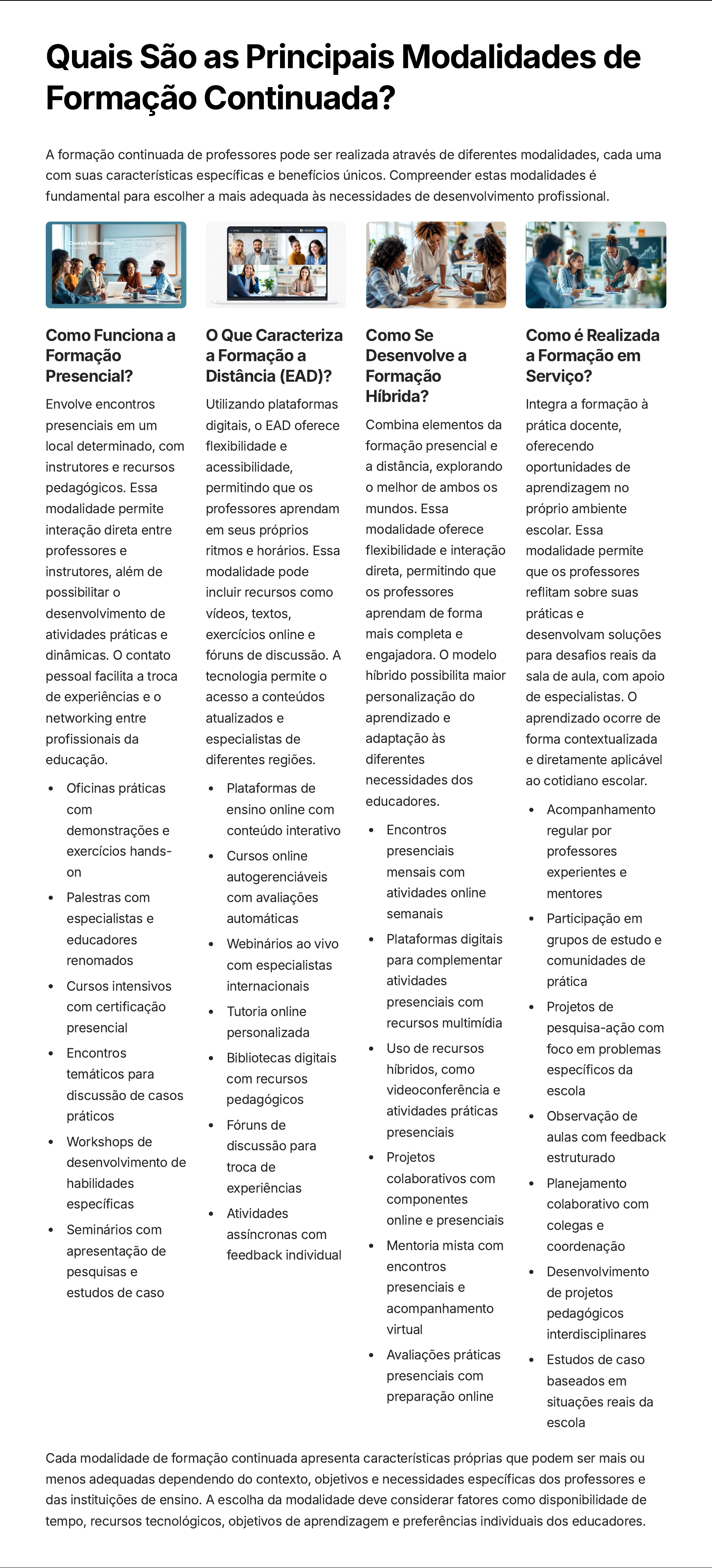 Quais São as Principais Modalidades de Formação Continuada? A formação continuada de professores pode ser realizada através de diferentes modalidades, cada uma com suas características específicas e benefícios únicos. Compreender estas modalidades é fundamental para escolher a mais adequada às necessidades de desenvolvimento profissional. Como Funciona a Formação Presencial? Envolve encontros presenciais em um local determinado, com instrutores e recursos pedagógicos. Essa modalidade permite interação direta entre professores e instrutores, além de possibilitar o desenvolvimento de atividades práticas e dinâmicas. O contato pessoal facilita a troca de experiências e o networking entre profissionais da educação. Oficinas práticas com demonstrações e exercícios hands- on Palestras com especialistas e educadores renomados Cursos intensivos com certificação presencial Encontros temáticos para discussão de casos práticos Workshops de desenvolvimento de habilidades específicas Seminários com apresentação de pesquisas e estudos de caso O Que Caracteriza a Formação a Distância (EAD)? Utilizando plataformas digitais, o EAD oferece flexibilidade e acessibilidade, permitindo que os professores aprendam em seus próprios ritmos e horários. Essa modalidade pode incluir recursos como vídeos, textos, exercícios online e fóruns de discussão. A tecnologia permite o acesso a conteúdos atualizados e especialistas de diferentes regiões. Plataformas de ensino online com conteúdo interativo Cursos online autogerenciáveis com avaliações automáticas Webinários ao vivo com especialistas internacionais Tutoria online personalizada Bibliotecas digitais com recursos pedagógicos Fóruns de discussão para troca de experiências Atividades assíncronas com feedback individual Como Se Desenvolve a Formação Híbrida? Combina elementos da formação presencial e a distância, explorando o melhor de ambos os mundos. Essa modalidade oferece flexibilidade e interação direta, permitindo que os professores aprendam de forma mais completa e engajadora. O modelo híbrido possibilita maior personalização do aprendizado e adaptação às diferentes necessidades dos educadores. Encontros presenciais mensais com atividades online semanais Plataformas digitais para complementar atividades presenciais com recursos multimídia Uso de recursos híbridos, como videoconferência e atividades práticas presenciais Projetos colaborativos com componentes online e presenciais Mentoria mista com encontros presenciais e acompanhamento virtual Avaliações práticas presenciais com preparação online Como é Realizada a Formação em Serviço? Integra a formação à prática docente, oferecendo oportunidades de aprendizagem no próprio ambiente escolar. Essa modalidade permite que os professores reflitam sobre suas práticas e desenvolvam soluções para desafios reais da sala de aula, com apoio de especialistas. O aprendizado ocorre de forma contextualizada e diretamente aplicável ao cotidiano escolar. Acompanhamento regular por professores experientes e mentores Participação em grupos de estudo e comunidades de prática Projetos de pesquisa-ação com foco em problemas específicos da escola Observação de aulas com feedback estruturado Planejamento colaborativo com colegas e coordenação Desenvolvimento de projetos pedagógicos interdisciplinares Estudos de caso baseados em situações reais da escola Cada modalidade de formação continuada apresenta características próprias que podem ser mais ou menos adequadas dependendo do contexto, objetivos e necessidades específicas dos professores e das instituições de ensino. A escolha da modalidade deve considerar fatores como disponibilidade de tempo, recursos tecnológicos, objetivos de aprendizagem e preferências individuais dos educadores.