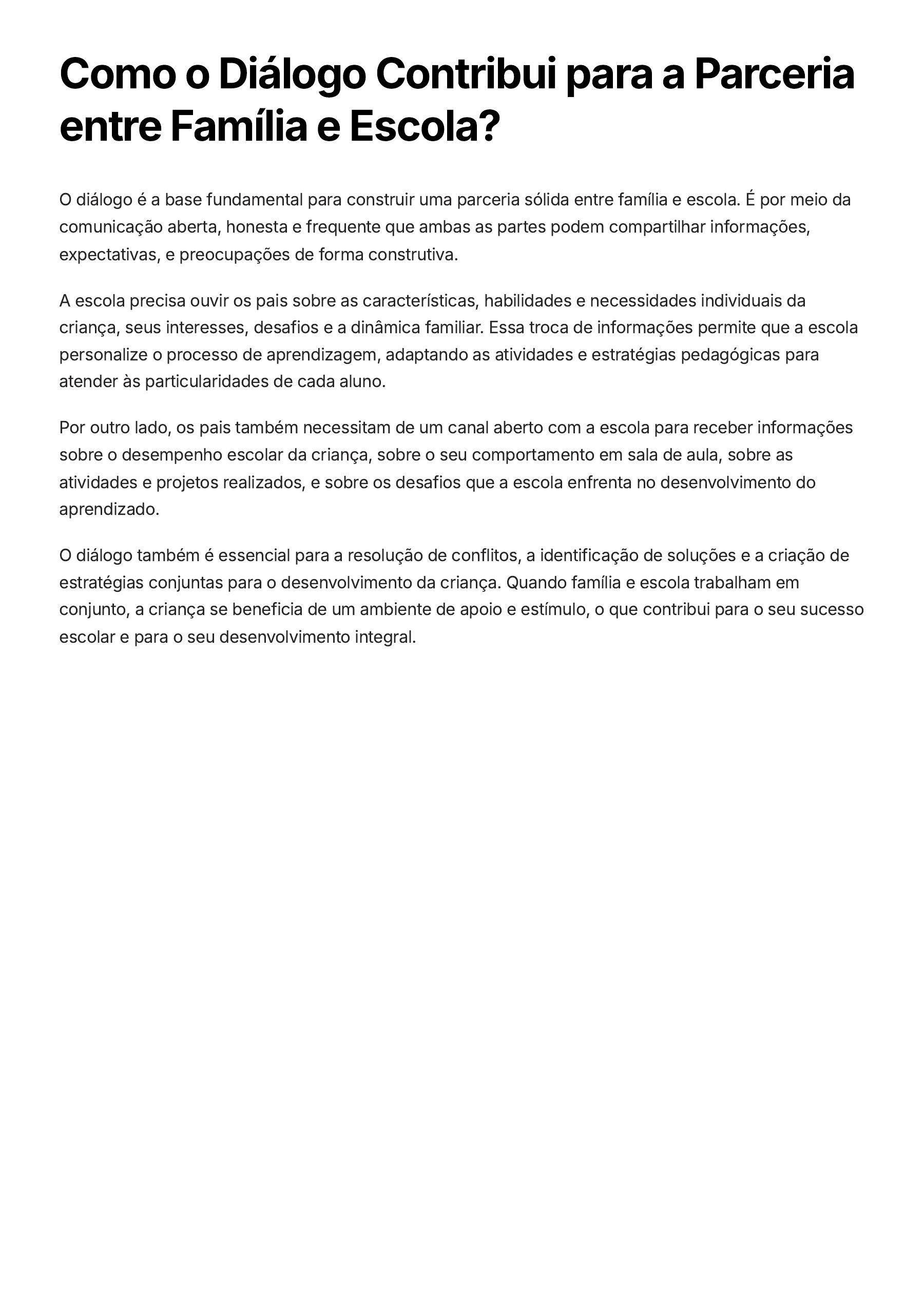 Como o Diálogo Contribui para a Parceria entre Família e Escola? O diálogo é a base fundamental para construir uma parceria sólida entre família e escola. É por meio da comunicação aberta, honesta e frequente que ambas as partes podem compartilhar informações, expectativas, e preocupações de forma construtiva. A escola precisa ouvir os pais sobre as características, habilidades e necessidades individuais da criança, seus interesses, desafios e a dinâmica familiar. Essa troca de informações permite que a escola personalize o processo de aprendizagem, adaptando as atividades e estratégias pedagógicas para atender às particularidades de cada aluno. Por outro lado, os pais também necessitam de um canal aberto com a escola para receber informações sobre o desempenho escolar da criança, sobre o seu comportamento em sala de aula, sobre as atividades e projetos realizados, e sobre os desafios que a escola enfrenta no desenvolvimento do aprendizado. O diálogo também é essencial para a resolução de conflitos, a identificação de soluções e a criação de estratégias conjuntas para o desenvolvimento da criança. Quando família e escola trabalham em conjunto, a criança se beneficia de um ambiente de apoio e estímulo, o que contribui para o seu sucesso escolar e para o seu desenvolvimento integral. Como a Cultura Familiar Influencia o Processo de Aprendizagem? A cultura familiar desempenha um papel fundamental no desenvolvimento da criança e no seu processo de aprendizagem. Os valores, crenças, hábitos e costumes transmitidos dentro do lar moldam a maneira como a criança se relaciona com o mundo, com a escola e com o conhecimento. A cultura familiar influencia diretamente o desempenho escolar da criança em diversos aspectos. O estímulo à leitura, a valorização da educação, o interesse por diferentes áreas do conhecimento e a criação de um ambiente propício ao estudo são fatores cruciais para o desenvolvimento do aprendizado. Famílias que incentivam a curiosidade, o questionamento e a busca por novos saberes, criam um ambiente que favorece a autonomia, a criatividade e a capacidade de solucionar problemas. O diálogo, a participação em atividades culturais e a valorização da leitura são pilares para a construção de uma cultura familiar que estimula a aprendizagem. Por outro lado, culturas familiares que desvalorizam a educação, priorizam o trabalho em detrimento do estudo ou que apresentam dificuldades socioeconômicas, podem impactar negativamente o desempenho escolar. Nesses casos, a escola assume um papel ainda mais importante, buscando oferecer oportunidades de acesso ao conhecimento e apoio às famílias. Como a família e a escola podem trabalhar juntas na educação? A educação de uma criança é um processo complexo que exige a colaboração de diversos agentes, sendo a família e a escola os pilares fundamentais. A responsabilidade compartilhada entre esses dois atores é crucial para o sucesso do desenvolvimento da criança, tanto no âmbito acadêmico como socioemocional. Apoio mútuo: A família e a escola devem trabalhar em conjunto para oferecer um ambiente propício à aprendizagem e ao crescimento. A escola fornece conhecimento e ferramentas pedagógicas, enquanto a família oferece suporte emocional, afetivo e moral. O diálogo constante entre pais e professores é fundamental para criar um elo de confiança e colaboração. Participação ativa: É fundamental que os pais se envolvam ativamente no processo educacional dos filhos, acompanhando as atividades escolares, participando de reuniões, eventos e atividades extracurriculares. Essa participação demonstra interesse e apoio, além de criar um canal de comunicação aberto com a escola. Responsabilidade pelos valores e comportamentos: A família é responsável por transmitir valores e princípios éticos que contribuem para a formação do caráter da criança. A escola, por sua vez, complementa esse processo, promovendo atividades e práticas pedagógicas que reforçam esses valores. Criação de um ambiente positivo: A família e a escola devem criar um ambiente positivo e encorajador para a criança. A escola deve oferecer um espaço seguro e acolhedor para que a criança se sinta motivada a aprender e a se desenvolver. A família, por sua vez, deve demonstrar apoio e incentivo, celebrando os sucessos e auxiliando em momentos de dificuldade. Quando a família e a escola trabalham juntas, em sintonia, a criança se beneficia de um sistema de apoio sólido e consistente, que contribui para seu desenvolvimento integral, preparando-a para o futuro com mais segurança e confiança.