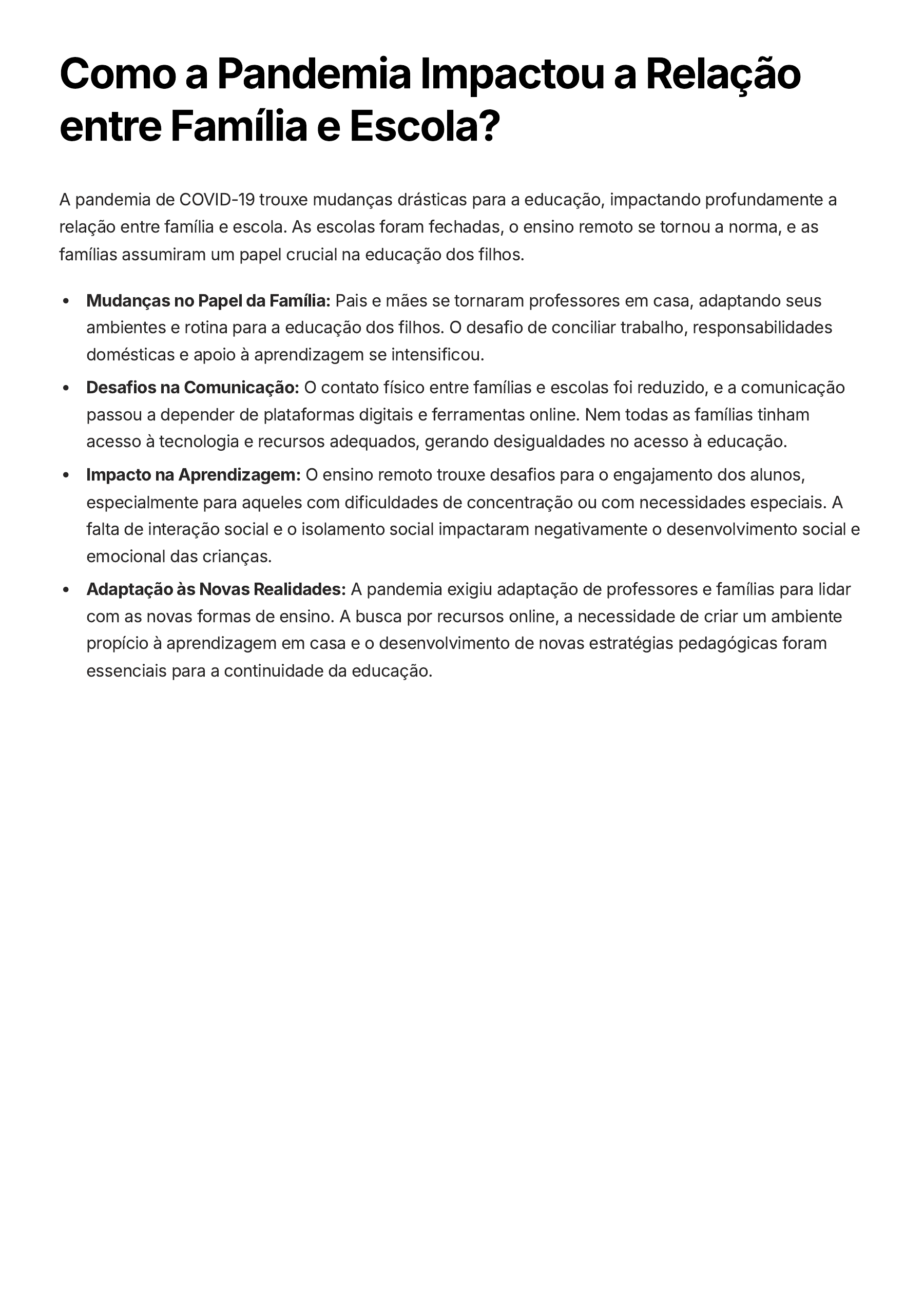Como a Pandemia Impactou a Relação entre Família e Escola? A pandemia de COVID-19 trouxe mudanças drásticas para a educação, impactando profundamente a relação entre família e escola. As escolas foram fechadas, o ensino remoto se tornou a norma, e as famílias assumiram um papel crucial na educação dos filhos. Mudanças no Papel da Família: Pais e mães se tornaram professores em casa, adaptando seus ambientes e rotina para a educação dos filhos. O desafio de conciliar trabalho, responsabilidades domésticas e apoio à aprendizagem se intensificou. Desafios na Comunicação: O contato físico entre famílias e escolas foi reduzido, e a comunicação passou a depender de plataformas digitais e ferramentas online. Nem todas as famílias tinham acesso à tecnologia e recursos adequados, gerando desigualdades no acesso à educação. Impacto na Aprendizagem: O ensino remoto trouxe desafios para o engajamento dos alunos, especialmente para aqueles com dificuldades de concentração ou com necessidades especiais. A falta de interação social e o isolamento social impactaram negativamente o desenvolvimento social e emocional das crianças. Adaptação às Novas Realidades: A pandemia exigiu adaptação de professores e famílias para lidar com as novas formas de ensino. A busca por recursos online, a necessidade de criar um ambiente propício à aprendizagem em casa e o desenvolvimento de novas estratégias pedagógicas foram essenciais para a continuidade da educação. Como a Família Pode Apoiar os Filhos Durante as Transições entre Etapas Escolares? A transição entre etapas escolares, como da Educação Infantil para o Ensino Fundamental, ou do Ensino Fundamental para o Ensino Médio, representa um momento crucial no desenvolvimento da criança. É nesse período que ela enfrenta novos desafios, como a adaptação a um ambiente escolar diferente, a relação com novos professores e colegas, e o aumento da carga de trabalho e responsabilidade. Nesse contexto, o papel da família é fundamental para garantir que a criança tenha uma experiência positiva e tranquila durante a transição. O acompanhamento e o apoio dos pais podem fazer toda a diferença para que a criança se sinta segura e confiante para enfrentar os novos desafios que surgirão. Como a Família Pode Ajudar Existem diversas formas pelas quais a família pode auxiliar a criança na transição entre etapas escolares. É essencial que os pais demonstrem interesse e estejam presentes nesse processo, mostrando que estão ali para apoiá-la. Alguns exemplos de como a família pode ajudar: Conversar com a criança sobre a nova etapa, explicando as mudanças que acontecerão e os desafios que ela poderá enfrentar. Visitar a nova escola com a criança antes do início das aulas, para que ela possa se familiarizar com o ambiente e conhecer seus novos professores e colegas. Incentivar a criança a participar das atividades da escola, mostrando que acreditam em sua capacidade de superar os desafios. Ajudar a criança a organizar seus materiais escolares, garantindo que ela tenha tudo o que precisa para começar a nova etapa com tranquilidade. Estar em contato com a escola, acompanhando o desempenho da criança e participando das reuniões e eventos organizados pela instituição. O apoio da família é fundamental para que a criança se sinta segura e confiante durante a transição entre etapas escolares. Com a orientação e o suporte dos pais, a criança poderá enfrentar os novos desafios com mais tranquilidade e aproveitar ao máximo as oportunidades que a nova etapa oferece. Como a escola pode orientar as famílias sobre o desenvolvimento infantil? A escola desempenha um papel fundamental na orientação das famílias sobre o desenvolvimento infantil, atuando como um parceiro crucial na jornada educacional da criança. As instituições de ensino possuem expertise em compreender as diferentes fases do desenvolvimento, desde a primeira infância até a adolescência, e podem oferecer aos pais e responsáveis informações valiosas sobre as características, necessidades e desafios de cada etapa. Orientação sobre o desenvolvimento físico, cognitivo e socioemocional: A escola pode fornecer aos pais informações sobre marcos de desenvolvimento, como a aquisição da linguagem, o desenvolvimento da motricidade fina e grossa, a capacidade de resolução de problemas e o desenvolvimento da autoestima e da empatia. Compartilhamento de estratégias de apoio: A equipe escolar, incluindo professores, psicopedagogos e outros profissionais, pode oferecer dicas práticas para os pais sobre como estimular o desenvolvimento da criança em casa, como brincar de forma educativa, criar um ambiente propício à aprendizagem e lidar com desafios comportamentais. Identificação de sinais de alerta: A escola pode auxiliar na identificação de possíveis dificuldades de aprendizagem, problemas emocionais ou de comportamento que a criança possa apresentar, encaminhando os pais para profissionais especializados quando necessário. Promoção de um ambiente de aprendizagem positivo: A escola tem um papel crucial na criação de um ambiente escolar positivo e acolhedor, incentivando a participação dos pais e promovendo a comunicação aberta e transparente entre a família e a instituição. A comunicação aberta e constante entre a escola e a família é essencial para o sucesso do processo de aprendizagem da criança. A escola deve estar preparada para oferecer suporte e orientação às famílias, promovendo um ambiente de colaboração e parceria para o desenvolvimento integral da criança.