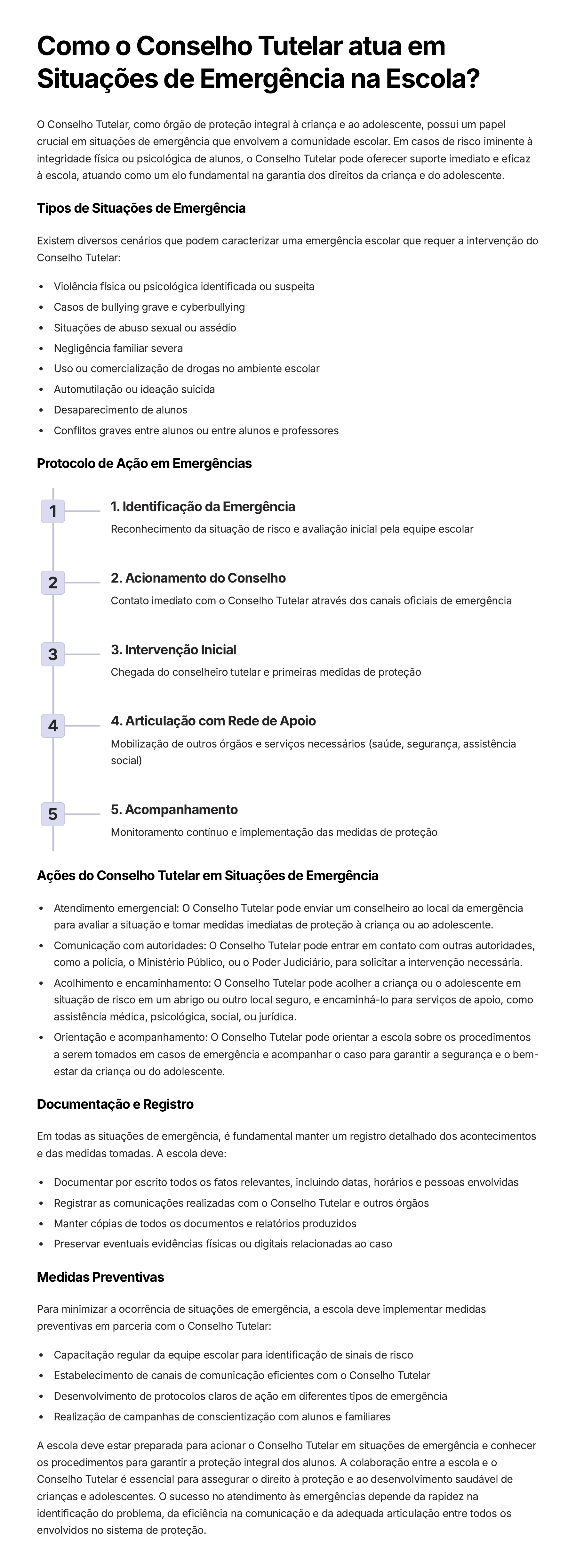 Como o Conselho Tutelar atua em Situações de Emergência na Escola? O Conselho Tutelar, como órgão de proteção integral à criança e ao adolescente, possui um papel crucial em situações de emergência que envolvem a comunidade escolar. Em casos de risco iminente à integridade física ou psicológica de alunos, o Conselho Tutelar pode oferecer suporte imediato e eficaz à escola, atuando como um elo fundamental na garantia dos direitos da criança e do adolescente. Tipos de Situações de Emergência Existem diversos cenários que podem caracterizar uma emergência escolar que requer a intervenção do Conselho Tutelar: Violência física ou psicológica identificada ou suspeita Casos de bullying grave e cyberbullying Situações de abuso sexual ou assédio Negligência familiar severa Uso ou comercialização de drogas no ambiente escolar Automutilação ou ideação suicida Desaparecimento de alunos Conflitos graves entre alunos ou entre alunos e professores Protocolo de Ação em Emergências 1 1. Identificação da Emergência Reconhecimento da situação de risco e avaliação inicial pela equipe escolar 2 2. Acionamento do Conselho Contato imediato com o Conselho Tutelar através dos canais oficiais de emergência 3 3. Intervenção Inicial Chegada do conselheiro tutelar e primeiras medidas de proteção 4 4. Articulação com Rede de Apoio Mobilização de outros órgãos e serviços necessários (saúde, segurança, assistência social) 5 5. Acompanhamento Monitoramento contínuo e implementação das medidas de proteção Ações do Conselho Tutelar em Situações de Emergência Atendimento emergencial: O Conselho Tutelar pode enviar um conselheiro ao local da emergência para avaliar a situação e tomar medidas imediatas de proteção à criança ou ao adolescente. Comunicação com autoridades: O Conselho Tutelar pode entrar em contato com outras autoridades, como a polícia, o Ministério Público, ou o Poder Judiciário, para solicitar a intervenção necessária. Acolhimento e encaminhamento: O Conselho Tutelar pode acolher a criança ou o adolescente em situação de risco em um abrigo ou outro local seguro, e encaminhá-lo para serviços de apoio, como assistência médica, psicológica, social, ou jurídica. Orientação e acompanhamento: O Conselho Tutelar pode orientar a escola sobre os procedimentos a serem tomados em casos de emergência e acompanhar o caso para garantir a segurança e o bem- estar da criança ou do adolescente. Documentação e Registro Em todas as situações de emergência, é fundamental manter um registro detalhado dos acontecimentos e das medidas tomadas. A escola deve: Documentar por escrito todos os fatos relevantes, incluindo datas, horários e pessoas envolvidas Registrar as comunicações realizadas com o Conselho Tutelar e outros órgãos Manter cópias de todos os documentos e relatórios produzidos Preservar eventuais evidências físicas ou digitais relacionadas ao caso Medidas Preventivas Para minimizar a ocorrência de situações de emergência, a escola deve implementar medidas preventivas em parceria com o Conselho Tutelar: Capacitação regular da equipe escolar para identificação de sinais de risco Estabelecimento de canais de comunicação eficientes com o Conselho Tutelar Desenvolvimento de protocolos claros de ação em diferentes tipos de emergência Realização de campanhas de conscientização com alunos e familiares A escola deve estar preparada para acionar o Conselho Tutelar em situações de emergência e conhecer os procedimentos para garantir a proteção integral dos alunos. A colaboração entre a escola e o Conselho Tutelar é essencial para assegurar o direito à proteção e ao desenvolvimento saudável de crianças e adolescentes. O sucesso no atendimento às emergências depende da rapidez na identificação do problema, da eficiência na comunicação e da adequada articulação entre todos os envolvidos no sistema de proteção.
