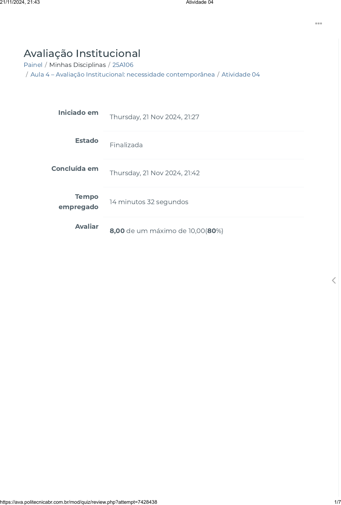Painel / Minhas Disciplinas / 25A106 / Aula 4 – Avaliação Institucional: necessidade contemporânea / Atividade 04 Avaliação Institucional Iniciado em Thursday, 21 Nov 2024, 21:27 Estado Finalizada Concluída em Thursday, 21 Nov 2024, 21:42 Tempo empregado 14 minutos 32 segundos Avaliar 8,00 de um máximo de 10,00(80%) 21/11/2024, 21:43 Atividade 04 https://ava.politecnicabr.com.br/mod/quiz/review.php?attempt=7428438 1/7 https://ava.politecnicabr.com.br/my/ https://ava.politecnicabr.com.br/my/ https://ava.politecnicabr.com.br/course/view.php?id=989 https://ava.politecnicabr.com.br/course/view.php?id=989#section-6 https://ava.politecnicabr.com.br/mod/quiz/view.php?id=26683 https://ava.politecnicabr.com.br/ Questão 1 Incorreto Atingiu 0,00 de 2,00 O ENADE é composto de quatro diferentes instrumentos para a coleta de dados. Não faz parte desses instrumentos a opção: Escolha uma opção: a. Questionário sobre o per�l socioeconômico-educacional do aluno (em caderno próprio e de preenchimento voluntário). b. Os testes. c. Questionário a ser respondido pelo coordenador de curso, no qual são solicitadas as impressões sobre o projeto pedagógico e as condições gerais de ensino de seu curso. d. Questionário sobre a percepção dos docentes sobre o teste. 21/11/2024, 21:43 Atividade 04 https://ava.politecnicabr.com.br/mod/quiz/review.php?attempt=7428438 2/7 https://ava.politecnicabr.com.br/ Questão 2 Correto Atingiu 2,00 de 2,00 Complete: O processo de ______________ tem seu sentido ampliado quando os resultados são analisados e as decisões são tomadas de maneira e�ciente e rápida, oferecendo subsídio para novas formas de organizar o _________________. Escolha uma opção: a. avaliação institucional; trabalho institucional. b. trabalho institucional; avaliação institucional. c. avaliação pedagógica; trabalho pedagógico. d. trabalho pedagógico; processo pedagógico. 21/11/2024, 21:43 Atividade 04 https://ava.politecnicabr.com.br/mod/quiz/review.php?attempt=7428438 3/7 https://ava.politecnicabr.com.br/ Questão 3 Correto Atingiu 1,50 de 1,50 Podemos a�rmar que buscar transparência e equidade, mesmo com desenhos e métodos que se apresentam frágeis ou pouco democráticos, (ou mesmo super�ciais e pouco con�áveis), já revelam a ampliação do pensamento avaliativo no Brasil. Escolha uma opção: Questão 4 Correto Atingiu 1,50 de 1,50 Podemos a�rmar que a Avaliação Institucional é uma ferramenta poderosa para as mudanças necessárias na Educação Superior, na medida em que busca a melhoria da qualidade e uma maior aproximação com a sociedade contemporânea. Escolha uma opção: Verdadeiro Falso Verdadeiro Falso 21/11/2024, 21:43 Atividade 04 https://ava.politecnicabr.com.br/mod/quiz/review.php?attempt=7428438 4/7 https://ava.politecnicabr.com.br/ Questão 5 Correto Atingiu 1,50 de 1,50 As razões da realização da Avaliação Institucional são apontadas como, exceto a opção: Escolha uma opção: a. Ampliação dos serviços prestados à sociedade, ultrapassando os limites da cienti�cidade e permeando as dimensões sociais e públicas. b. Prestação de contas à sociedade do uso que faz dos recursos destinados e do desempenho de suas funções. c. Falência do modelo cooperativista. d. Instrumento para promover a melhoria do ensino. 21/11/2024, 21:43 Atividade 04 https://ava.politecnicabr.com.br/mod/quiz/review.php?attempt=7428438 5/7 https://ava.politecnicabr.com.br/ Questão 6 Correto Atingiu 1,50 de 1,50 Os processos de Avaliação Institucional oferecem elementos de análise con�áveis para a compreensão da instituição e do sistema avaliativo. Além de ter como objetivo integrar e tornar disponíveis as informações da Educação Superior, outros objetivos são igualmente importantes, exceto a opção: Escolha uma opção: a. Obter informações estatísticas e gerenciais, contribuindo com a construção de indicadores. b. Melhorar a quantidade das informações, ampliando a transparência e a con�abilidade aos dados coletados. c. Padronizar as informações sob codi�cações para favorecer a comunicação entre a Instituição de Educação Superior (IES) e os demais órgãos, sob um mesmo formato. d. Subsidiar a construção de bases de dados, necessários à gestão da Educação Superior. Entre em Contato https://www.politecnicabr.com.br 0800 084 2627 0800 084 2627 Links Úteis Dicas da nossa Diretora Acadêmica Planner de Estudos Declaração de Matrícula Orientações do AVA Abertura de Ticket 21/11/2024, 21:43 Atividade 04 https://ava.politecnicabr.com.br/mod/quiz/review.php?attempt=7428438 6/7 https://www.politecnicabr.com.br/ https://soundcloud.com/user-501638417/sets/escola-politecnica-brasileira https://soundcloud.com/user-501638417/sets/escola-politecnica-brasileira https://storage.googleapis.com/sirius-pubstore/semestre_plannerdeestudo%20poli.pdf https://storage.googleapis.com/sirius-pubstore/semestre_plannerdeestudo%20poli.pdf https://storage.googleapis.com/sirius-pubstore/declaracao_matricula.pdf https://storage.googleapis.com/sirius-pubstore/declaracao_matricula.pdf https://storage.googleapis.com/sirius-pubstore/orientacoes_ava.pdf https://storage.googleapis.com/sirius-pubstore/orientacoes_ava.pdf https://storage.googleapis.com/sirius-pubstore/abertura_ticket.pdf https://storage.googleapis.com/sirius-pubstore/abertura_ticket.pdf https://ava.politecnicabr.com.br/ © 2022 - Escola Politécnica Brasileira Fale com o Tutor Cronograma de Estudos Manual de Estágio Manual de Competência Siga-nos nas redes sociais 21/11/2024, 21:43 Atividade 04 https://ava.politecnicabr.com.br/mod/quiz/review.php?attempt=7428438 7/7 https://ava.politecnicabr.com.br/mod/quiz/0 https://ava.politecnicabr.com.br/mod/quiz/0 https://storage.googleapis.com/sirius-pubstore/fale_com_tutor.pdf https://storage.googleapis.com/sirius-pubstore/fale_com_tutor.pdf https://storage.googleapis.com/sirius-pubstore/cronograma_estudos.pdf https://storag
