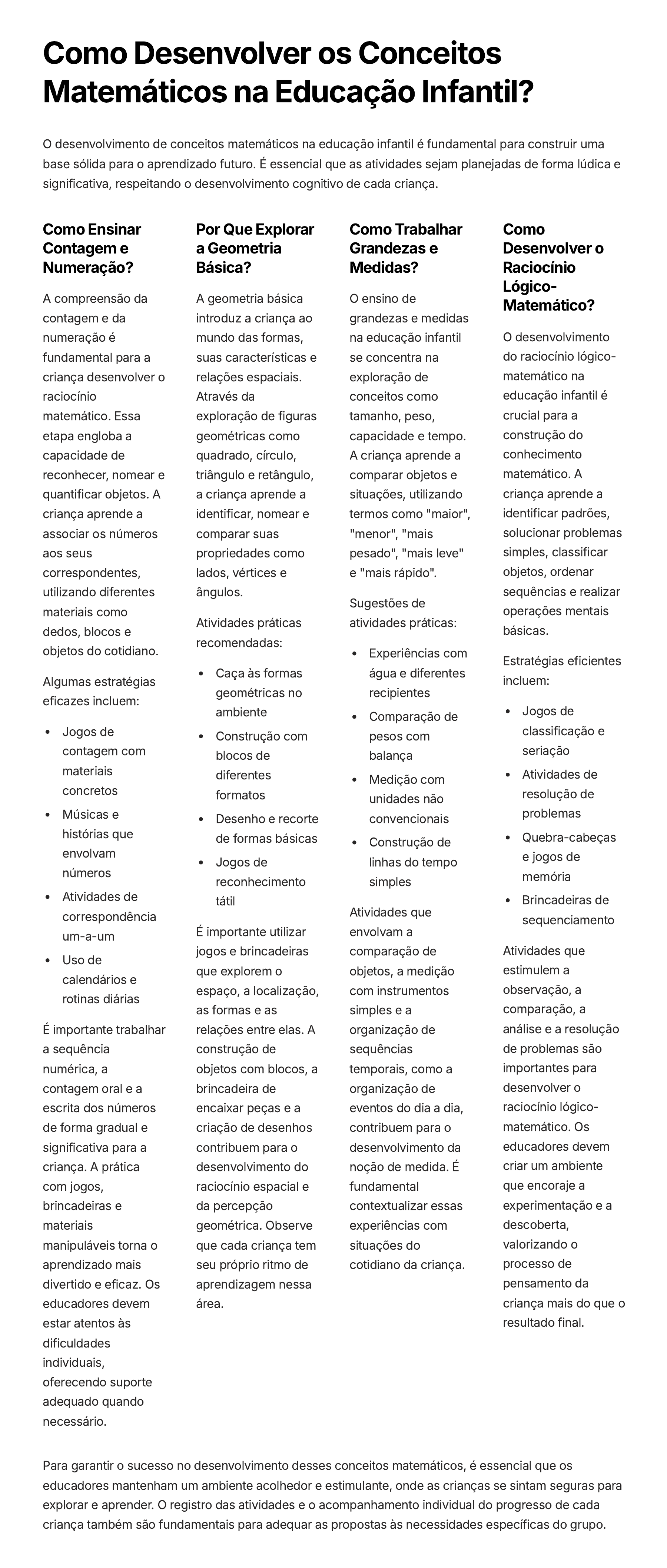 Como Desenvolver os Conceitos Matemáticos na Educação Infantil? O desenvolvimento de conceitos matemáticos na educação infantil é fundamental para construir uma base sólida para o aprendizado futuro. É essencial que as atividades sejam planejadas de forma lúdica e significativa, respeitando o desenvolvimento cognitivo de cada criança. Como Ensinar Contagem e Numeração? A compreensão da contagem e da numeração é fundamental para a criança desenvolver o raciocínio matemático. Essa etapa engloba a capacidade de reconhecer, nomear e quantificar objetos. A criança aprende a associar os números aos seus correspondentes, utilizando diferentes materiais como dedos, blocos e objetos do cotidiano. Algumas estratégias eficazes incluem: Jogos de contagem com materiais concretos Músicas e histórias que envolvam números Atividades de correspondência um-a-um Uso de calendários e rotinas diárias É importante trabalhar a sequência numérica, a contagem oral e a escrita dos números de forma gradual e significativa para a criança. A prática com jogos, brincadeiras e materiais manipuláveis torna o aprendizado mais divertido e eficaz. Os educadores devem estar atentos às dificuldades individuais, oferecendo suporte adequado quando necessário. Por Que Explorar a Geometria Básica? A geometria básica introduz a criança ao mundo das formas, suas características e relações espaciais. Através da exploração de figuras geométricas como quadrado, círculo, triângulo e retângulo, a criança aprende a identificar, nomear e comparar suas propriedades como lados, vértices e ângulos. Atividades práticas recomendadas: Caça às formas geométricas no ambiente Construção com blocos de diferentes formatos Desenho e recorte de formas básicas Jogos de reconhecimento tátil É importante utilizar jogos e brincadeiras que explorem o espaço, a localização, as formas e as relações entre elas. A construção de objetos com blocos, a brincadeira de encaixar peças e a criação de desenhos contribuem para o desenvolvimento do raciocínio espacial e da percepção geométrica. Observe que cada criança tem seu próprio ritmo de aprendizagem nessa área. Como Trabalhar Grandezas e Medidas? O ensino de grandezas e medidas na educação infantil se concentra na exploração de conceitos como tamanho, peso, capacidade e tempo. A criança aprende a comparar objetos e situações, utilizando termos como "maior", "menor", "mais pesado", "mais leve" e "mais rápido". Sugestões de atividades práticas: Experiências com água e diferentes recipientes Comparação de pesos com balança Medição com unidades não convencionais Construção de linhas do tempo simples Atividades que envolvam a comparação de objetos, a medição com instrumentos simples e a organização de sequências temporais, como a organização de eventos do dia a dia, contribuem para o desenvolvimento da noção de medida. É fundamental contextualizar essas experiências com situações do cotidiano da criança. Como Desenvolver o Raciocínio Lógico- Matemático? O desenvolvimento do raciocínio lógico- matemático na educação infantil é crucial para a construção do conhecimento matemático. A criança aprende a identificar padrões, solucionar problemas simples, classificar objetos, ordenar sequências e realizar operações mentais básicas. Estratégias eficientes incluem: Jogos de classificação e seriação Atividades de resolução de problemas Quebra-cabeças e jogos de memória Brincadeiras de sequenciamento Atividades que estimulem a observação, a comparação, a análise e a resolução de problemas são importantes para desenvolver o raciocínio lógico- matemático. Os educadores devem criar um ambiente que encoraje a experimentação e a descoberta, valorizando o processo de pensamento da criança mais do que o resultado final. Para garantir o sucesso no desenvolvimento desses conceitos matemáticos, é essencial que os educadores mantenham um ambiente acolhedor e estimulante, onde as crianças se sintam seguras para explorar e aprender. O registro das atividades e o acompanhamento individual do progresso de cada criança também são fundamentais para adequar as propostas às necessidades específicas do grupo.