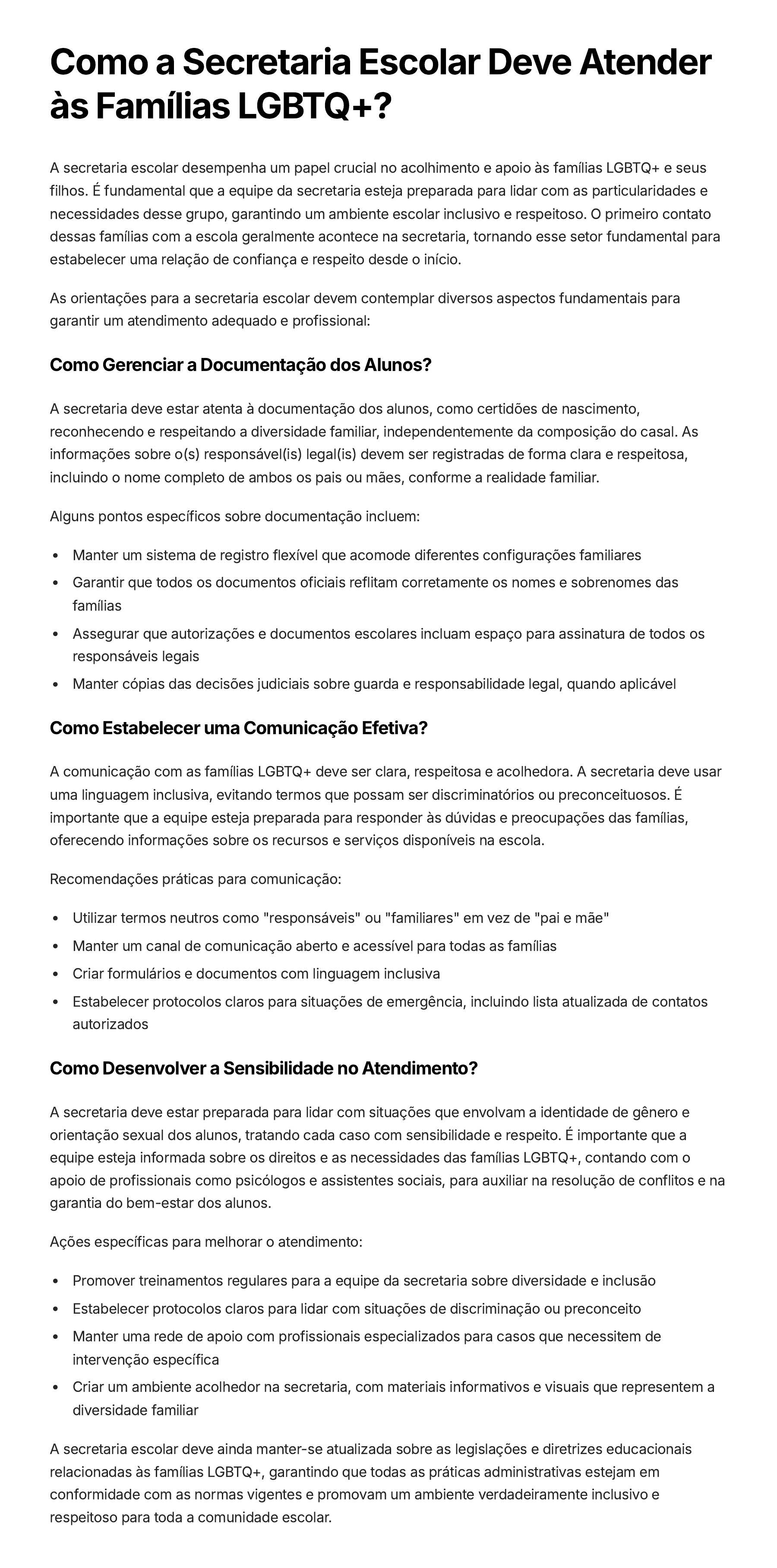 Como a Secretaria Escolar Deve Atender às Famílias LGBTQ+? A secretaria escolar desempenha um papel crucial no acolhimento e apoio às famílias LGBTQ+ e seus filhos. É fundamental que a equipe da secretaria esteja preparada para lidar com as particularidades e necessidades desse grupo, garantindo um ambiente escolar inclusivo e respeitoso. O primeiro contato dessas famílias com a escola geralmente acontece na secretaria, tornando esse setor fundamental para estabelecer uma relação de confiança e respeito desde o início. As orientações para a secretaria escolar devem contemplar diversos aspectos fundamentais para garantir um atendimento adequado e profissional: Como Gerenciar a Documentação dos Alunos? A secretaria deve estar atenta à documentação dos alunos, como certidões de nascimento, reconhecendo e respeitando a diversidade familiar, independentemente da composição do casal. As informações sobre o(s) responsável(is) legal(is) devem ser registradas de forma clara e respeitosa, incluindo o nome completo de ambos os pais ou mães, conforme a realidade familiar. Alguns pontos específicos sobre documentação incluem: Manter um sistema de registro flexível que acomode diferentes configurações familiares Garantir que todos os documentos oficiais reflitam corretamente os nomes e sobrenomes das famílias Assegurar que autorizações e documentos escolares incluam espaço para assinatura de todos os responsáveis legais Manter cópias das decisões judiciais sobre guarda e responsabilidade legal, quando aplicável Como Estabelecer uma Comunicação Efetiva? A comunicação com as famílias LGBTQ+ deve ser clara, respeitosa e acolhedora. A secretaria deve usar uma linguagem inclusiva, evitando termos que possam ser discriminatórios ou preconceituosos. É importante que a equipe esteja preparada para responder às dúvidas e preocupações das famílias, oferecendo informações sobre os recursos e serviços disponíveis na escola. Recomendações práticas para comunicação: Utilizar termos neutros como "responsáveis" ou "familiares" em vez de "pai e mãe" Manter um canal de comunicação aberto e acessível para todas as famílias Criar formulários e documentos com linguagem inclusiva Estabelecer protocolos claros para situações de emergência, incluindo lista atualizada de contatos autorizados Como Desenvolver a Sensibilidade no Atendimento? A secretaria deve estar preparada para lidar com situações que envolvam a identidade de gênero e orientação sexual dos alunos, tratando cada caso com sensibilidade e respeito. É importante que a equipe esteja informada sobre os direitos e as necessidades das famílias LGBTQ+, contando com o apoio de profissionais como psicólogos e assistentes sociais, para auxiliar na resolução de conflitos e na garantia do bem-estar dos alunos. Ações específicas para melhorar o atendimento: Promover treinamentos regulares para a equipe da secretaria sobre diversidade e inclusão Estabelecer protocolos claros para lidar com situações de discriminação ou preconceito Manter uma rede de apoio com profissionais especializados para casos que necessitem de intervenção específica Criar um ambiente acolhedor na secretaria, com materiais informativos e visuais que representem a diversidade familiar A secretaria escolar deve ainda manter-se atualizada sobre as legislações e diretrizes educacionais relacionadas às famílias LGBTQ+, garantindo que todas as práticas administrativas estejam em conformidade com as normas vigentes e promovam um ambiente verdadeiramente inclusivo e respeitoso para toda a comunidade escolar.