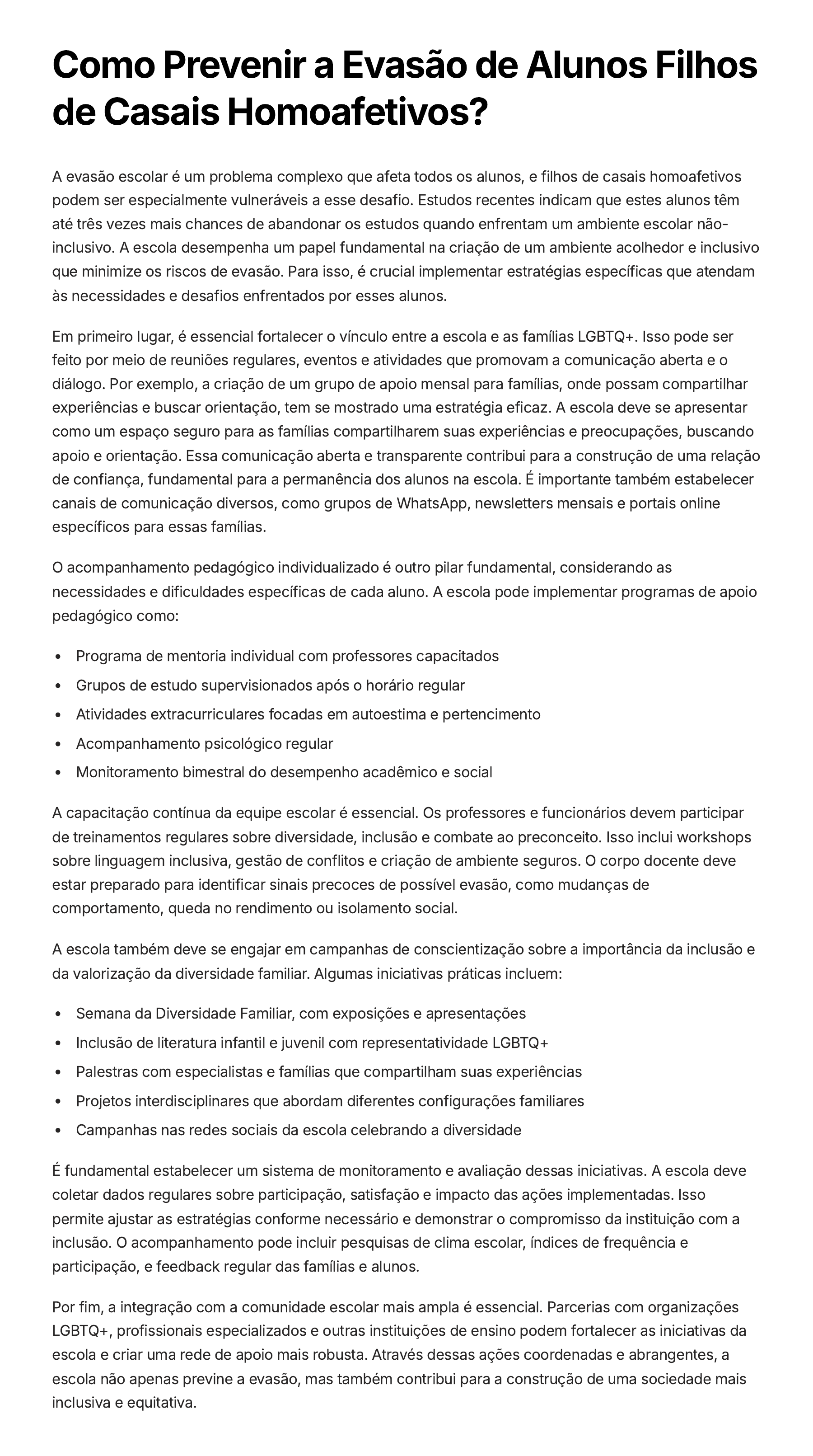 Como Prevenir a Evasão de Alunos Filhos de Casais Homoafetivos? A evasão escolar é um problema complexo que afeta todos os alunos, e filhos de casais homoafetivos podem ser especialmente vulneráveis a esse desafio. Estudos recentes indicam que estes alunos têm até três vezes mais chances de abandonar os estudos quando enfrentam um ambiente escolar não- inclusivo. A escola desempenha um papel fundamental na criação de um ambiente acolhedor e inclusivo que minimize os riscos de evasão. Para isso, é crucial implementar estratégias específicas que atendam às necessidades e desafios enfrentados por esses alunos. Em primeiro lugar, é essencial fortalecer o vínculo entre a escola e as famílias LGBTQ+. Isso pode ser feito por meio de reuniões regulares, eventos e atividades que promovam a comunicação aberta e o diálogo. Por exemplo, a criação de um grupo de apoio mensal para famílias, onde possam compartilhar experiências e buscar orientação, tem se mostrado uma estratégia eficaz. A escola deve se apresentar como um espaço seguro para as famílias compartilharem suas experiências e preocupações, buscando apoio e orientação. Essa comunicação aberta e transparente contribui para a construção de uma relação de confiança, fundamental para a permanência dos alunos na escola. É importante também estabelecer canais de comunicação diversos, como grupos de WhatsApp, newsletters mensais e portais online específicos para essas famílias. O acompanhamento pedagógico individualizado é outro pilar fundamental, considerando as necessidades e dificuldades específicas de cada aluno. A escola pode implementar programas de apoio pedagógico como: Programa de mentoria individual com professores capacitados Grupos de estudo supervisionados após o horário regular Atividades extracurriculares focadas em autoestima e pertencimento Acompanhamento psicológico regular Monitoramento bimestral do desempenho acadêmico e social A capacitação contínua da equipe escolar é essencial. Os professores e funcionários devem participar de treinamentos regulares sobre diversidade, inclusão e combate ao preconceito. Isso inclui workshops sobre linguagem inclusiva, gestão de conflitos e criação de ambiente seguros. O corpo docente deve estar preparado para identificar sinais precoces de possível evasão, como mudanças de comportamento, queda no rendimento ou isolamento social. A escola também deve se engajar em campanhas de conscientização sobre a importância da inclusão e da valorização da diversidade familiar. Algumas iniciativas práticas incluem: Semana da Diversidade Familiar, com exposições e apresentações Inclusão de literatura infantil e juvenil com representatividade LGBTQ+ Palestras com especialistas e famílias que compartilham suas experiências Projetos interdisciplinares que abordam diferentes configurações familiares Campanhas nas redes sociais da escola celebrando a diversidade É fundamental estabelecer um sistema de monitoramento e avaliação dessas iniciativas. A escola deve coletar dados regulares sobre participação, satisfação e impacto das ações implementadas. Isso permite ajustar as estratégias conforme necessário e demonstrar o compromisso da instituição com a inclusão. O acompanhamento pode incluir pesquisas de clima escolar, índices de frequência e participação, e feedback regular das famílias e alunos. Por fim, a integração com a comunidade escolar mais ampla é essencial. Parcerias com organizações LGBTQ+, profissionais especializados e outras instituições de ensino podem fortalecer as iniciativas da escola e criar uma rede de apoio mais robusta. Através dessas ações coordenadas e abrangentes, a escola não apenas previne a evasão, mas também contribui para a construção de uma sociedade mais inclusiva e equitativa.