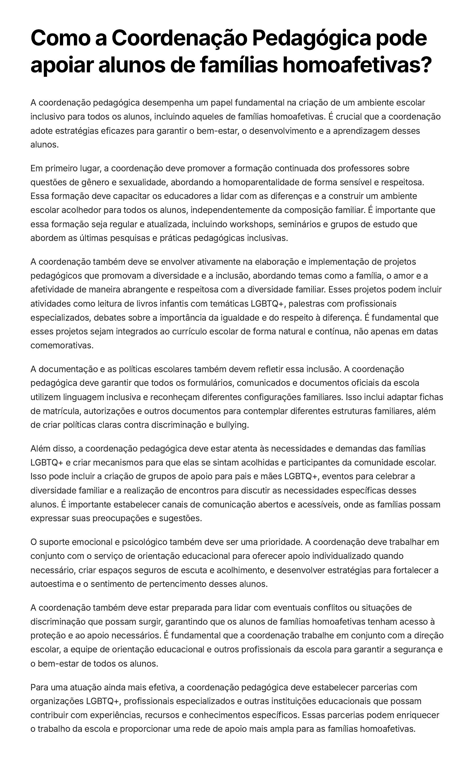 Como a Coordenação Pedagógica pode apoiar alunos de famílias homoafetivas? A coordenação pedagógica desempenha um papel fundamental na criação de um ambiente escolar inclusivo para todos os alunos, incluindo aqueles de famílias homoafetivas. É crucial que a coordenação adote estratégias eficazes para garantir o bem-estar, o desenvolvimento e a aprendizagem desses alunos. Em primeiro lugar, a coordenação deve promover a formação continuada dos professores sobre questões de gênero e sexualidade, abordando a homoparentalidade de forma sensível e respeitosa. Essa formação deve capacitar os educadores a lidar com as diferenças e a construir um ambiente escolar acolhedor para todos os alunos, independentemente da composição familiar. É importante que essa formação seja regular e atualizada, incluindo workshops, seminários e grupos de estudo que abordem as últimas pesquisas e práticas pedagógicas inclusivas. A coordenação também deve se envolver ativamente na elaboração e implementação de projetos pedagógicos que promovam a diversidade e a inclusão, abordando temas como a família, o amor e a afetividade de maneira abrangente e respeitosa com a diversidade familiar. Esses projetos podem incluir atividades como leitura de livros infantis com temáticas LGBTQ+, palestras com profissionais especializados, debates sobre a importância da igualdade e do respeito à diferença. É fundamental que esses projetos sejam integrados ao currículo escolar de forma natural e contínua, não apenas em datas comemorativas. A documentação e as políticas escolares também devem refletir essa inclusão. A coordenação pedagógica deve garantir que todos os formulários, comunicados e documentos oficiais da escola utilizem linguagem inclusiva e reconheçam diferentes configurações familiares. Isso inclui adaptar fichas de matrícula, autorizações e outros documentos para contemplar diferentes estruturas familiares, além de criar políticas claras contra discriminação e bullying. Além disso, a coordenação pedagógica deve estar atenta às necessidades e demandas das famílias LGBTQ+ e criar mecanismos para que elas se sintam acolhidas e participantes da comunidade escolar. Isso pode incluir a criação de grupos de apoio para pais e mães LGBTQ+, eventos para celebrar a diversidade familiar e a realização de encontros para discutir as necessidades específicas desses alunos. É importante estabelecer canais de comunicação abertos e acessíveis, onde as famílias possam expressar suas preocupações e sugestões. O suporte emocional e psicológico também deve ser uma prioridade. A coordenação deve trabalhar em conjunto com o serviço de orientação educacional para oferecer apoio individualizado quando necessário, criar espaços seguros de escuta e acolhimento, e desenvolver estratégias para fortalecer a autoestima e o sentimento de pertencimento desses alunos. A coordenação também deve estar preparada para lidar com eventuais conflitos ou situações de discriminação que possam surgir, garantindo que os alunos de famílias homoafetivas tenham acesso à proteção e ao apoio necessários. É fundamental que a coordenação trabalhe em conjunto com a direção escolar, a equipe de orientação educacional e outros profissionais da escola para garantir a segurança e o bem-estar de todos os alunos. Para uma atuação ainda mais efetiva, a coordenação pedagógica deve estabelecer parcerias com organizações LGBTQ+, profissionais especializados e outras instituições educacionais que possam contribuir com experiências, recursos e conhecimentos específicos. Essas parcerias podem enriquecer o trabalho da escola e proporcionar uma rede de apoio mais ampla para as famílias homoafetivas.