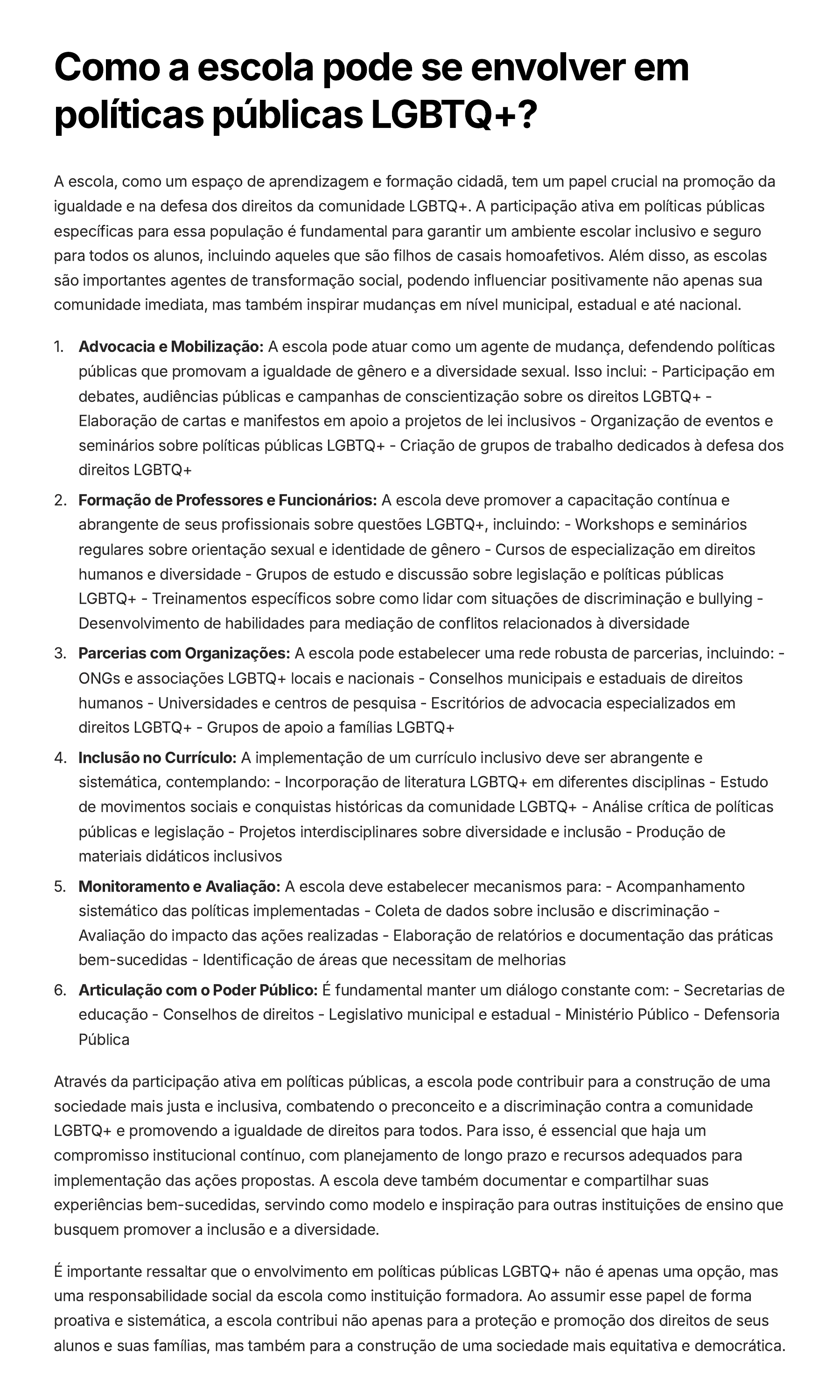 Como a escola pode se envolver em políticas públicas LGBTQ+? A escola, como um espaço de aprendizagem e formação cidadã, tem um papel crucial na promoção da igualdade e na defesa dos direitos da comunidade LGBTQ+. A participação ativa em políticas públicas específicas para essa população é fundamental para garantir um ambiente escolar inclusivo e seguro para todos os alunos, incluindo aqueles que são filhos de casais homoafetivos. Além disso, as escolas são importantes agentes de transformação social, podendo influenciar positivamente não apenas sua comunidade imediata, mas também inspirar mudanças em nível municipal, estadual e até nacional. Advocacia e Mobilização: A escola pode atuar como um agente de mudança, defendendo políticas públicas que promovam a igualdade de gênero e a diversidade sexual. Isso inclui: - Participação em debates, audiências públicas e campanhas de conscientização sobre os direitos LGBTQ+ - Elaboração de cartas e manifestos em apoio a projetos de lei inclusivos - Organização de eventos e seminários sobre políticas públicas LGBTQ+ - Criação de grupos de trabalho dedicados à defesa dos direitos LGBTQ+ 1. Formação de Professores e Funcionários: A escola deve promover a capacitação contínua e abrangente de seus profissionais sobre questões LGBTQ+, incluindo: - Workshops e seminários regulares sobre orientação sexual e identidade de gênero - Cursos de especialização em direitos humanos e diversidade - Grupos de estudo e discussão sobre legislação e políticas públicas LGBTQ+ - Treinamentos específicos sobre como lidar com situações de discriminação e bullying - Desenvolvimento de habilidades para mediação de conflitos relacionados à diversidade 2. Parcerias com Organizações: A escola pode estabelecer uma rede robusta de parcerias, incluindo: - ONGs e associações LGBTQ+ locais e nacionais - Conselhos municipais e estaduais de direitos humanos - Universidades e centros de pesquisa - Escritórios de advocacia especializados em direitos LGBTQ+ - Grupos de apoio a famílias LGBTQ+ 3. Inclusão no Currículo: A implementação de um currículo inclusivo deve ser abrangente e sistemática, contemplando: - Incorporação de literatura LGBTQ+ em diferentes disciplinas - Estudo de movimentos sociais e conquistas históricas da comunidade LGBTQ+ - Análise crítica de políticas públicas e legislação - Projetos interdisciplinares sobre diversidade e inclusão - Produção de materiais didáticos inclusivos 4. Monitoramento e Avaliação: A escola deve estabelecer mecanismos para: - Acompanhamento sistemático das políticas implementadas - Coleta de dados sobre inclusão e discriminação - Avaliação do impacto das ações realizadas - Elaboração de relatórios e documentação das práticas bem-sucedidas - Identificação de áreas que necessitam de melhorias 5. Articulação com o Poder Público: É fundamental manter um diálogo constante com: - Secretarias de educação - Conselhos de direitos - Legislativo municipal e estadual - Ministério Público - Defensoria Pública 6. Através da participação ativa em políticas públicas, a escola pode contribuir para a construção de uma sociedade mais justa e inclusiva, combatendo o preconceito e a discriminação contra a comunidade LGBTQ+ e promovendo a igualdade de direitos para todos. Para isso, é essencial que haja um compromisso institucional contínuo, com planejamento de longo prazo e recursos adequados para implementação das ações propostas. A escola deve também documentar e compartilhar suas experiências bem-sucedidas, servindo como modelo e inspiração para outras instituições de ensino que busquem promover a inclusão e a diversidade. É importante ressaltar que o envolvimento em políticas públicas LGBTQ+ não é apenas uma opção, mas uma responsabilidade social da escola como instituição formadora. Ao assumir esse papel de forma proativa e sistemática, a escola contribui não apenas para a proteção e promoção dos direitos de seus alunos e suas famílias, mas também para a construção de uma sociedade mais equitativa e democrática.