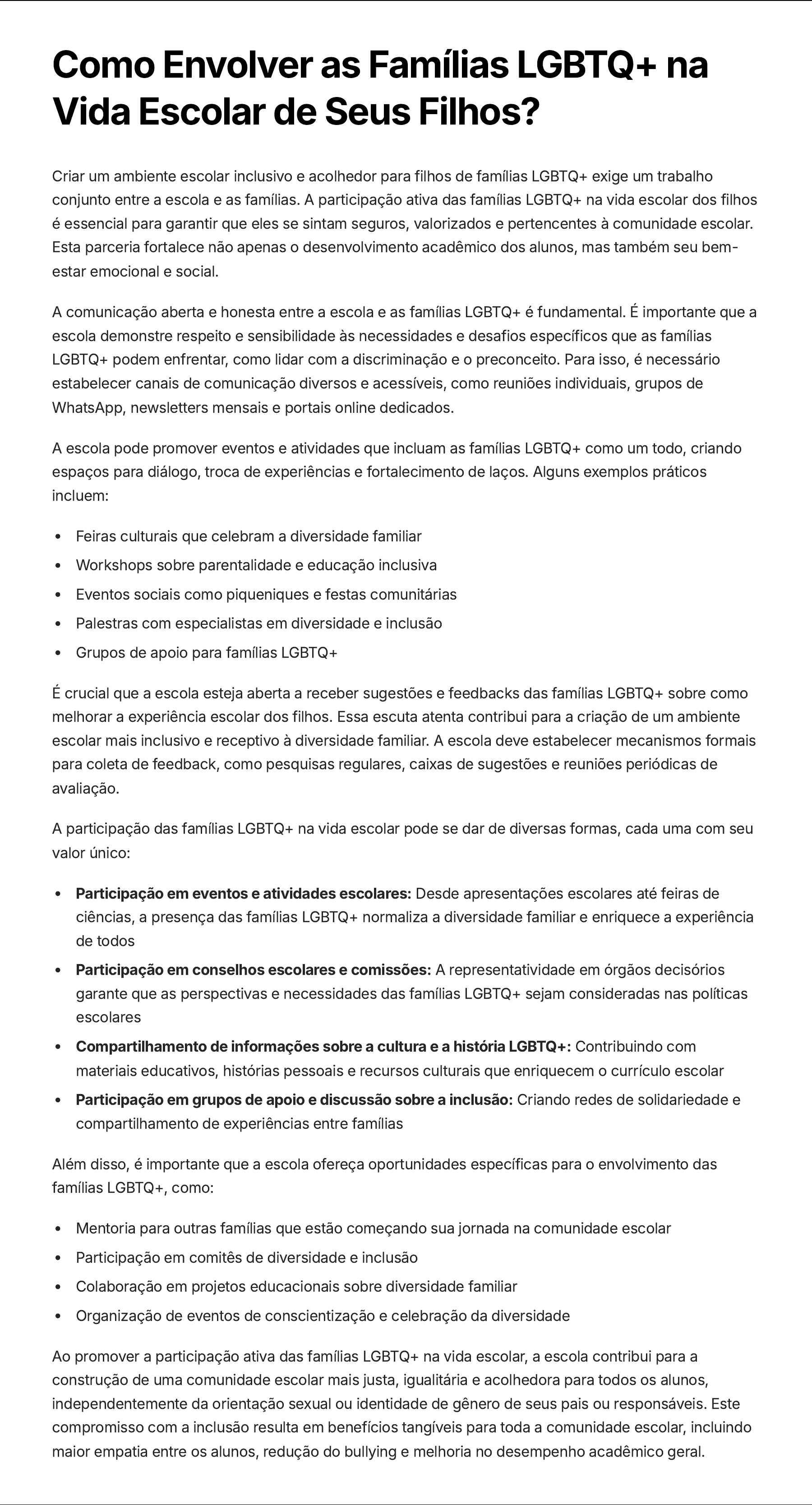 Como Envolver as Famílias LGBTQ+ na Vida Escolar de Seus Filhos? Criar um ambiente escolar inclusivo e acolhedor para filhos de famílias LGBTQ+ exige um trabalho conjunto entre a escola e as famílias. A participação ativa das famílias LGBTQ+ na vida escolar dos filhos é essencial para garantir que eles se sintam seguros, valorizados e pertencentes à comunidade escolar. Esta parceria fortalece não apenas o desenvolvimento acadêmico dos alunos, mas também seu bem- estar emocional e social. A comunicação aberta e honesta entre a escola e as famílias LGBTQ+ é fundamental. É importante que a escola demonstre respeito e sensibilidade às necessidades e desafios específicos que as famílias LGBTQ+ podem enfrentar, como lidar com a discriminação e o preconceito. Para isso, é necessário estabelecer canais de comunicação diversos e acessíveis, como reuniões individuais, grupos de WhatsApp, newsletters mensais e portais online dedicados. A escola pode promover eventos e atividades que incluam as famílias LGBTQ+ como um todo, criando espaços para diálogo, troca de experiências e fortalecimento de laços. Alguns exemplos práticos incluem: Feiras culturais que celebram a diversidade familiar Workshops sobre parentalidade e educação inclusiva Eventos sociais como piqueniques e festas comunitárias Palestras com especialistas em diversidade e inclusão Grupos de apoio para famílias LGBTQ+ É crucial que a escola esteja aberta a receber sugestões e feedbacks das famílias LGBTQ+ sobre como melhorar a experiência escolar dos filhos. Essa escuta atenta contribui para a criação de um ambiente escolar mais inclusivo e receptivo à diversidade familiar. A escola deve estabelecer mecanismos formais para coleta de feedback, como pesquisas regulares, caixas de sugestões e reuniões periódicas de avaliação. A participação das famílias LGBTQ+ na vida escolar pode se dar de diversas formas, cada uma com seu valor único: Participação em eventos e atividades escolares: Desde apresentações escolares até feiras de ciências, a presença das famílias LGBTQ+ normaliza a diversidade familiar e enriquece a experiência de todos Participação em conselhos escolares e comissões: A representatividade em órgãos decisórios garante que as perspectivas e necessidades das famílias LGBTQ+ sejam consideradas nas políticas escolares Compartilhamento de informações sobre a cultura e a história LGBTQ+: Contribuindo com materiais educativos, histórias pessoais e recursos culturais que enriquecem o currículo escolar Participação em grupos de apoio e discussão sobre a inclusão: Criando redes de solidariedade e compartilhamento de experiências entre famílias Além disso, é importante que a escola ofereça oportunidades específicas para o envolvimento das famílias LGBTQ+, como: Mentoria para outras famílias que estão começando sua jornada na comunidade escolar Participação em comitês de diversidade e inclusão Colaboração em projetos educacionais sobre diversidade familiar Organização de eventos de conscientização e celebração da diversidade Ao promover a participação ativa das famílias LGBTQ+ na vida escolar, a escola contribui para a construção de uma comunidade escolar mais justa, igualitária e acolhedora para todos os alunos, independentemente da orientação sexual ou identidade de gênero de seus pais ou responsáveis. Este compromisso com a inclusão resulta em benefícios tangíveis para toda a comunidade escolar, incluindo maior empatia entre os alunos, redução do bullying e melhoria no desempenho acadêmico geral.