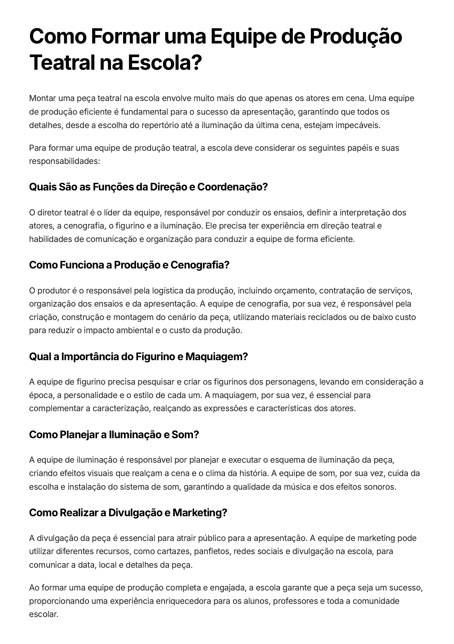 Como Formar uma Equipe de Produção Teatral na Escola? Montar uma peça teatral na escola envolve muito mais do que apenas os atores em cena. Uma equipe de produção eficiente é fundamental para o sucesso da apresentação, garantindo que todos os detalhes, desde a escolha do repertório até a iluminação da última cena, estejam impecáveis. Para formar uma equipe de produção teatral, a escola deve considerar os seguintes papéis e suas responsabilidades: Quais São as Funções da Direção e Coordenação? O diretor teatral é o líder da equipe, responsável por conduzir os ensaios, definir a interpretação dos atores, a cenografia, o figurino e a iluminação. Ele precisa ter experiência em direção teatral e habilidades de comunicação e organização para conduzir a equipe de forma eficiente. Como Funciona a Produção e Cenografia? O produtor é o responsável pela logística da produção, incluindo orçamento, contratação de serviços, organização dos ensaios e da apresentação. A equipe de cenografia, por sua vez, é responsável pela criação, construção e montagem do cenário da peça, utilizando materiais reciclados ou de baixo custo para reduzir o impacto ambiental e o custo da produção. Qual a Importância do Figurino e Maquiagem? A equipe de figurino precisa pesquisar e criar os figurinos dos personagens, levando em consideração a época, a personalidade e o estilo de cada um. A maquiagem, por sua vez, é essencial para complementar a caracterização, realçando as expressões e características dos atores. Como Planejar a Iluminação e Som? A equipe de iluminação é responsável por planejar e executar o esquema de iluminação da peça, criando efeitos visuais que realçam a cena e o clima da história. A equipe de som, por sua vez, cuida da escolha e instalação do sistema de som, garantindo a qualidade da música e dos efeitos sonoros. Como Realizar a Divulgação e Marketing? A divulgação da peça é essencial para atrair público para a apresentação. A equipe de marketing pode utilizar diferentes recursos, como cartazes, panfletos, redes sociais e divulgação na escola, para comunicar a data, local e detalhes da peça. Ao formar uma equipe de produção completa e engajada, a escola garante que a peça seja um sucesso, proporcionando uma experiência enriquecedora para os alunos, professores e toda a comunidade escolar. Quais são os Principais Desafios Logísticos no Teatro Escolar? A organização de peças teatrais dentro de uma escola apresenta diversos desafios logísticos que exigem planejamento e atenção aos detalhes. Afinal, além da parte artística, é preciso lidar com questões práticas que garantem o sucesso da produção. Disponibilidade de espaço: Encontrar um local adequado para ensaios e apresentações com a infraestrutura necessária, como palco, iluminação e acústica, pode ser uma tarefa desafiadora, especialmente em escolas com espaços limitados. Recursos materiais: Adereços, figurinos, cenários e materiais para a produção exigem planejamento e orçamento, além da busca por fornecedores confiáveis e que atendam às necessidades da peça. Gestão de tempo: Coordenar os horários dos ensaios, considerando a disponibilidade dos alunos, professores e equipe técnica, exige organização e flexibilidade, principalmente em escolas com horários e atividades concorrentes. Transporte e armazenamento: O transporte de materiais para os ensaios e apresentações, bem como o armazenamento de cenários e figurinos, podem ser complexos, exigindo logística eficiente e espaço disponível. Segurança: Garantir a segurança dos alunos e da equipe durante os ensaios e apresentações, com atenção à iluminação, cenários, adereços e organização do espaço, é essencial para evitar acidentes. Como engajar a comunidade escolar no Teatro? O Teatro na escola não se limita à sala de aula. É essencial envolver a comunidade escolar, incluindo pais, alunos, professores e funcionários, para criar um ambiente de apoio e entusiasmo pelas artes cênicas. A participação da comunidade escolar contribui para o sucesso das apresentações, tornando- as eventos memoráveis e enriquecedores para todos. Existem diversas formas de engajar a comunidade escolar no Teatro: Convites para assistir aos ensaios e apresentações: Envie convites para pais, professores e funcionários, incentivando-os a acompanhar o processo criativo e a prestigiar as apresentações. Oficinas e atividades para a comunidade: Organize workshops de teatro para pais, professores e funcionários, oferecendo a oportunidade de experimentar a arte cênica de forma prática. Participação em atividades de apoio: Incentive pais e funcionários a contribuir com a produção das peças, como ajudando na confecção de figurinos, cenários, iluminação ou som. Campanhas de divulgação: Crie materiais de divulgação, como cartazes, panfletos, comunicados, e utilize as plataformas digitais da escola para promover as apresentações e envolver a comunidade. Criação de um blog ou site dedicado ao Teatro: Essa plataforma pode servir para publicar informações sobre as peças, fotos, vídeos dos ensaios, entrevistas com alunos e professores, além de divulgar eventos relacionados ao Teatro na escola. Ao envolver a comunidade escolar, você cria um senso de pertencimento e orgulho pela arte teatral. A participação ativa da comunidade transforma o Teatro em um evento vibrante e inspirador para todos.