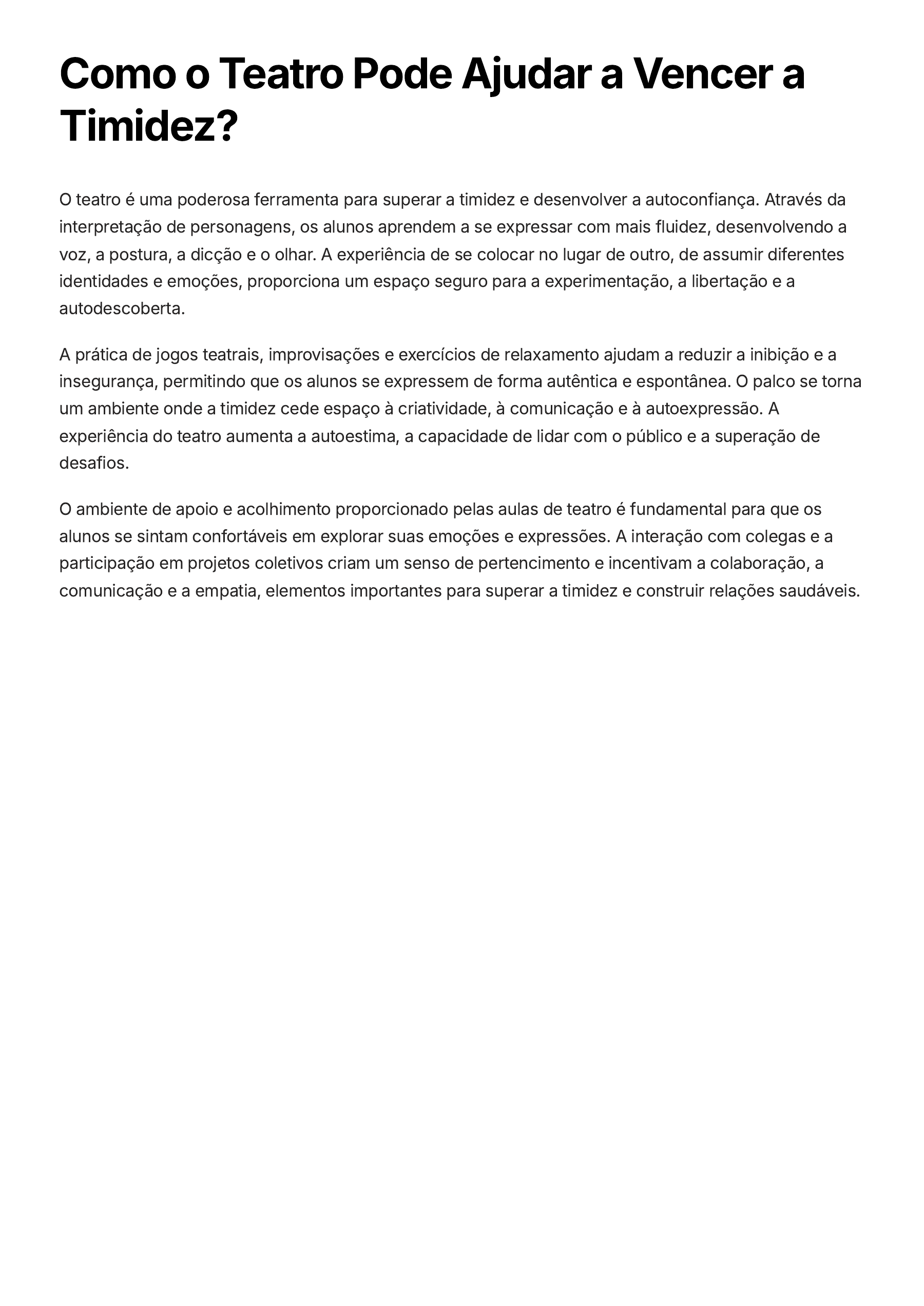 Como o Teatro Pode Ajudar a Vencer a Timidez? O teatro é uma poderosa ferramenta para superar a timidez e desenvolver a autoconfiança. Através da interpretação de personagens, os alunos aprendem a se expressar com mais fluidez, desenvolvendo a voz, a postura, a dicção e o olhar. A experiência de se colocar no lugar de outro, de assumir diferentes identidades e emoções, proporciona um espaço seguro para a experimentação, a libertação e a autodescoberta. A prática de jogos teatrais, improvisações e exercícios de relaxamento ajudam a reduzir a inibição e a insegurança, permitindo que os alunos se expressem de forma autêntica e espontânea. O palco se torna um ambiente onde a timidez cede espaço à criatividade, à comunicação e à autoexpressão. A experiência do teatro aumenta a autoestima, a capacidade de lidar com o público e a superação de desafios. O ambiente de apoio e acolhimento proporcionado pelas aulas de teatro é fundamental para que os alunos se sintam confortáveis em explorar suas emoções e expressões. A interação com colegas e a participação em projetos coletivos criam um senso de pertencimento e incentivam a colaboração, a comunicação e a empatia, elementos importantes para superar a timidez e construir relações saudáveis. Qual a Melhor Idade para Começar o Teatro na Escola? A melhor idade para iniciar as atividades teatrais na escola é uma questão que gera muitas discussões entre educadores e especialistas. Não existe uma resposta única, pois o desenvolvimento de cada criança é individual. No entanto, a maioria dos educadores concorda que a idade ideal para começar a se envolver com o teatro na escola é por volta dos 5 anos de idade, quando as crianças já dominam a linguagem verbal e começam a ter um senso de imaginação mais desenvolvido. As atividades teatrais podem ser introduzidas de forma lúdica e divertida, com jogos e brincadeiras que estimulam a criatividade, a comunicação e a expressão corporal. Essa fase inicial é crucial para despertar o interesse das crianças pelo teatro e para que elas se sintam à vontade para se expressar. No entanto, é importante destacar que a introdução de atividades teatrais mais complexas, como a interpretação de personagens e a criação de cenas, pode ser iniciada em idades mais avançadas, a partir dos 7-8 anos, quando as crianças já possuem um desenvolvimento cognitivo mais maduro e uma capacidade de abstração maior. O ideal é que o teatro seja introduzido de forma gradual e adaptada à faixa etária dos alunos, respeitando as características e necessidades de cada fase do desenvolvimento infantil. Qual é a Duração Ideal de uma Aula de Teatro? A duração ideal de uma aula de Teatro depende de diversos fatores, como a faixa etária dos alunos, o nível de experiência, o objetivo da aula e o tipo de atividade que será realizada. No entanto, algumas diretrizes gerais podem ser seguidas. Faixa Etária Duração Ideal Infantil (4-6 anos) 30-45 minutos Fundamental I (7-10 anos) 45-60 minutos Fundamental II (11-14 anos) 60-90 minutos Ensino Médio (15-17 anos) 90-120 minutos Para alunos iniciantes, é recomendável começar com aulas mais curtas e gradualmente aumentar a duração conforme a familiaridade com as atividades teatrais. É importante lembrar que a atenção dos alunos diminui com o tempo, por isso, é crucial manter as aulas dinâmicas e engajadoras para que eles permaneçam focados e aprendam de forma eficaz. Aulas mais longas podem ser divididas em diferentes etapas, como aquecimento, exercícios de improvisação, interpretação de texto, jogos teatrais e atividades de criação. Essa estrutura permite que os alunos explorem diferentes aspectos do Teatro de forma gradual e aprofundada. A duração da aula também pode ser adaptada de acordo com o tipo de atividade que será realizada. Por exemplo, uma aula dedicada à preparação de uma peça teatral pode ser mais longa do que uma aula voltada para a prática de jogos e improvisação. O importante é garantir que o tempo seja utilizado de forma eficiente e produtiva para que os alunos alcancem os objetivos da aula.