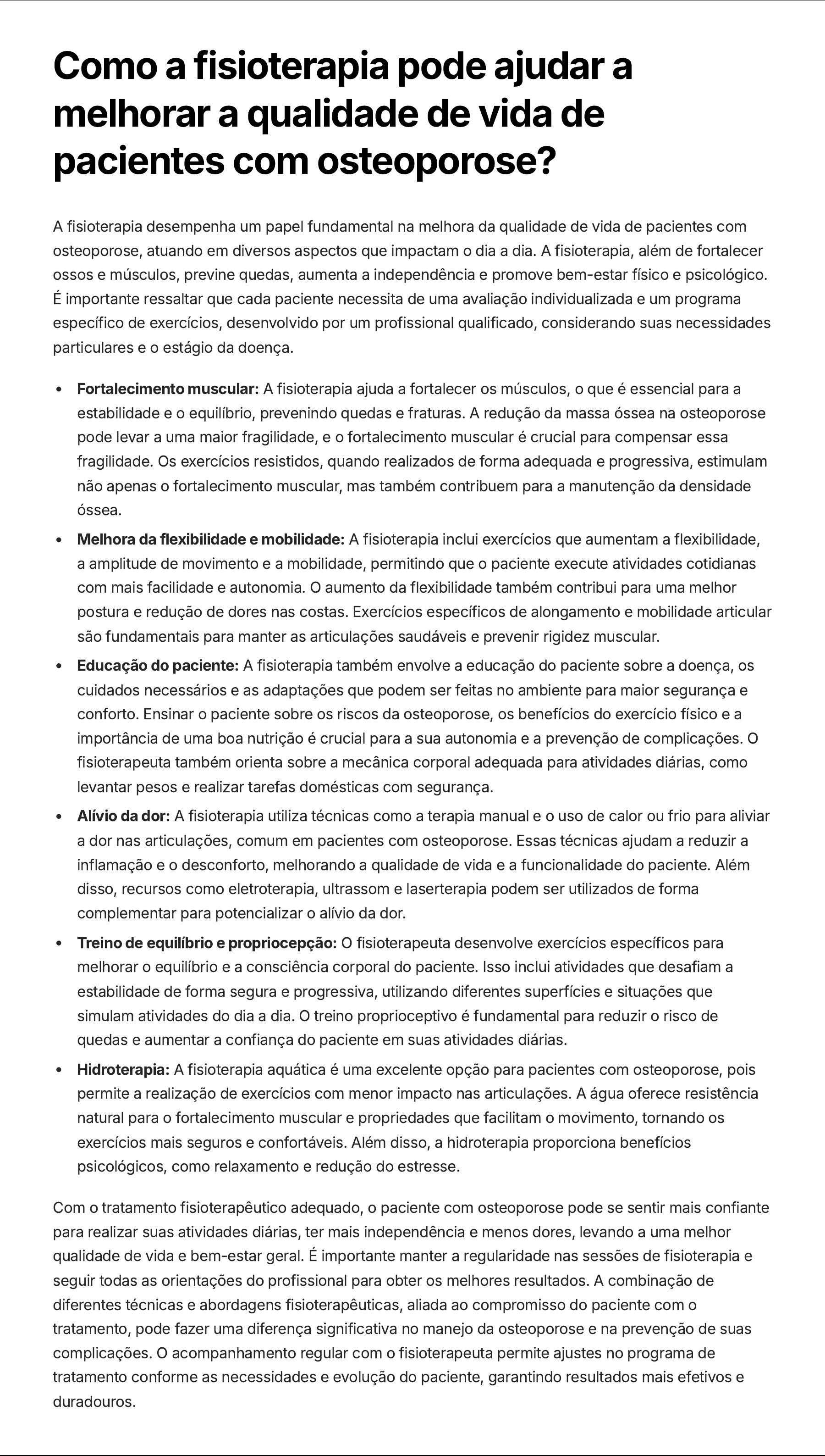 Como a fisioterapia pode ajudar a melhorar a qualidade de vida de pacientes com osteoporose? A fisioterapia desempenha um papel fundamental na melhora da qualidade de vida de pacientes com osteoporose, atuando em diversos aspectos que impactam o dia a dia. A fisioterapia, além de fortalecer ossos e músculos, previne quedas, aumenta a independência e promove bem-estar físico e psicológico. É importante ressaltar que cada paciente necessita de uma avaliação individualizada e um programa específico de exercícios, desenvolvido por um profissional qualificado, considerando suas necessidades particulares e o estágio da doença. Fortalecimento muscular: A fisioterapia ajuda a fortalecer os músculos, o que é essencial para a estabilidade e o equilíbrio, prevenindo quedas e fraturas. A redução da massa óssea na osteoporose pode levar a uma maior fragilidade, e o fortalecimento muscular é crucial para compensar essa fragilidade. Os exercícios resistidos, quando realizados de forma adequada e progressiva, estimulam não apenas o fortalecimento muscular, mas também contribuem para a manutenção da densidade óssea. Melhora da flexibilidade e mobilidade: A fisioterapia inclui exercícios que aumentam a flexibilidade, a amplitude de movimento e a mobilidade, permitindo que o paciente execute atividades cotidianas com mais facilidade e autonomia. O aumento da flexibilidade também contribui para uma melhor postura e redução de dores nas costas. Exercícios específicos de alongamento e mobilidade articular são fundamentais para manter as articulações saudáveis e prevenir rigidez muscular. Educação do paciente: A fisioterapia também envolve a educação do paciente sobre a doença, os cuidados necessários e as adaptações que podem ser feitas no ambiente para maior segurança e conforto. Ensinar o paciente sobre os riscos da osteoporose, os benefícios do exercício físico e a importância de uma boa nutrição é crucial para a sua autonomia e a prevenção de complicações. O fisioterapeuta também orienta sobre a mecânica corporal adequada para atividades diárias, como levantar pesos e realizar tarefas domésticas com segurança. Alívio da dor: A fisioterapia utiliza técnicas como a terapia manual e o uso de calor ou frio para aliviar a dor nas articulações, comum em pacientes com osteoporose. Essas técnicas ajudam a reduzir a inflamação e o desconforto, melhorando a qualidade de vida e a funcionalidade do paciente. Além disso, recursos como eletroterapia, ultrassom e laserterapia podem ser utilizados de forma complementar para potencializar o alívio da dor. Treino de equilíbrio e propriocepção: O fisioterapeuta desenvolve exercícios específicos para melhorar o equilíbrio e a consciência corporal do paciente. Isso inclui atividades que desafiam a estabilidade de forma segura e progressiva, utilizando diferentes superfícies e situações que simulam atividades do dia a dia. O treino proprioceptivo é fundamental para reduzir o risco de quedas e aumentar a confiança do paciente em suas atividades diárias. Hidroterapia: A fisioterapia aquática é uma excelente opção para pacientes com osteoporose, pois permite a realização de exercícios com menor impacto nas articulações. A água oferece resistência natural para o fortalecimento muscular e propriedades que facilitam o movimento, tornando os exercícios mais seguros e confortáveis. Além disso, a hidroterapia proporciona benefícios psicológicos, como relaxamento e redução do estresse. Com o tratamento fisioterapêutico adequado, o paciente com osteoporose pode se sentir mais confiante para realizar suas atividades diárias, ter mais independência e menos dores, levando a uma melhor qualidade de vida e bem-estar geral. É importante manter a regularidade nas sessões de fisioterapia e seguir todas as orientações do profissional para obter os melhores resultados. A combinação de diferentes técnicas e abordagens fisioterapêuticas, aliada ao compromisso do paciente com o tratamento, pode fazer uma diferença significativa no manejo da osteoporose e na prevenção de suas complicações. O acompanhamento regular com o fisioterapeuta permite ajustes no programa de tratamento conforme as necessidades e evolução do paciente, garantindo resultados mais efetivos e duradouros.