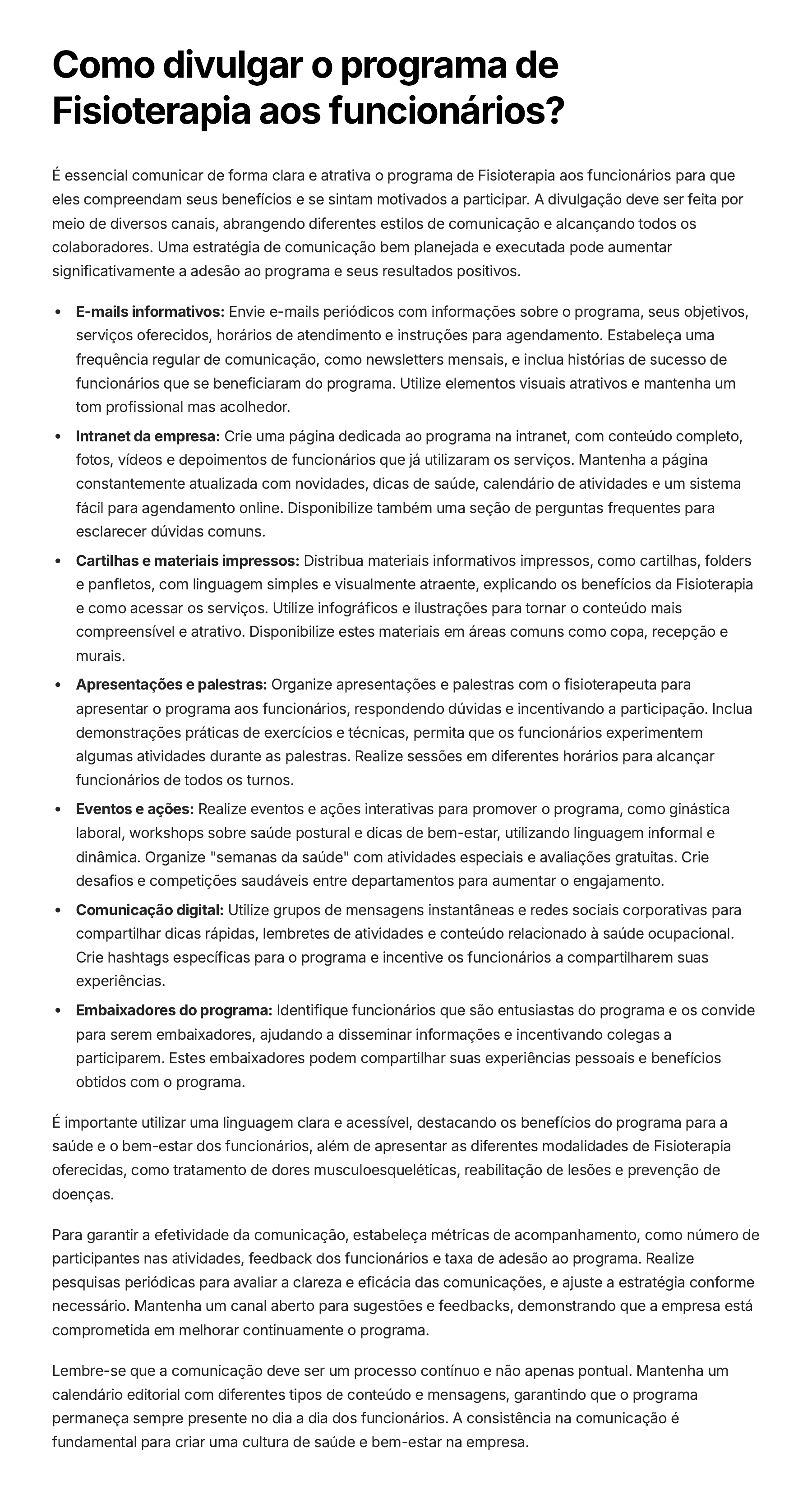 Como divulgar o programa de Fisioterapia aos funcionários? É essencial comunicar de forma clara e atrativa o programa de Fisioterapia aos funcionários para que eles compreendam seus benefícios e se sintam motivados a participar. A divulgação deve ser feita por meio de diversos canais, abrangendo diferentes estilos de comunicação e alcançando todos os colaboradores. Uma estratégia de comunicação bem planejada e executada pode aumentar significativamente a adesão ao programa e seus resultados positivos. E-mails informativos: Envie e-mails periódicos com informações sobre o programa, seus objetivos, serviços oferecidos, horários de atendimento e instruções para agendamento. Estabeleça uma frequência regular de comunicação, como newsletters mensais, e inclua histórias de sucesso de funcionários que se beneficiaram do programa. Utilize elementos visuais atrativos e mantenha um tom profissional mas acolhedor. Intranet da empresa: Crie uma página dedicada ao programa na intranet, com conteúdo completo, fotos, vídeos e depoimentos de funcionários que já utilizaram os serviços. Mantenha a página constantemente atualizada com novidades, dicas de saúde, calendário de atividades e um sistema fácil para agendamento online. Disponibilize também uma seção de perguntas frequentes para esclarecer dúvidas comuns. Cartilhas e materiais impressos: Distribua materiais informativos impressos, como cartilhas, folders e panfletos, com linguagem simples e visualmente atraente, explicando os benefícios da Fisioterapia e como acessar os serviços. Utilize infográficos e ilustrações para tornar o conteúdo mais compreensível e atrativo. Disponibilize estes materiais em áreas comuns como copa, recepção e murais. Apresentações e palestras: Organize apresentações e palestras com o fisioterapeuta para apresentar o programa aos funcionários, respondendo dúvidas e incentivando a participação. Inclua demonstrações práticas de exercícios e técnicas, permita que os funcionários experimentem algumas atividades durante as palestras. Realize sessões em diferentes horários para alcançar funcionários de todos os turnos. Eventos e ações: Realize eventos e ações interativas para promover o programa, como ginástica laboral, workshops sobre saúde postural e dicas de bem-estar, utilizando linguagem informal e dinâmica. Organize "semanas da saúde" com atividades especiais e avaliações gratuitas. Crie desafios e competições saudáveis entre departamentos para aumentar o engajamento. Comunicação digital: Utilize grupos de mensagens instantâneas e redes sociais corporativas para compartilhar dicas rápidas, lembretes de atividades e conteúdo relacionado à saúde ocupacional. Crie hashtags específicas para o programa e incentive os funcionários a compartilharem suas experiências. Embaixadores do programa: Identifique funcionários que são entusiastas do programa e os convide para serem embaixadores, ajudando a disseminar informações e incentivando colegas a participarem. Estes embaixadores podem compartilhar suas experiências pessoais e benefícios obtidos com o programa. É importante utilizar uma linguagem clara e acessível, destacando os benefícios do programa para a saúde e o bem-estar dos funcionários, além de apresentar as diferentes modalidades de Fisioterapia oferecidas, como tratamento de dores musculoesqueléticas, reabilitação de lesões e prevenção de doenças. Para garantir a efetividade da comunicação, estabeleça métricas de acompanhamento, como número de participantes nas atividades, feedback dos funcionários e taxa de adesão ao programa. Realize pesquisas periódicas para avaliar a clareza e eficácia das comunicações, e ajuste a estratégia conforme necessário. Mantenha um canal aberto para sugestões e feedbacks, demonstrando que a empresa está comprometida em melhorar continuamente o programa. Lembre-se que a comunicação deve ser um processo contínuo e não apenas pontual. Mantenha um calendário editorial com diferentes tipos de conteúdo e mensagens, garantindo que o programa permaneça sempre presente no dia a dia dos funcionários. A consistência na comunicação é fundamental para criar uma cultura de saúde e bem-estar na empresa.