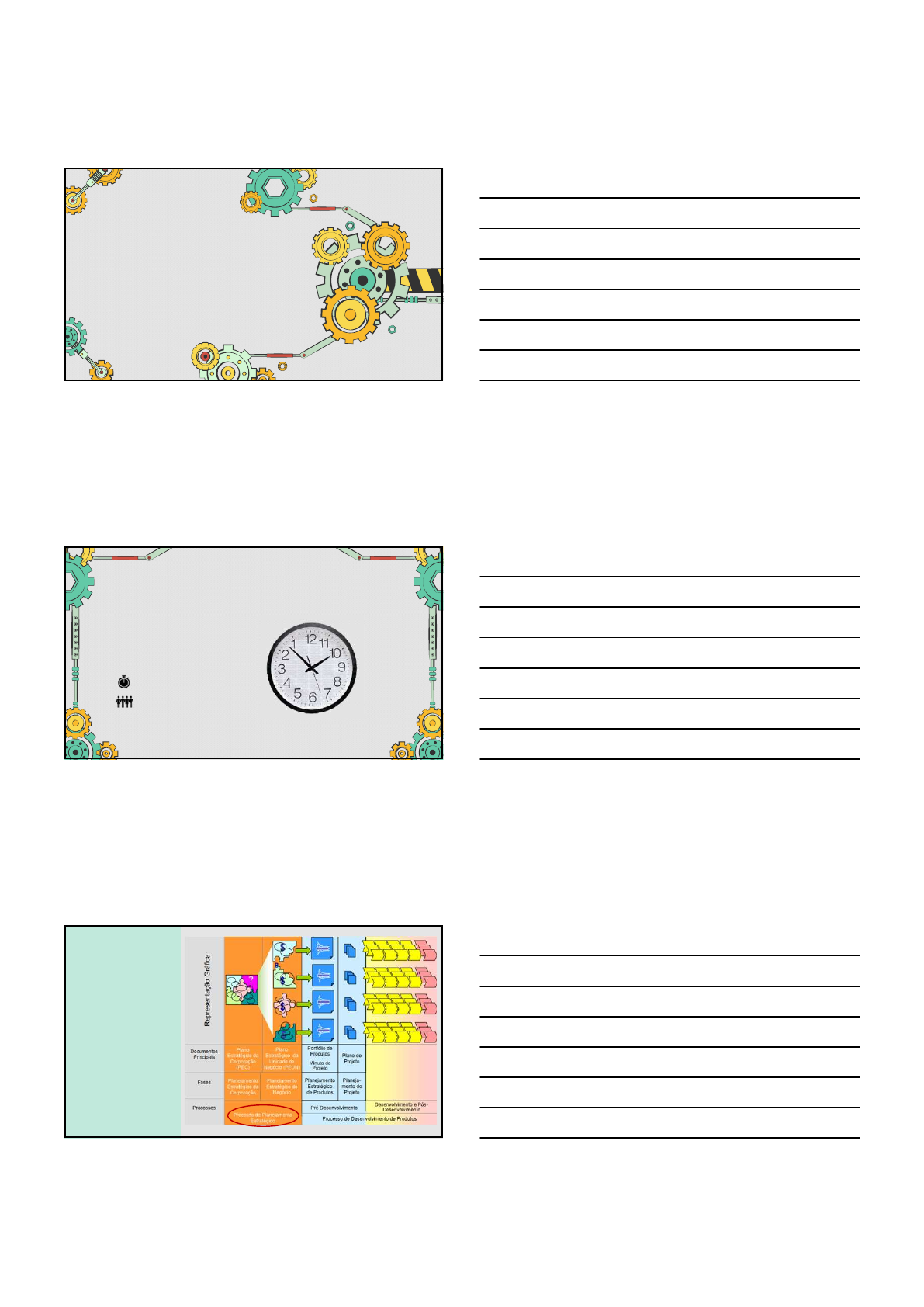 04/10/2024 PDP – As Fases do Processo Prof. Andrea Dal Bó ATIVIDADE Definir: Nome da empresa Segmento “Dores” ou necessidades do cliente 30 MINUTOS 4 INTEGRANTES Visão Geral da Macrofase de Pré- desenvolvimento 1 2 3 04/10/2024 }1º PLANEJAMENTO ESTRATÉGICO DO PRODUTO 2º PLANEJAMENTO DO PROJETO} Processo de Planejamento Estratégico O Planejamento Estratégico busca responder as questões: onde estamos, para onde vamos, como chegaremos lá, temos capacidade para realizar isso e como saberemos se estamos chegando lá. Fornece informações que orientam os processos de negócios da empresa, incluindo o PDP. Quem participa? Diretoria e Gerentes (Comitê Gestor / Time de Planejamento Estratégico). Quando ocorre? Normalmente no final do ano (um ou 2 meses). Horizonte? Curto, médio a longo prazo. Níveis de Planejamento Estratégico Corporativa Negócios Produtos Objetivos, Meios e Metas da Corporação Como distribuir os recursos nas Unidades de Negócios Objetivos, Meios e Metas da Unidade de Negócio Linha de Produtos e Estratégia Tecnológica dentro da Unidade de Negócio 4 5 6 04/10/2024 1º Pré: Planejamento Estratégico do Produto O objetivo desta fase inicial é obter um plano contendo o portfólio de produtos da empresa a partir do Planejamento Estratégico da organização/negócio. Na prática, isso significa apresentar uma lista descrevendo a linha de produtos da empresa e os projetos que serão desenvolvidos, para auxilia-la a atingir as metas estratégicas de negócio. Para os produtos em comercialização, esse portfólio de produtos deve incluir uma previsão da retirada do mercado. Com relação aos produtos a serem desenvolvidos, é preciso conter uma primeira descrição de suas características e metas para início de desenvolvimento, de lançamento e de retirada. A principal informação de entrada é o Plano Estratégico de Negócios. Esse plano contém a estratégia da empresa dentro de um horizonte de planejamento, que, em suma, define como a empresa pretende competir e quanto almeja crescer. A saída dessa fase é a definição de um portfólio de produtos e projetos que permitam que a empresa atinja este objetivo. Planejamento Estratégico da Corporação (PEC) Planejamento Estratégico do Negócio (PEN) Planejamento Estratégico de Produtos Aumentar a competitividade da empresa Estratégia: Lançar novos produtos no mercado Meta: aumentar n° lançamentos de novos produtos em 20% em todas as unidades, no próximo ano Massas frescas Massas frescas 2 produtos Coletar informações sobre o mercado (necessidades clientes, concorrentes), levantar informações sobre tecnologias, analisar portfólio atual (posicionamento produto, desempenho), propor mudanças no portfólio de produtos, verificar viabilidade do portfólio de produtos e finalmente decidir início do planejamento de cada um dos produtos do portfólio carne Congelados de carne 5 produtos cárneos Congelados não cárneos 2 produtos 1º Pré: Planejamento Estratégico do Produto PEP: Coletar informações sobre o mercado Fontes Secundárias Fontes Primárias 7 8 9 04/10/2024 PEP: Coletar informações tecnológicas Estruturar um sistema de vigilância Base técnica Mapear registro de patentes, institutos de pesquisa, universidades, concorrentes, outros setores 1. Maximizar o retorno financeiro 2. Alinhar com a estratégia da empresa 3. Balancear o portfólio de projetos (proporção adequada de projetos inovação – sobrevivência da empresa a longo prazo – com projetos de menor risco e alta lucratividade) Gestão do portfólio: Portfólio de produtos é o conjunto de produtos que a empresa está desenvolvendo ou que comercializa – visam obter resultados para a empresa (ex.: lucro) PEP: Analisar o portfólio de produtos da empresa Avaliação pelo Time de Planejamento Estratégico de Produtos (ex.: desempenho x concorrentes) Ideias de mudanças e possíveis novos produtos 10 11 12 04/10/2024 PEP: Analisar o portfólio de produtos da empresa Análise do valor comercial esperado – modelos de matemática financeira (investimento/retorno/risco) Modelos baseados em notas – critérios pré-definidos baseados em notas Modelos de gráficos de bolhas – possuem 3 dimensões (2 eixos e o diâmetro dos pontos – 4 quadrantes) PEP: Analisar o portfólio de produtos da empresa Quanto maior o valor, maior a prioridade Exemplo de Modelo baseado em notas PEP: Analisar o portfólio de produtos da empresa Exemplo de Modelo de gráfico de bolhas Pérolas – alto retorno financeiro e alta probabilidade de sucesso técnico Pão com manteiga – baixo retorno financeiro e baixo risco (incremental) Ostras – alto retorno mas probabilidade de sucesso baixa (se riscos forem reduzidos podem se transformar em pérolas) Elefante branco – baixo retorno e alto risco, mas benefícios de MKT 13 14 15 04/10/2024 Com os resultados das avaliações oriundas da etapa anterior o Time inicia a definição do portfólio de produtos futuro da empresa. Atividades que compreendem essa etapa: Preparar as minutas para cada um dos novos projetos Identificar os produtos a serem descontinuados Identificar os projetos a serem cancelados, congelados e redirecionados Consolidar proposta de novo portfólio de produtos Identificar os novos projetos que serão iniciados 01 04 02 05 03 PEP: Propor mudanças no portfólio de produtos Verificar a viabilidade econômica do Portfólio de Projetos “estimativas iniciais de investimento e retorno financeiro de cada projeto do portfólio” 1 Avaliar a disponibilidade de recursos “recursos financeiros e materiais para a implantação do portfólio – se não tiver disponível determinado recurso, da análise deve resultar a identificação de ações para obtenção: montar laboratório, adquirir equipamento, etc.” 2 Avaliar competências “internas ou de parceiro estratégico: contratação de pessoal, compra de direitos de patente, parceria com fornecedor que desenvolve um insumo e