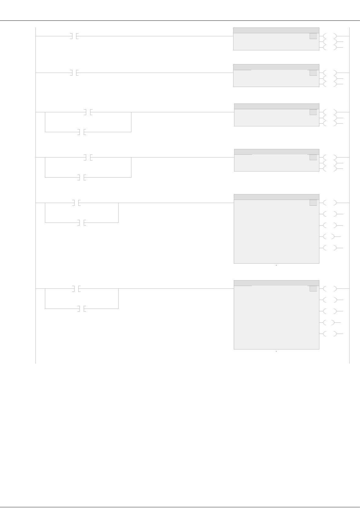 MainRoutine - Ladder Diagram Page 1 Bancada_09:MainTask:MainProgram 03/07/2023 20:59:26 Total number of rungs in routine: 34 C:\Users\Administrador\Desktop\Susana e Lívia\Grau B 2023.1\GrauB l\grauB_Diehl.ACD Logix Designer 0 SUPERV_HAB_SERVO_X EN DN ER Axis Motor_X ... Motion Control Motor_X_MSO MSO 1 SUPERV_HAB_SERVO_Y EN DN ER Axis Motor_Y ... Motion Control Motor_Y_MSO MSO 2 SUPERV_DESAB_SERVO_X / BOTAO_EMERGENCIA EN DN ER Axis Motor_X ... Motion Control Motor_X_MSF MSF 3 SUPERV_DESAB_SERVO_Y / BOTAO_EMERGENCIA EN DN ER Axis Motor_Y ... Motion Control Motor_Y_MSF MSF 4 STOP_ESTEIRA_1 / BOTAO_EMERGENCIA EN DN ER IP PC Axis Motor_X ... Motion Control Motor_X_MAS Stop Type All Change Decel No Decel Rate 100 Decel Units % of Maximum Change Decel Jerk No Decel Jerk 100 Jerk Units % of Maximum MAS 5 STOP_ESTEIRA_2 / BOTAO_EMERGENCIA EN DN ER IP PC Axis Motor_Y ... Motion Control Motor_Y_MAS Stop Type All Change Decel No Decel Rate 100 Decel Units % of Maximum Change Decel Jerk No Decel Jerk 100 Jerk Units % of Maximum MAS MainRoutine - Ladder Diagram Page 2 Bancada_09:MainTask:MainProgram 03/07/2023 20:59:27 Total number of rungs in routine: 34 C:\Users\Administrador\Desktop\Susana e Lívia\Grau B 2023.1\GrauB l\grauB_Diehl.ACD Logix Designer 6 START_ESTEIRA_1 EN DN ER IP Axis Motor_X ... Motion Control Motor_X_MAJ Direction Motor_X_MAJ_Dir 0 Speed Motor_X_MAJ_Vel 10 Speed Units Units per sec Accel Rate 100 Accel Units % of Maximum Decel Rate 100 Decel Units % of Maximum Profile S-Curve Accel Jerk 100 Decel Jerk 100 Jerk Units % of Maximum Merge Disabled Merge Speed Current Lock Position 0 Lock Direction None MAJ 7 START_ESTEIRA_2 EN DN ER IP Axis Motor_Y ... Motion Control Motor_Y_MAJ Direction Motor_Y_MAJ_Dir 0 Speed Motor_Y_MAJ_Vel 1 Speed Units Units per sec Accel Rate 100 Accel Units % of Maximum Decel Rate 100 Decel Units % of Maximum Profile S-Curve Accel Jerk 100 Decel Jerk 100 Jerk Units % of Maximum Merge Disabled Merge Speed Current Lock Position 0 Lock Direction None MAJ 8 Source A CICLOS_FINALIZADOS 4 Source B CICLOS_DESEJADOS 10 GEQ LOTE_FINALIZADO 9 / BOTAO_EMERGENCIA U MEM_START_CICLO MainRoutine - Ladder Diagram Page 3 Bancada_09:MainTask:MainProgram 03/07/2023 20:59:27 Total number of rungs in routine: 34 C:\Users\Administrador\Desktop\Susana e Lívia\Grau B 2023.1\GrauB l\grauB_Diehl.ACD Logix Designer 10 BOTAO_INICIO PERMITE_INICIO_CICLO RESTART_ESTEIRA_1 / LOTE_FINALIZADO BOTAO_EMERGENCIA / SENSOR_INDUTIVO PERMITE_INICIO_CICLO L MEM_START_CICLO 11 BOTAO_INICIO / LOTE_FINALIZADO BOTAO_EMERGENCIA SENSOR_INDUTIVO ACIONA_ROBO_SEM_ESTEIRA 12 PERMITE_INICIO_CICLO START_ESTEIRA_1 13 SENSOR_INDUTIVO STOP_ESTEIRA_1 14 SENSOR_INDUTIVO ACIONA_ROBO_SEM_ESTEIRA MEM_START_CICLO / ROBO_COM_PECA L MANDA SINAL PARA AVISAR O ROBÔ QUE A ESTEIRA 1 ESTÁ COM PEÇA POSICIONADA SINAL_P_ROBO_EST_1 L ROBO_EM_MOVIMENTO_1 15 SINAL QUE VEM DO ROBÔ PARA RELIGAR A ESTEIRA 1 ROBO_LIBERA_ESTEIRA_1 RESTART_ESTEIRA_1 U ROBO_EM_MOVIMENTO_1 16 BOTAO_INICIO PERMITE_ESTEIRA_2 / LOTE_FINALIZADO BOTAO_EMERGENCIA PERMITE_ESTEIRA_2 17 PERMITE_ESTEIRA_2 SENSOR_OTICO SINAL QUE VEM DO ROBÔ PARA RELIGAR ESTEIRA 2 ROBO_LIBERA_ESTEIRA_2 BOTAO_INICIO / SENSOR_OTICO START_ESTEIRA_2 18 PERMITE_ESTEIRA_2 SENSOR_OTICO / SINAL QUE VEM DO ROBÔ PARA RELIGAR A ESTEIRA 1 ROBO_LIBERA_ESTEIRA_1 STOP_ESTEIRA_2 MainRoutine - Ladder Diagram Page 4 Bancada_09:MainTask:MainProgram 03/07/2023 20:59:27 Total number of rungs in routine: 34 C:\Users\Administrador\Desktop\Susana e Lívia\Grau B 2023.1\GrauB l\grauB_Diehl.ACD Logix Designer 19 PERMITE_ESTEIRA_2 SENSOR_OTICO ROBO_COM_PECA MANDA SINAL PARA O ROBÔ PARA AVISA QUE A ESTEIRA 2 TEM CAIXA POSICIONADA SINAL_P_ROBO_EST_2 L ROBO_EM_MOVIMENTO_2 20 SINAL QUE VEM DO ROBÔ PARA RELIGAR ESTEIRA 2 ROBO_LIBERA_ESTEIRA_2 U ROBO_EM_MOVIMENTO_2 21 SINAL QUE VEM DO ROBÔ PARA RELIGAR ESTEIRA 2 ROBO_LIBERA_ESTEIRA_2 SB OB Storage Bit BIT_Z Output Bit BIT_X OSR 22 BIT_X Source A CICLOS_FINALIZADOS 4 Source B SOMA_1 1 Dest CICLOS_FINALIZADOS 4 ADD 23 Source A CICLOS_DESEJADOS 10 Source B CICLOS_FINALIZADOS 4 Dest PECAS_FALTANTES 6 SUB 24 ZERA_QTD_PECAS Source CONST_ZERO 0 Dest CICLOS_FINALIZADOS 4 MOV 25 SENSOR_INDUTIVO / ROBO_COM_PECA SENSOR_OTICO ROBO_COM_PECA LED_VERDE ROBO_EM_CICLO1 26 ROBO_COM_PECA ROBO_EM_CICLO2 27 ROBO_EM_CICLO1 ROBO_EM_CICLO2 ROBO_EM_CICLO MainRoutine - Ladder Diagram Page 5 Bancada_09:MainTask:MainProgram 03/07/2023 20:59:27 Total number of rungs in routine: 34 C:\Users\Administrador\Desktop\Susana e Lívia\Grau B 2023.1\GrauB l\grauB_Diehl.ACD Logix Designer 28 SENSOR_INDUTIVO SB OB Storage Bit A1 Output Bit A2 OSF 29 MANDA SINAL PARA AVISAR O ROBÔ QUE A ESTEIRA 1 ESTÁ COM PEÇA POSICIONADA SINAL_P_ROBO_EST_1 A2 EN DN Timer TEMPO_PULSO Preset 100 Accum 100 TOF 30 TEMPO_PULSO.DN L ROBO_COM_PECA U MANDA SINAL PARA AVISAR O ROBÔ QUE A ESTEIRA 1 ESTÁ COM PEÇA POSICIONADA SINAL_P_ROBO_EST_1 31 SINAL QUE VEM DO ROBÔ PARA RELIGAR ESTEIRA 2 ROBO_LIBERA_ESTEIRA_2 U ROBO_COM_PECA L LED_VERMELHO 32 / BOTAO_EMERGENCIA U ROBO_EM_MOVIMENTO_1 U ROBO_EM_MOVIMENTO_2 U ROBO_COM_PECA 33 MANDA SINAL PARA AVISAR O ROBÔ QUE A ESTEIRA 1 ESTÁ COM PEÇA POSICIONADA SINAL_P_ROBO_EST_1 MANDA SINAL PARA O ROBÔ PARA AVISA QUE A ESTEIRA 2 TEM CAIXA POSICIONADA SINAL_P_ROBO_EST_2 U LED_VERMELHO (End)