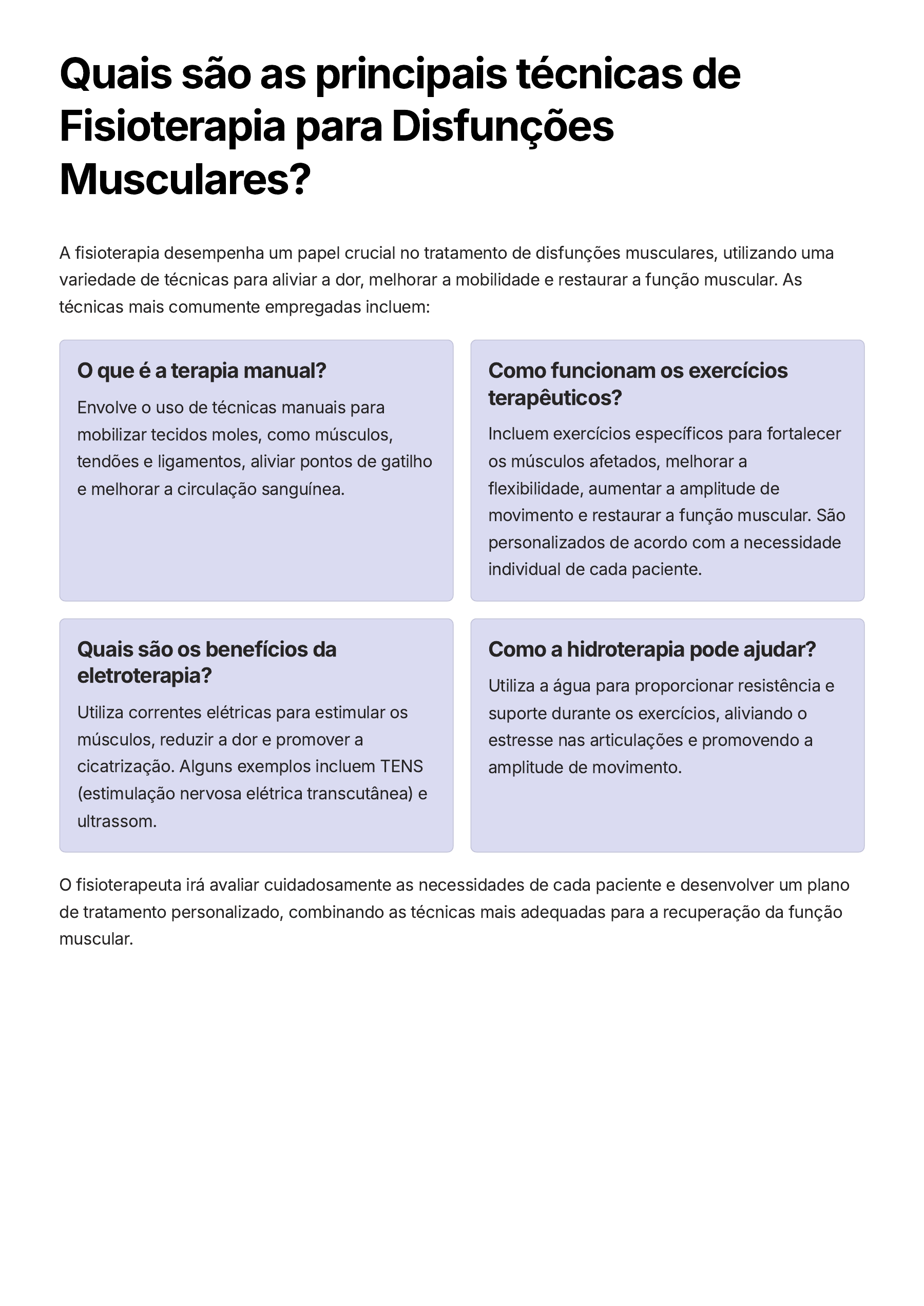 Quais são as principais técnicas de Fisioterapia para Disfunções Musculares? A fisioterapia desempenha um papel crucial no tratamento de disfunções musculares, utilizando uma variedade de técnicas para aliviar a dor, melhorar a mobilidade e restaurar a função muscular. As técnicas mais comumente empregadas incluem: O que é a terapia manual? Envolve o uso de técnicas manuais para mobilizar tecidos moles, como músculos, tendões e ligamentos, aliviar pontos de gatilho e melhorar a circulação sanguínea. Como funcionam os exercícios terapêuticos? Incluem exercícios específicos para fortalecer os músculos afetados, melhorar a flexibilidade, aumentar a amplitude de movimento e restaurar a função muscular. São personalizados de acordo com a necessidade individual de cada paciente. Quais são os benefícios da eletroterapia? Utiliza correntes elétricas para estimular os músculos, reduzir a dor e promover a cicatrização. Alguns exemplos incluem TENS (estimulação nervosa elétrica transcutânea) e ultrassom. Como a hidroterapia pode ajudar? Utiliza a água para proporcionar resistência e suporte durante os exercícios, aliviando o estresse nas articulações e promovendo a amplitude de movimento. O fisioterapeuta irá avaliar cuidadosamente as necessidades de cada paciente e desenvolver um plano de tratamento personalizado, combinando as técnicas mais adequadas para a recuperação da função muscular. Qual é o Papel da Alimentação no Tratamento de Disfunções Musculares? A alimentação desempenha um papel crucial na recuperação de disfunções musculares. Uma dieta equilibrada e nutritiva fornece os nutrientes essenciais para o reparo muscular e a regeneração tecidual. É importante seguir as recomendações do nutricionista para otimizar o tratamento e acelerar a recuperação. Consumo de Proteínas: Aumentar a ingestão de proteínas é fundamental para a reparação e construção muscular. Priorize fontes magras como frango, peixe, carne magra, ovo, leguminosas e derivados do leite. Hidratação Adequada: A água é essencial para o bom funcionamento do corpo, incluindo o processo de reparo muscular. Beba bastante água ao longo do dia para evitar desidratação. Frutas e Vegetais: Consuma frutas e vegetais ricos em vitaminas, minerais e antioxidantes, que contribuem para a saúde geral e o fortalecimento do sistema imunológico. Gorduras Saudáveis: Inclua gorduras saudáveis em sua dieta, como as encontradas em azeite de oliva, abacate e oleaginosas, que são importantes para a absorção de vitaminas e a saúde das células. É importante lembrar que cada caso é único e o nutricionista irá adaptar o plano alimentar às necessidades individuais do paciente. Evite alimentos processados, ricos em açúcar e gorduras saturadas, que podem prejudicar a recuperação e aumentar a inflamação.