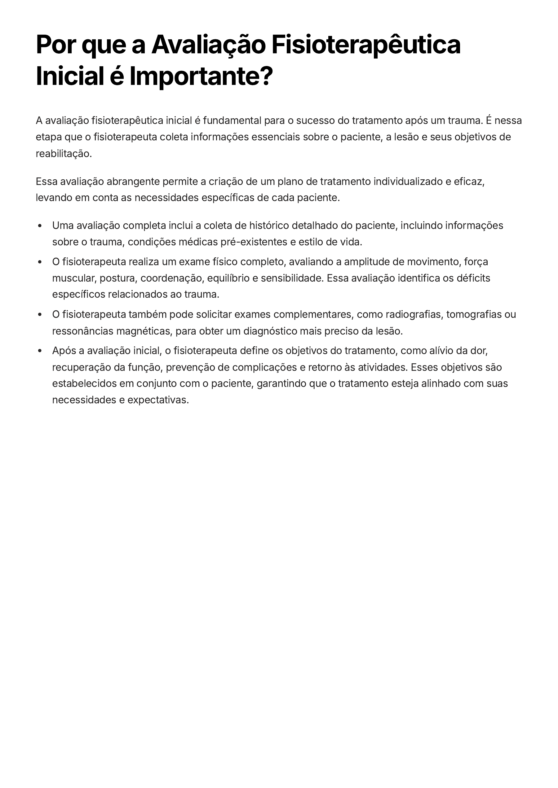 Por que a Avaliação Fisioterapêutica Inicial é Importante? A avaliação fisioterapêutica inicial é fundamental para o sucesso do tratamento após um trauma. É nessa etapa que o fisioterapeuta coleta informações essenciais sobre o paciente, a lesão e seus objetivos de reabilitação. Essa avaliação abrangente permite a criação de um plano de tratamento individualizado e eficaz, levando em conta as necessidades específicas de cada paciente. Uma avaliação completa inclui a coleta de histórico detalhado do paciente, incluindo informações sobre o trauma, condições médicas pré-existentes e estilo de vida. O fisioterapeuta realiza um exame físico completo, avaliando a amplitude de movimento, força muscular, postura, coordenação, equilíbrio e sensibilidade. Essa avaliação identifica os déficits específicos relacionados ao trauma. O fisioterapeuta também pode solicitar exames complementares, como radiografias, tomografias ou ressonâncias magnéticas, para obter um diagnóstico mais preciso da lesão. Após a avaliação inicial, o fisioterapeuta define os objetivos do tratamento, como alívio da dor, recuperação da função, prevenção de complicações e retorno às atividades. Esses objetivos são estabelecidos em conjunto com o paciente, garantindo que o tratamento esteja alinhado com suas necessidades e expectativas. Quais são os objetivos da Fisioterapia no Tratamento de Traumas? A fisioterapia desempenha um papel crucial na recuperação de pacientes que sofreram traumas, com o objetivo principal de restaurar a função, a mobilidade e a independência do indivíduo. O tratamento fisioterapêutico visa atingir uma série de objetivos específicos, de acordo com a natureza e a gravidade do trauma, bem como as necessidades individuais do paciente. Os objetivos da fisioterapia em traumas podem ser divididos em: Objetivos Primários • Reduzir a dor e o inchaço: O controle da dor é fundamental para permitir a mobilidade e o início da reabilitação. Técnicas como crioterapia, eletroterapia e exercícios de amplitude de movimento são utilizadas para aliviar a dor e reduzir o inchaço. • Restaurar a amplitude de movimento: A fisioterapia visa recuperar a amplitude de movimento das articulações afetadas pelo trauma, através de exercícios específicos e técnicas de mobilização. • Fortalecer os músculos: Exercícios de fortalecimento muscular são essenciais para restaurar a força e a função muscular, especialmente em casos de lesões musculares ou de fraturas. • Melhorar a propriocepção e o equilíbrio: A propriocepção é a capacidade do corpo de perceber sua posição no espaço. A fisioterapia auxilia na recuperação da propriocepção e do equilíbrio, através de exercícios específicos e treinamento proprioceptivo. Objetivos Secundários • Prevenir complicações: A fisioterapia também visa prevenir complicações comuns após traumas, como rigidez articular, atrofia muscular e formação de aderências. • Educar o paciente: A fisioterapia inclui a educação do paciente sobre sua condição, o tratamento e as medidas preventivas para evitar novas lesões. • Retorno gradual às atividades: A fisioterapia auxilia na reintegração do paciente às atividades da vida diária, trabalho e esportes, de forma gradual e segura, de acordo com sua capacidade de recuperação. • Melhorar a qualidade de vida: A fisioterapia tem como objetivo melhorar a qualidade de vida do paciente, reduzindo a dor, o desconforto e as limitações funcionais, promovendo a independência e o bem-estar físico e emocional.