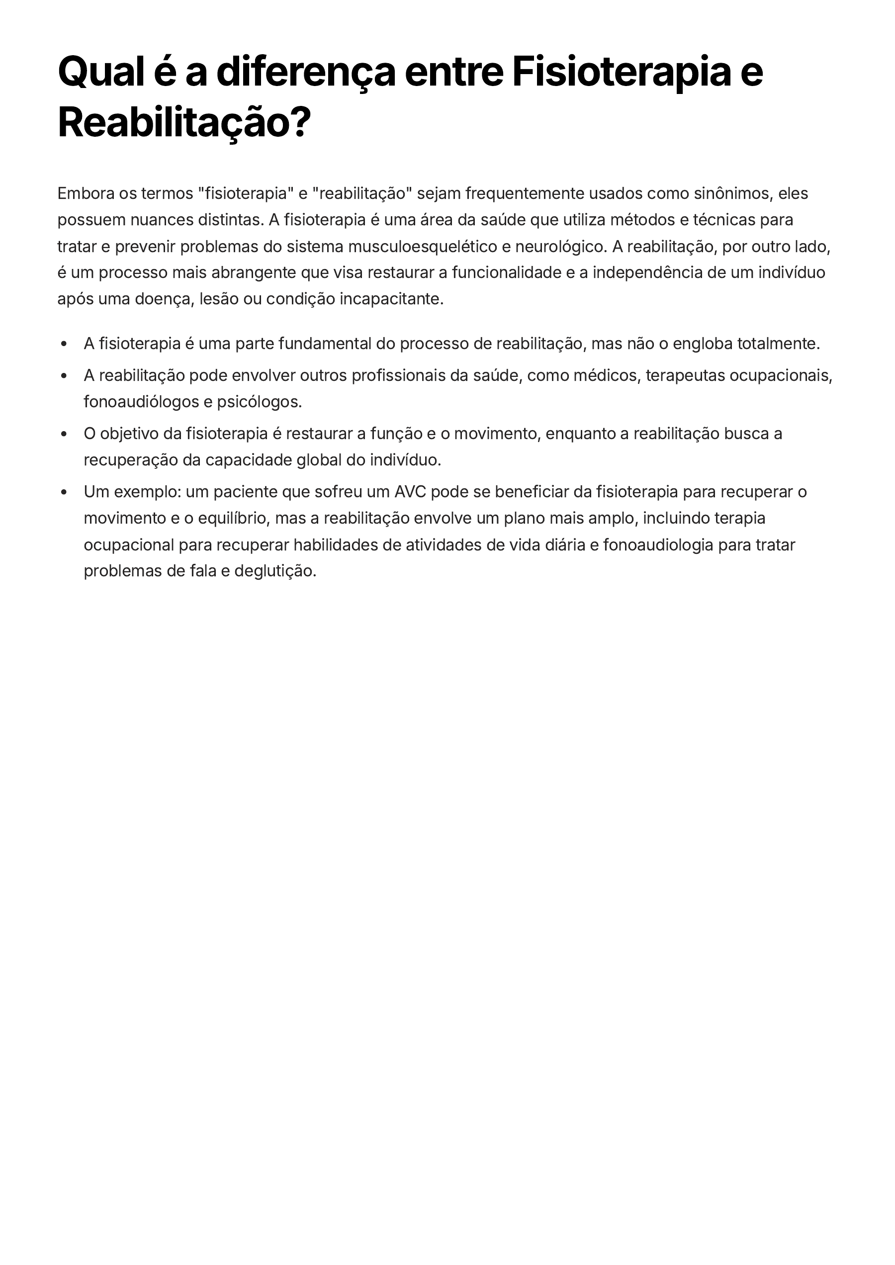 Qual é a diferença entre Fisioterapia e Reabilitação? Embora os termos "fisioterapia" e "reabilitação" sejam frequentemente usados como sinônimos, eles possuem nuances distintas. A fisioterapia é uma área da saúde que utiliza métodos e técnicas para tratar e prevenir problemas do sistema musculoesquelético e neurológico. A reabilitação, por outro lado, é um processo mais abrangente que visa restaurar a funcionalidade e a independência de um indivíduo após uma doença, lesão ou condição incapacitante. A fisioterapia é uma parte fundamental do processo de reabilitação, mas não o engloba totalmente. A reabilitação pode envolver outros profissionais da saúde, como médicos, terapeutas ocupacionais, fonoaudiólogos e psicólogos. O objetivo da fisioterapia é restaurar a função e o movimento, enquanto a reabilitação busca a recuperação da capacidade global do indivíduo. Um exemplo: um paciente que sofreu um AVC pode se beneficiar da fisioterapia para recuperar o movimento e o equilíbrio, mas a reabilitação envolve um plano mais amplo, incluindo terapia ocupacional para recuperar habilidades de atividades de vida diária e fonoaudiologia para tratar problemas de fala e deglutição. Quando devo procurar um fisioterapeuta após um trauma? É essencial procurar um fisioterapeuta o mais rápido possível após um trauma, mesmo que você não esteja sentindo muita dor ou desconforto. Um profissional de fisioterapia pode avaliar sua condição, identificar possíveis problemas e iniciar o tratamento adequado. A fisioterapia precoce pode ajudar a prevenir complicações, melhorar a recuperação e reduzir o tempo de reabilitação. Se você sofreu uma lesão, mesmo que seja leve. Se você está sentindo dor, inchaço, rigidez ou limitação de movimento. Se você tem dificuldade para realizar atividades diárias. Se você está preocupado com a recuperação da sua lesão. Um fisioterapeuta pode ajudá-lo a: Reduzir a dor e o inchaço. Melhorar a amplitude de movimento. Fortalecer os músculos. Reaprender movimentos e habilidades. Prevenir complicações. Retornar às suas atividades diárias e esportivas. Não hesite em procurar um fisioterapeuta caso você tenha sofrido um trauma. A fisioterapia é fundamental para uma recuperação completa e para evitar sequelas a longo prazo.