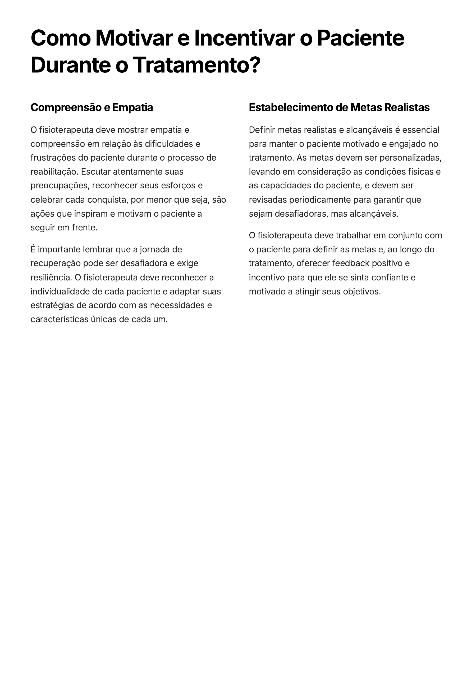 Como Motivar e Incentivar o Paciente Durante o Tratamento? Compreensão e Empatia O fisioterapeuta deve mostrar empatia e compreensão em relação às dificuldades e frustrações do paciente durante o processo de reabilitação. Escutar atentamente suas preocupações, reconhecer seus esforços e celebrar cada conquista, por menor que seja, são ações que inspiram e motivam o paciente a seguir em frente. É importante lembrar que a jornada de recuperação pode ser desafiadora e exige resiliência. O fisioterapeuta deve reconhecer a individualidade de cada paciente e adaptar suas estratégias de acordo com as necessidades e características únicas de cada um. Estabelecimento de Metas Realistas Definir metas realistas e alcançáveis é essencial para manter o paciente motivado e engajado no tratamento. As metas devem ser personalizadas, levando em consideração as condições físicas e as capacidades do paciente, e devem ser revisadas periodicamente para garantir que sejam desafiadoras, mas alcançáveis. O fisioterapeuta deve trabalhar em conjunto com o paciente para definir as metas e, ao longo do tratamento, oferecer feedback positivo e incentivo para que ele se sinta confiante e motivado a atingir seus objetivos. Como educar o paciente sobre sua condição e tratamento? A educação do paciente é um pilar fundamental no sucesso do tratamento fisioterapêutico após um trauma. Um paciente bem informado sobre sua condição e o plano de tratamento é mais propenso a se engajar ativamente em sua recuperação, compreender as etapas do processo e seguir as recomendações do fisioterapeuta. Compreender a natureza do trauma, incluindo a localização, o tipo de lesão e o mecanismo de lesão. Esclarecimento sobre o tratamento proposto, incluindo os objetivos, duração esperada e possíveis riscos e benefícios. Orientação sobre exercícios e técnicas de reabilitação, com demonstrações práticas e explicações claras. Ensinar o paciente sobre como gerenciar a dor, identificar sinais de alerta e tomar medidas preventivas para evitar novos traumas. A comunicação clara e transparente entre o fisioterapeuta e o paciente é crucial para garantir uma experiência positiva de reabilitação. Através da educação, o paciente se torna um parceiro ativo no processo de recuperação, assumindo responsabilidades em seu bem-estar e alcançando melhores resultados a longo prazo.