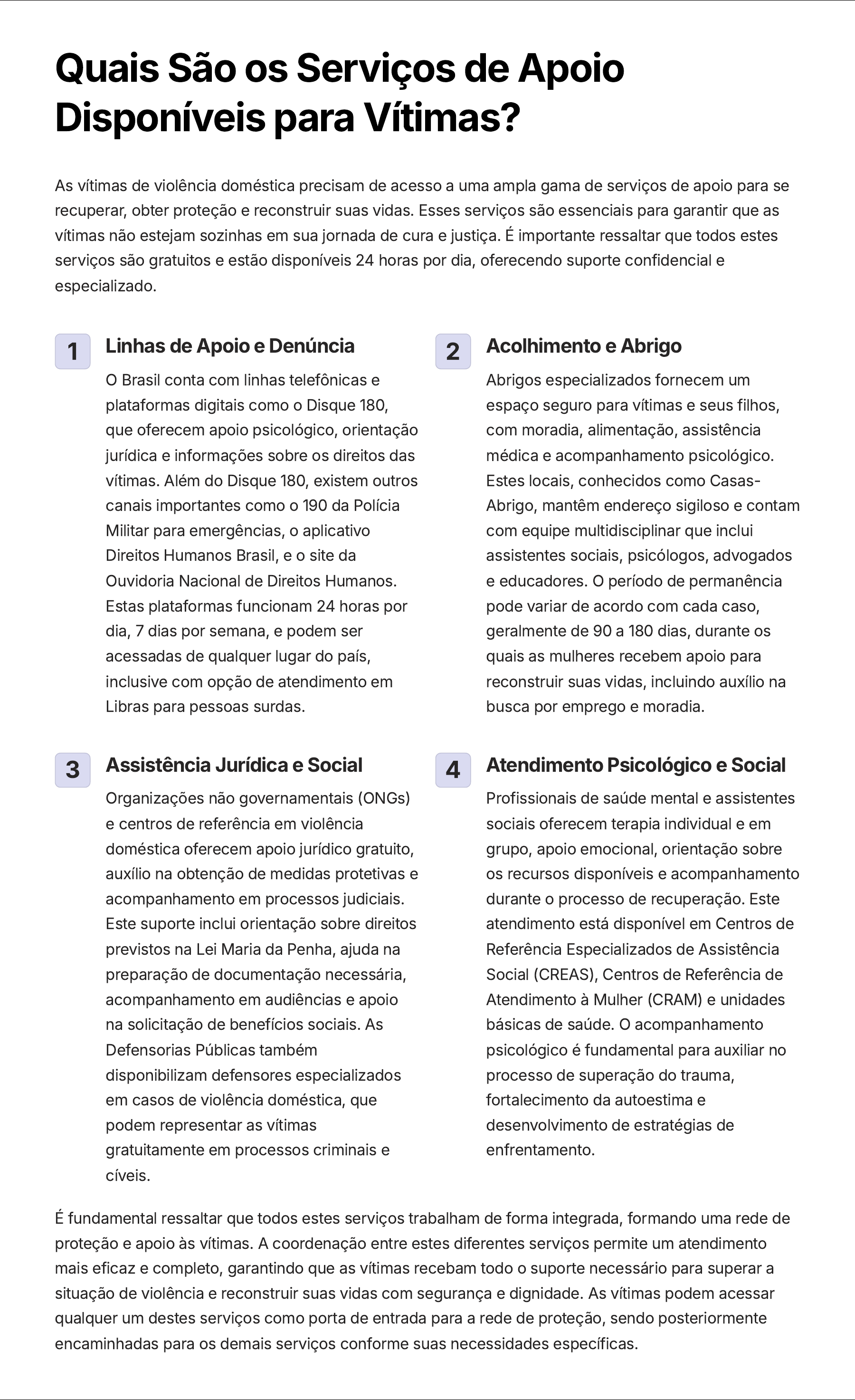 Quais São os Serviços de Apoio Disponíveis para Vítimas? As vítimas de violência doméstica precisam de acesso a uma ampla gama de serviços de apoio para se recuperar, obter proteção e reconstruir suas vidas. Esses serviços são essenciais para garantir que as vítimas não estejam sozinhas em sua jornada de cura e justiça. É importante ressaltar que todos estes serviços são gratuitos e estão disponíveis 24 horas por dia, oferecendo suporte confidencial e especializado. 1 Linhas de Apoio e Denúncia O Brasil conta com linhas telefônicas e plataformas digitais como o Disque 180, que oferecem apoio psicológico, orientação jurídica e informações sobre os direitos das vítimas. Além do Disque 180, existem outros canais importantes como o 190 da Polícia Militar para emergências, o aplicativo Direitos Humanos Brasil, e o site da Ouvidoria Nacional de Direitos Humanos. Estas plataformas funcionam 24 horas por dia, 7 dias por semana, e podem ser acessadas de qualquer lugar do país, inclusive com opção de atendimento em Libras para pessoas surdas. 2 Acolhimento e Abrigo Abrigos especializados fornecem um espaço seguro para vítimas e seus filhos, com moradia, alimentação, assistência médica e acompanhamento psicológico. Estes locais, conhecidos como Casas- Abrigo, mantêm endereço sigiloso e contam com equipe multidisciplinar que inclui assistentes sociais, psicólogos, advogados e educadores. O período de permanência pode variar de acordo com cada caso, geralmente de 90 a 180 dias, durante os quais as mulheres recebem apoio para reconstruir suas vidas, incluindo auxílio na busca por emprego e moradia. 3 Assistência Jurídica e Social Organizações não governamentais (ONGs) e centros de referência em violência doméstica oferecem apoio jurídico gratuito, auxílio na obtenção de medidas protetivas e acompanhamento em processos judiciais. Este suporte inclui orientação sobre direitos previstos na Lei Maria da Penha, ajuda na preparação de documentação necessária, acompanhamento em audiências e apoio na solicitação de benefícios sociais. As Defensorias Públicas também disponibilizam defensores especializados em casos de violência doméstica, que podem representar as vítimas gratuitamente em processos criminais e cíveis. 4 Atendimento Psicológico e Social Profissionais de saúde mental e assistentes sociais oferecem terapia individual e em grupo, apoio emocional, orientação sobre os recursos disponíveis e acompanhamento durante o processo de recuperação. Este atendimento está disponível em Centros de Referência Especializados de Assistência Social (CREAS), Centros de Referência de Atendimento à Mulher (CRAM) e unidades básicas de saúde. O acompanhamento psicológico é fundamental para auxiliar no processo de superação do trauma, fortalecimento da autoestima e desenvolvimento de estratégias de enfrentamento. É fundamental ressaltar que todos estes serviços trabalham de forma integrada, formando uma rede de proteção e apoio às vítimas. A coordenação entre estes diferentes serviços permite um atendimento mais eficaz e completo, garantindo que as vítimas recebam todo o suporte necessário para superar a situação de violência e reconstruir suas vidas com segurança e dignidade. As vítimas podem acessar qualquer um destes serviços como porta de entrada para a rede de proteção, sendo posteriormente encaminhadas para os demais serviços conforme suas necessidades específicas.