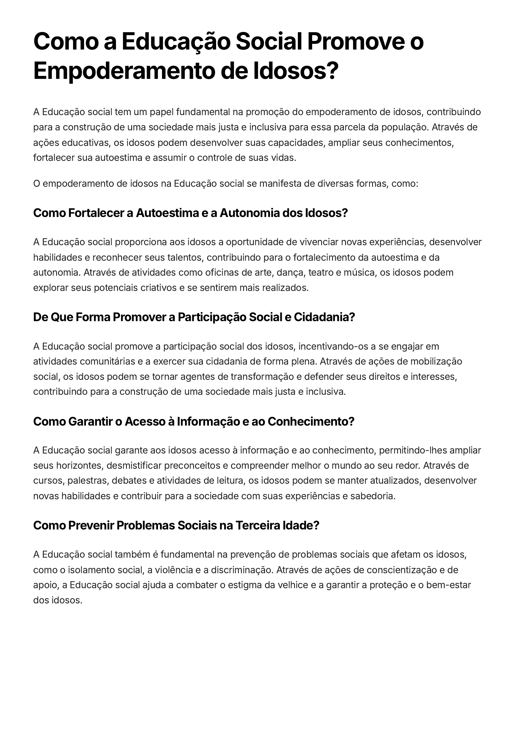 Como a Educação Social Promove o Empoderamento de Idosos? A Educação social tem um papel fundamental na promoção do empoderamento de idosos, contribuindo para a construção de uma sociedade mais justa e inclusiva para essa parcela da população. Através de ações educativas, os idosos podem desenvolver suas capacidades, ampliar seus conhecimentos, fortalecer sua autoestima e assumir o controle de suas vidas. O empoderamento de idosos na Educação social se manifesta de diversas formas, como: Como Fortalecer a Autoestima e a Autonomia dos Idosos? A Educação social proporciona aos idosos a oportunidade de vivenciar novas experiências, desenvolver habilidades e reconhecer seus talentos, contribuindo para o fortalecimento da autoestima e da autonomia. Através de atividades como oficinas de arte, dança, teatro e música, os idosos podem explorar seus potenciais criativos e se sentirem mais realizados. De Que Forma Promover a Participação Social e Cidadania? A Educação social promove a participação social dos idosos, incentivando-os a se engajar em atividades comunitárias e a exercer sua cidadania de forma plena. Através de ações de mobilização social, os idosos podem se tornar agentes de transformação e defender seus direitos e interesses, contribuindo para a construção de uma sociedade mais justa e inclusiva. Como Garantir o Acesso à Informação e ao Conhecimento? A Educação social garante aos idosos acesso à informação e ao conhecimento, permitindo-lhes ampliar seus horizontes, desmistificar preconceitos e compreender melhor o mundo ao seu redor. Através de cursos, palestras, debates e atividades de leitura, os idosos podem se manter atualizados, desenvolver novas habilidades e contribuir para a sociedade com suas experiências e sabedoria. Como Prevenir Problemas Sociais na Terceira Idade? A Educação social também é fundamental na prevenção de problemas sociais que afetam os idosos, como o isolamento social, a violência e a discriminação. Através de ações de conscientização e de apoio, a Educação social ajuda a combater o estigma da velhice e a garantir a proteção e o bem-estar dos idosos.