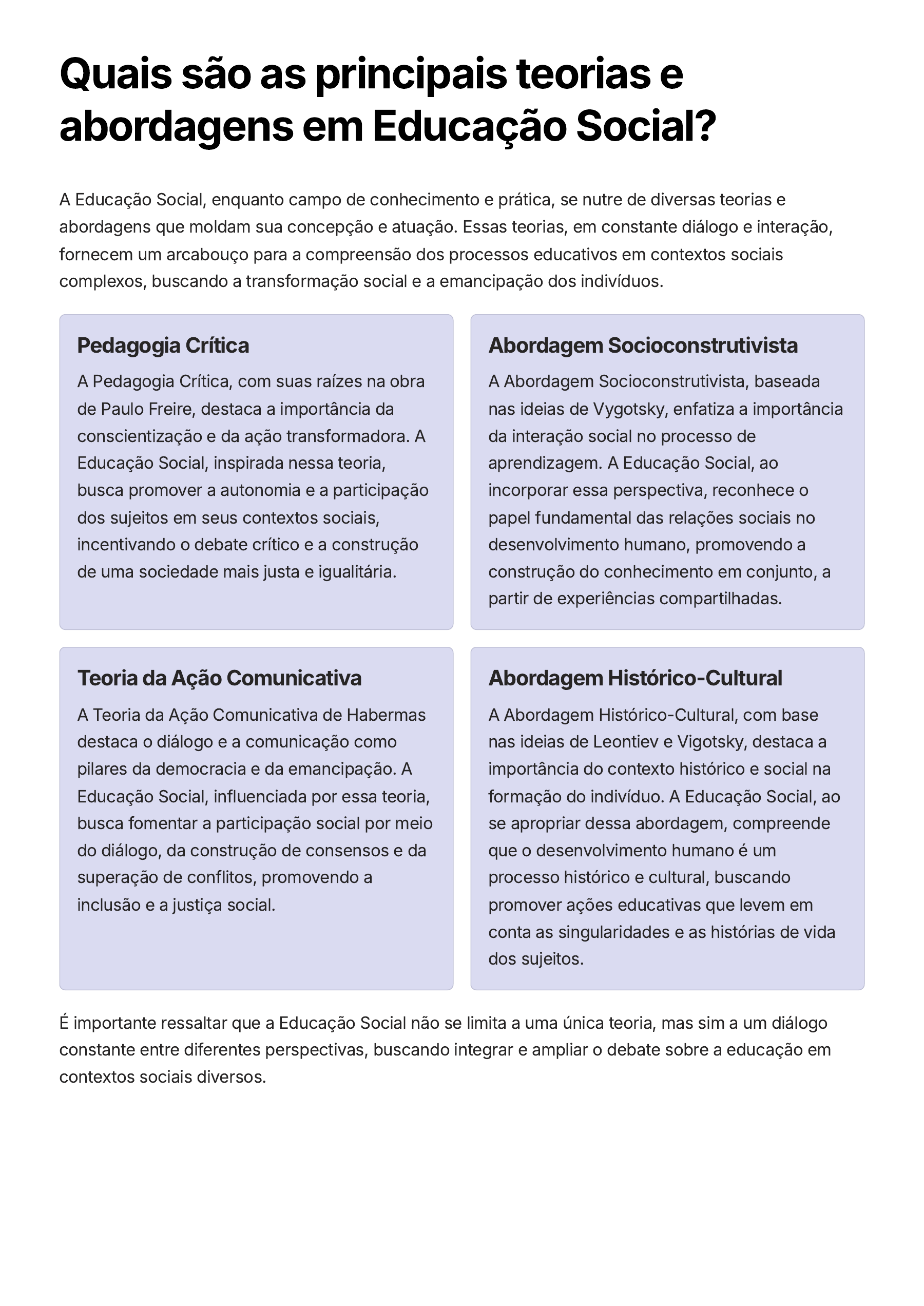 Quais são as principais teorias e abordagens em Educação Social? A Educação Social, enquanto campo de conhecimento e prática, se nutre de diversas teorias e abordagens que moldam sua concepção e atuação. Essas teorias, em constante diálogo e interação, fornecem um arcabouço para a compreensão dos processos educativos em contextos sociais complexos, buscando a transformação social e a emancipação dos indivíduos. Pedagogia Crítica A Pedagogia Crítica, com suas raízes na obra de Paulo Freire, destaca a importância da conscientização e da ação transformadora. A Educação Social, inspirada nessa teoria, busca promover a autonomia e a participação dos sujeitos em seus contextos sociais, incentivando o debate crítico e a construção de uma sociedade mais justa e igualitária. Abordagem Socioconstrutivista A Abordagem Socioconstrutivista, baseada nas ideias de Vygotsky, enfatiza a importância da interação social no processo de aprendizagem. A Educação Social, ao incorporar essa perspectiva, reconhece o papel fundamental das relações sociais no desenvolvimento humano, promovendo a construção do conhecimento em conjunto, a partir de experiências compartilhadas. Teoria da Ação Comunicativa A Teoria da Ação Comunicativa de Habermas destaca o diálogo e a comunicação como pilares da democracia e da emancipação. A Educação Social, influenciada por essa teoria, busca fomentar a participação social por meio do diálogo, da construção de consensos e da superação de conflitos, promovendo a inclusão e a justiça social. Abordagem Histórico-Cultural A Abordagem Histórico-Cultural, com base nas ideias de Leontiev e Vigotsky, destaca a importância do contexto histórico e social na formação do indivíduo. A Educação Social, ao se apropriar dessa abordagem, compreende que o desenvolvimento humano é um processo histórico e cultural, buscando promover ações educativas que levem em conta as singularidades e as histórias de vida dos sujeitos. É importante ressaltar que a Educação Social não se limita a uma única teoria, mas sim a um diálogo constante entre diferentes perspectivas, buscando integrar e ampliar o debate sobre a educação em contextos sociais diversos.