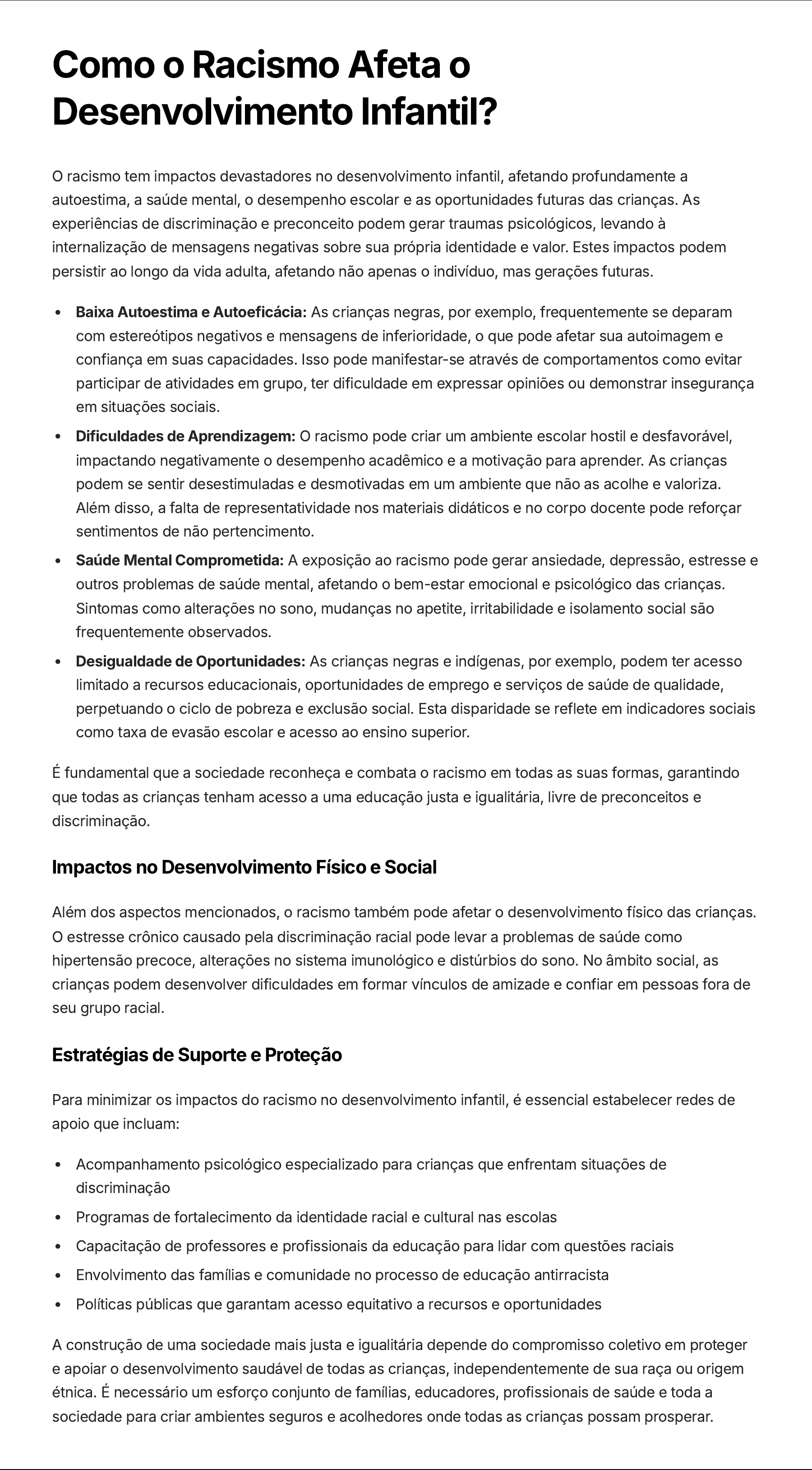 Como o Racismo Afeta o Desenvolvimento Infantil? O racismo tem impactos devastadores no desenvolvimento infantil, afetando profundamente a autoestima, a saúde mental, o desempenho escolar e as oportunidades futuras das crianças. As experiências de discriminação e preconceito podem gerar traumas psicológicos, levando à internalização de mensagens negativas sobre sua própria identidade e valor. Estes impactos podem persistir ao longo da vida adulta, afetando não apenas o indivíduo, mas gerações futuras. Baixa Autoestima e Autoeficácia: As crianças negras, por exemplo, frequentemente se deparam com estereótipos negativos e mensagens de inferioridade, o que pode afetar sua autoimagem e confiança em suas capacidades. Isso pode manifestar-se através de comportamentos como evitar participar de atividades em grupo, ter dificuldade em expressar opiniões ou demonstrar insegurança em situações sociais. Dificuldades de Aprendizagem: O racismo pode criar um ambiente escolar hostil e desfavorável, impactando negativamente o desempenho acadêmico e a motivação para aprender. As crianças podem se sentir desestimuladas e desmotivadas em um ambiente que não as acolhe e valoriza. Além disso, a falta de representatividade nos materiais didáticos e no corpo docente pode reforçar sentimentos de não pertencimento. Saúde Mental Comprometida: A exposição ao racismo pode gerar ansiedade, depressão, estresse e outros problemas de saúde mental, afetando o bem-estar emocional e psicológico das crianças. Sintomas como alterações no sono, mudanças no apetite, irritabilidade e isolamento social são frequentemente observados. Desigualdade de Oportunidades: As crianças negras e indígenas, por exemplo, podem ter acesso limitado a recursos educacionais, oportunidades de emprego e serviços de saúde de qualidade, perpetuando o ciclo de pobreza e exclusão social. Esta disparidade se reflete em indicadores sociais como taxa de evasão escolar e acesso ao ensino superior. É fundamental que a sociedade reconheça e combata o racismo em todas as suas formas, garantindo que todas as crianças tenham acesso a uma educação justa e igualitária, livre de preconceitos e discriminação. Impactos no Desenvolvimento Físico e Social Além dos aspectos mencionados, o racismo também pode afetar o desenvolvimento físico das crianças. O estresse crônico causado pela discriminação racial pode levar a problemas de saúde como hipertensão precoce, alterações no sistema imunológico e distúrbios do sono. No âmbito social, as crianças podem desenvolver dificuldades em formar vínculos de amizade e confiar em pessoas fora de seu grupo racial. Estratégias de Suporte e Proteção Para minimizar os impactos do racismo no desenvolvimento infantil, é essencial estabelecer redes de apoio que incluam: Acompanhamento psicológico especializado para crianças que enfrentam situações de discriminação Programas de fortalecimento da identidade racial e cultural nas escolas Capacitação de professores e profissionais da educação para lidar com questões raciais Envolvimento das famílias e comunidade no processo de educação antirracista Políticas públicas que garantam acesso equitativo a recursos e oportunidades A construção de uma sociedade mais justa e igualitária depende do compromisso coletivo em proteger e apoiar o desenvolvimento saudável de todas as crianças, independentemente de sua raça ou origem étnica. É necessário um esforço conjunto de famílias, educadores, profissionais de saúde e toda a sociedade para criar ambientes seguros e acolhedores onde todas as crianças possam prosperar.